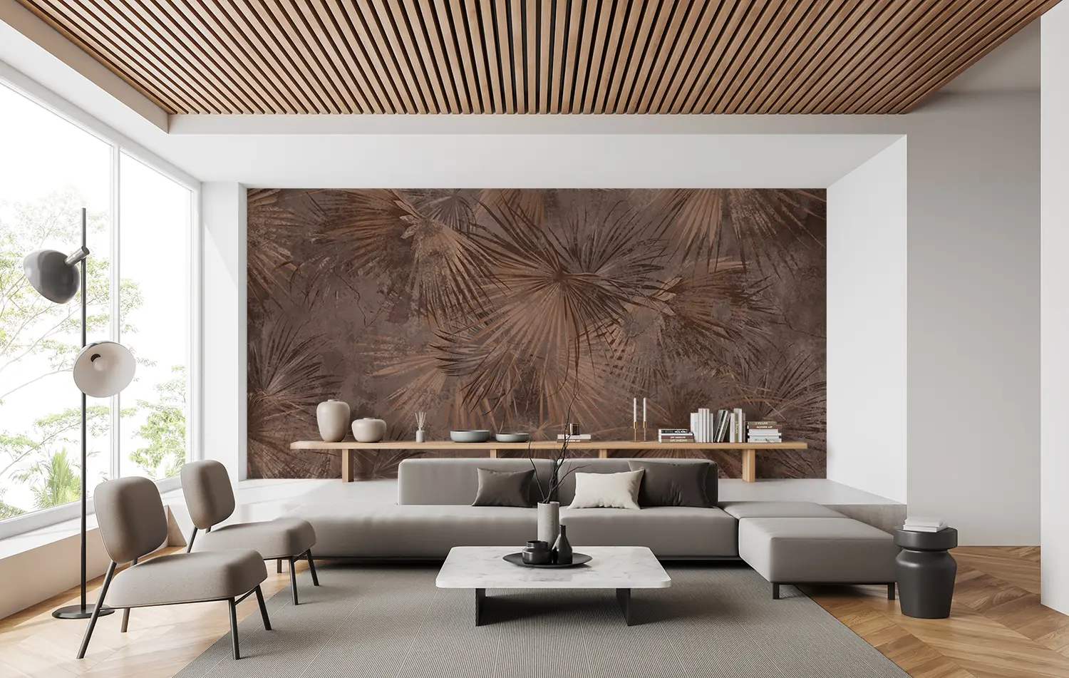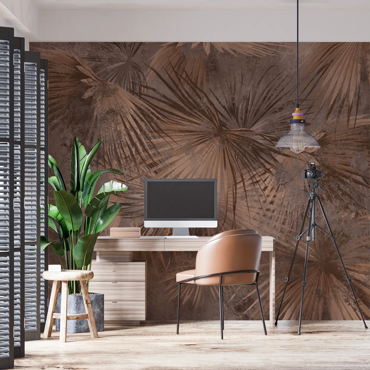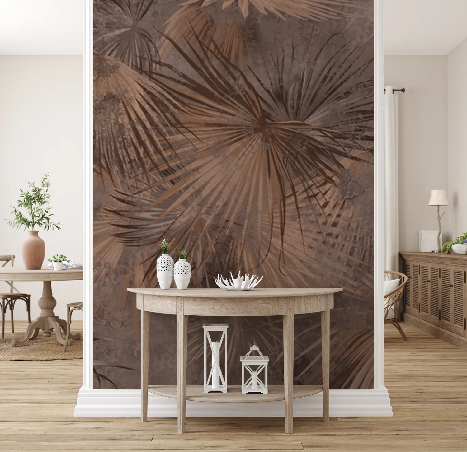 Transform your space with this stunning wall adorned with lush palm leaves. The intricate pattern brings a touch of nature indoors, creating a calming and stylish ambiance. The earthy tones of brown and green complement any home decor, adding a tropical flair to your living space. Enhance your surroundings with this beautiful and on-trend wall design.