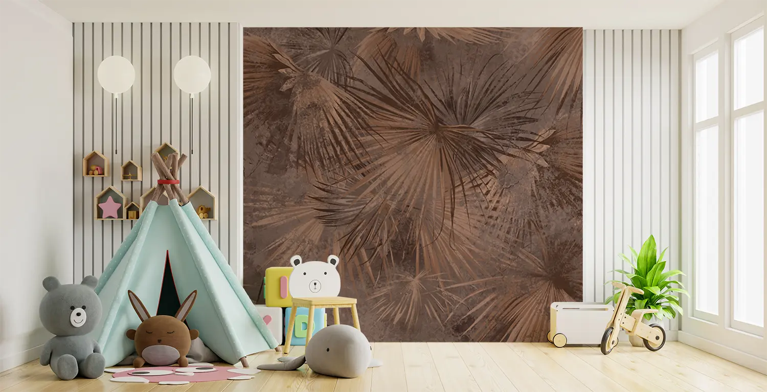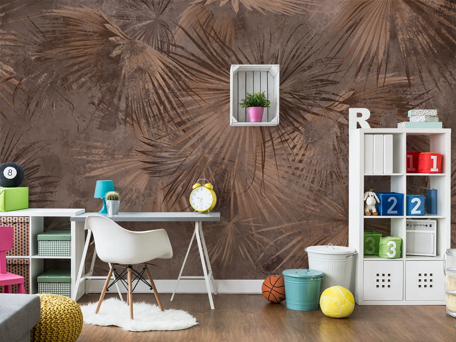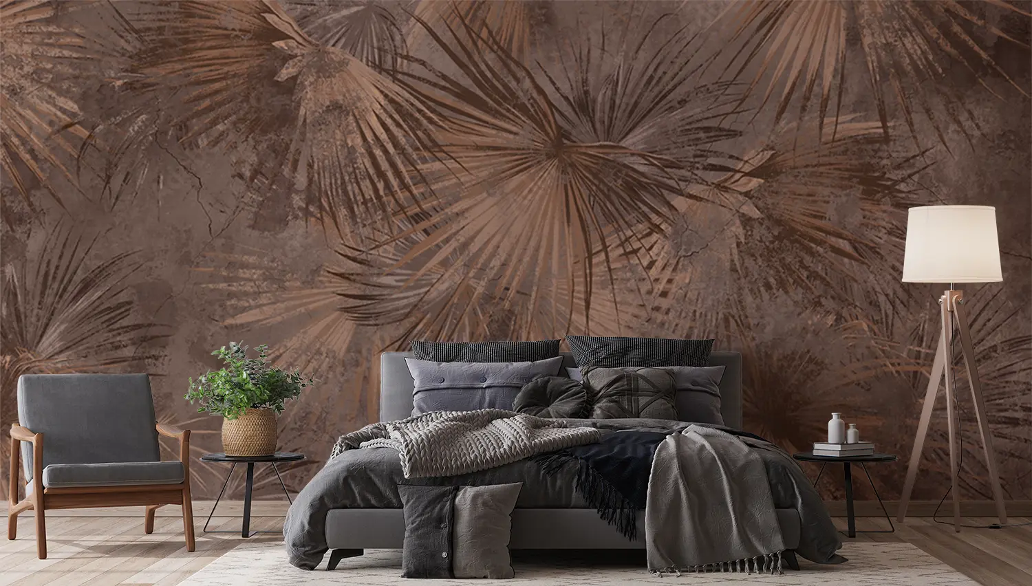 Transform your space with this stunning wall adorned with lush palm leaves. The intricate pattern brings a touch of nature indoors, creating a calming and stylish ambiance. The earthy tones of brown and green complement any home decor, adding a tropical flair to your living space. Enhance your surroundings with this beautiful and on-trend wall design.