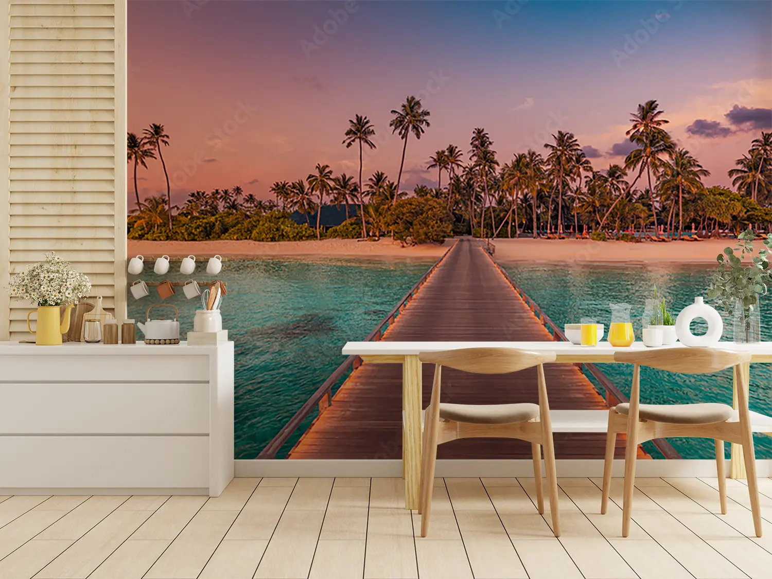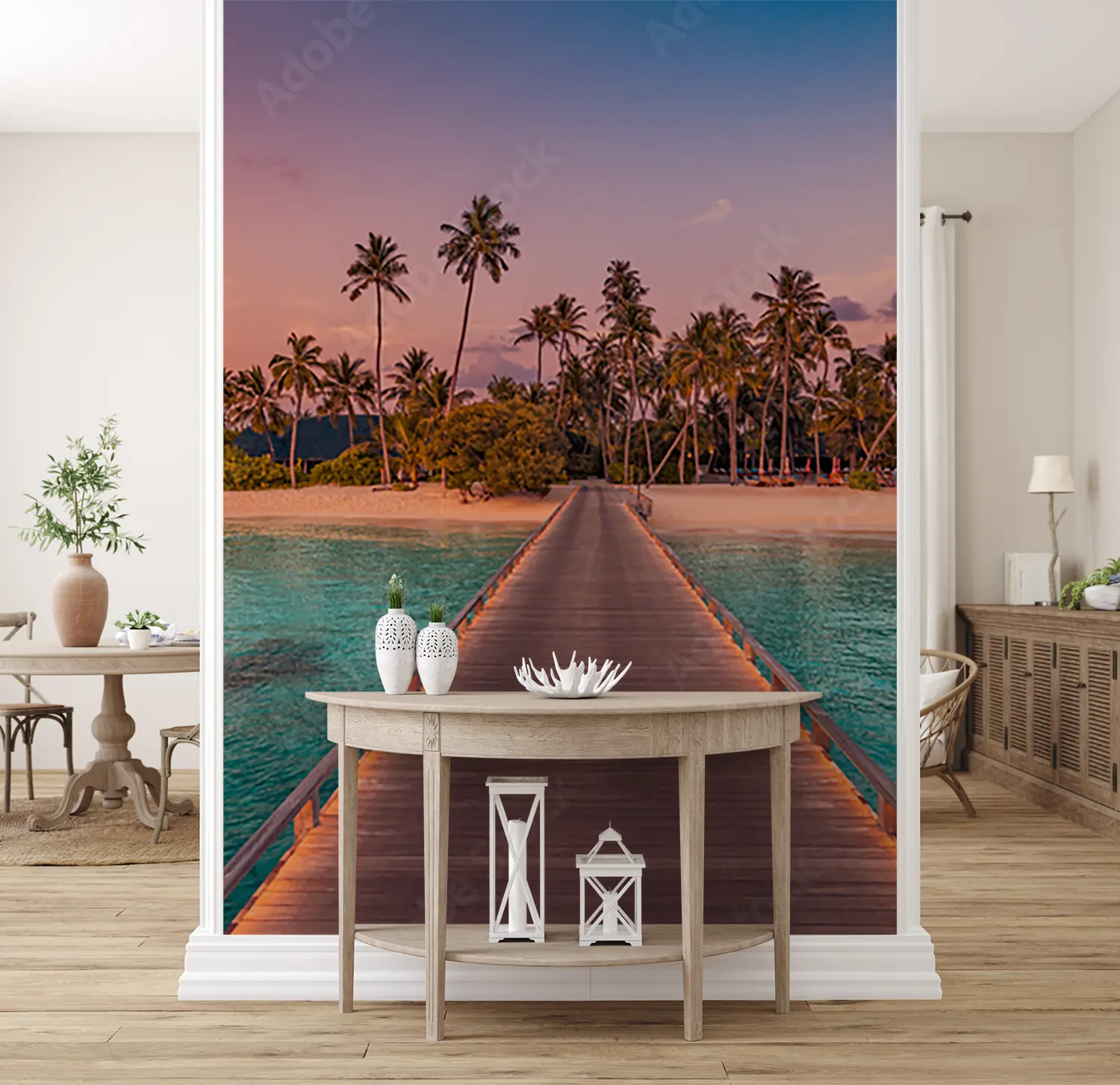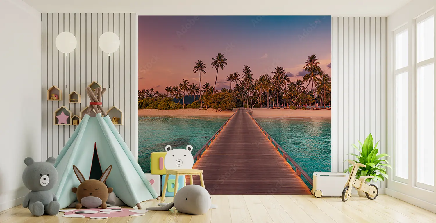 Transform your space with a stunning wall art featuring a wooden pier leading to a serene beach adorned with palm trees. This captivating piece adds a touch of exotic beauty to your home decor, creating a tranquil ambiance. Complementary colors include earthy tones like sandy beige, ocean blue, and lush green to enhance the tropical vibe. Elevate your interior with this mesmerizing scene.