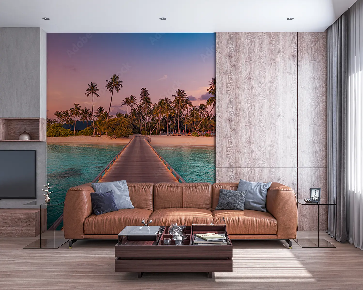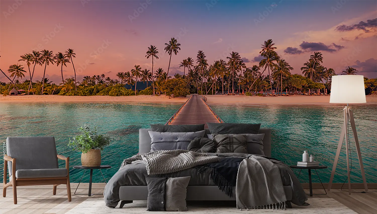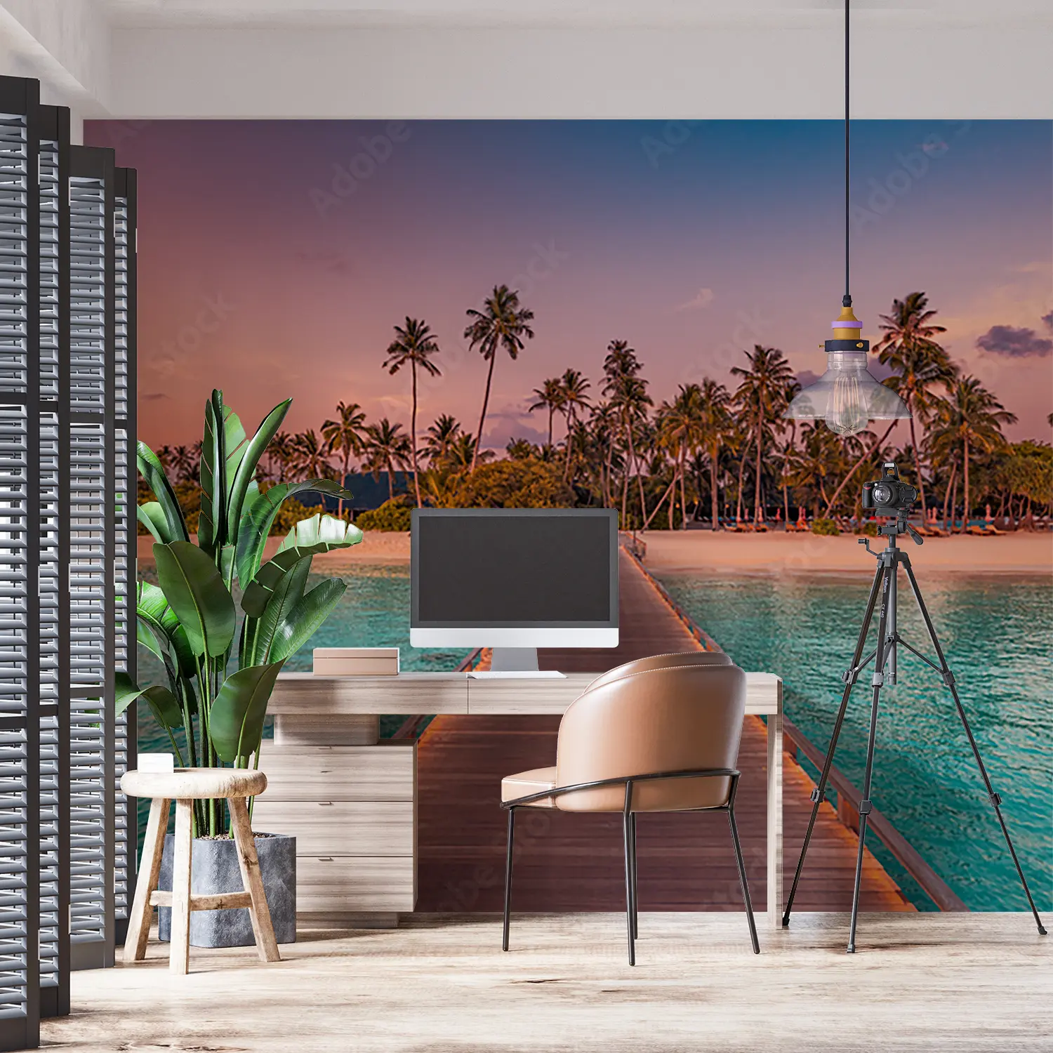 Transform your space with a stunning wall art featuring a wooden pier leading to a serene beach adorned with palm trees. This captivating piece adds a touch of exotic beauty to your home decor, creating a tranquil ambiance. Complementary colors include earthy tones like sandy beige, ocean blue, and lush green to enhance the tropical vibe. Elevate your interior with this mesmerizing scene.