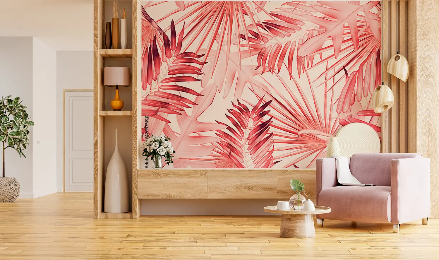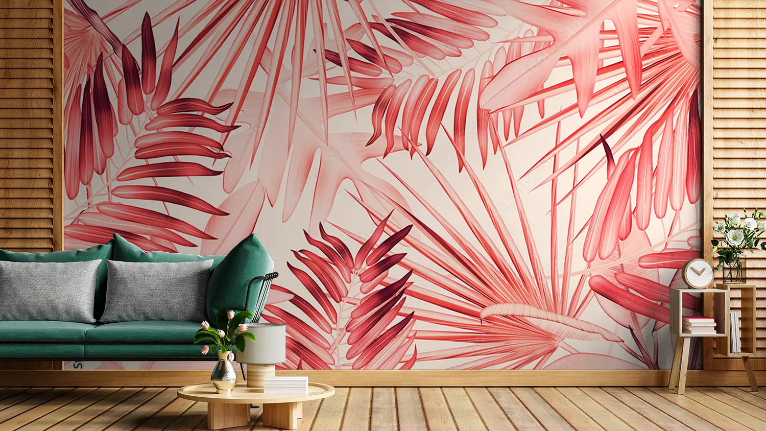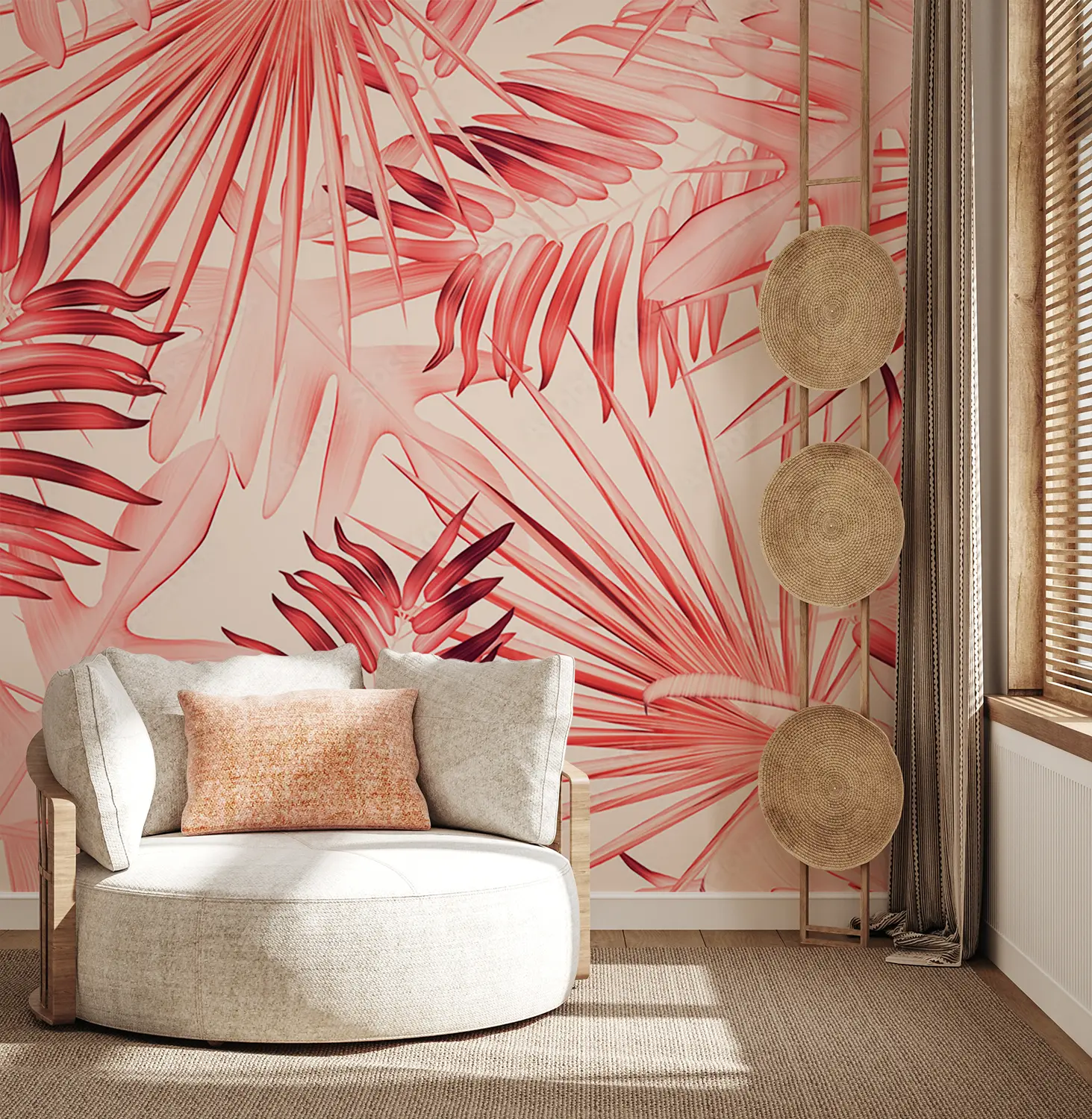 Transform your space with this vibrant pink and red tropical print featuring elegant palm leaves. Add a touch of exotic charm to your home decor with this eye-catching design. Complementary colors include shades of white, pink, and red to enhance the overall aesthetic appeal of your living space. Perfect for creating a tropical oasis in any room.