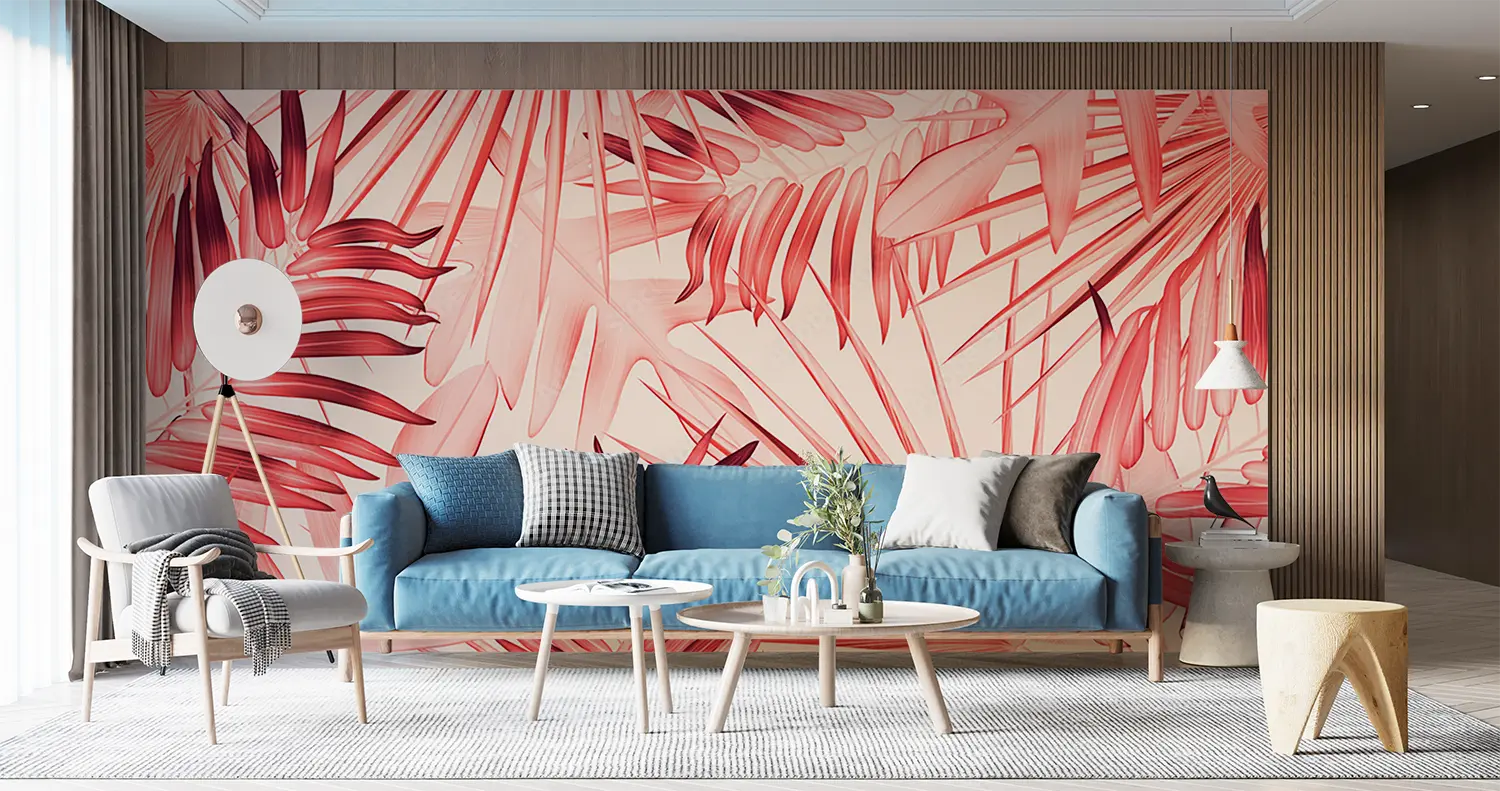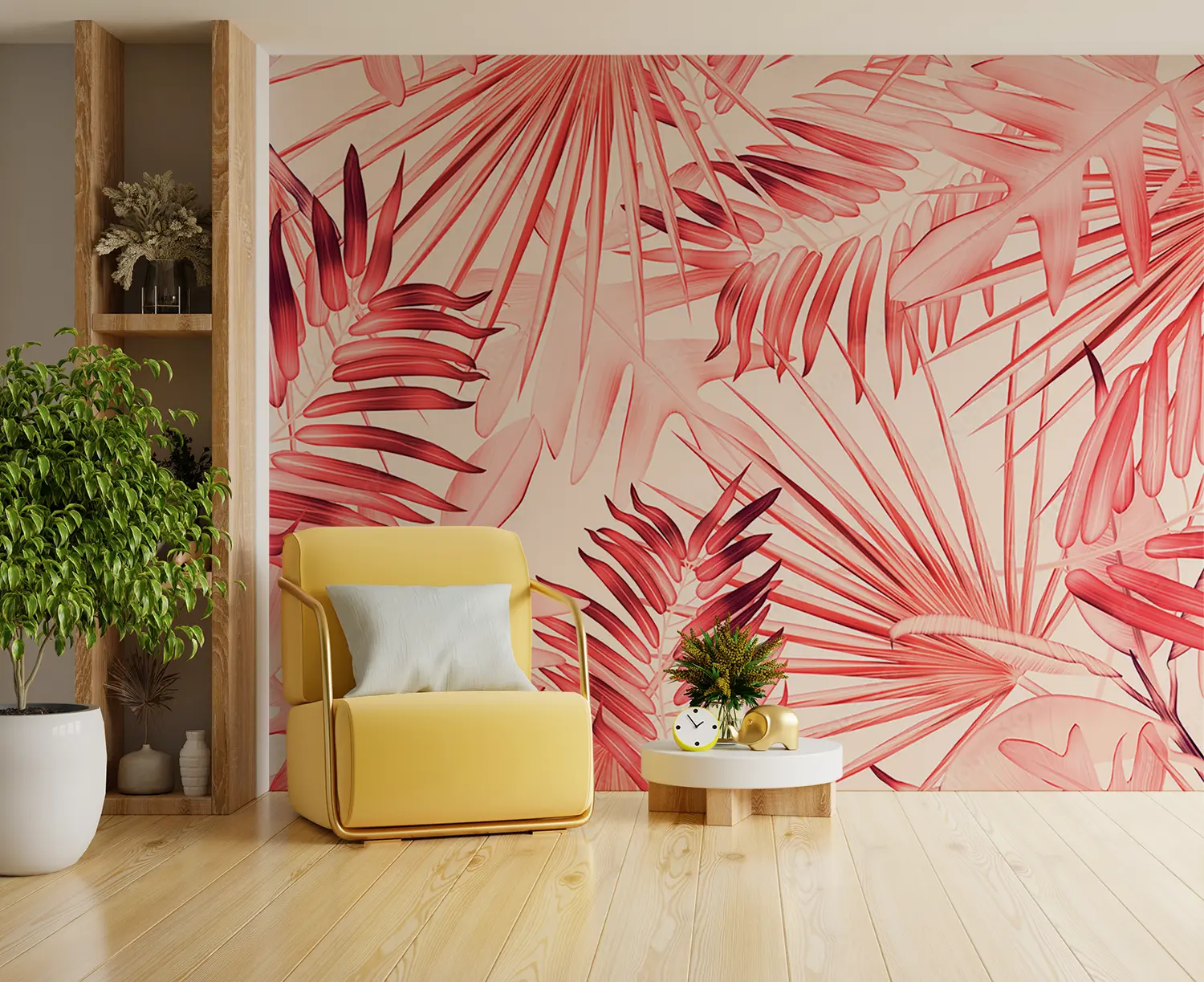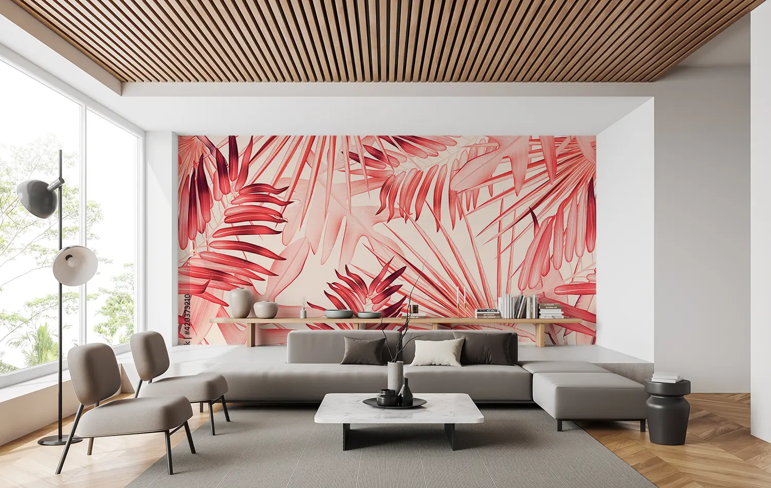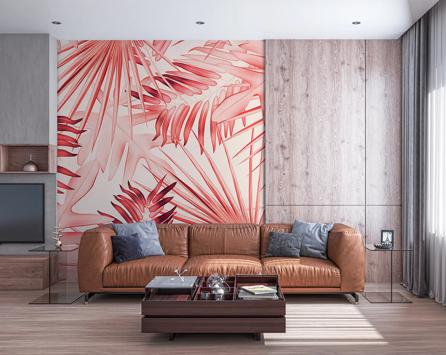 Transform your space with this vibrant pink and red tropical print featuring elegant palm leaves. Add a touch of exotic charm to your home decor with this eye-catching design. Complementary colors include shades of white, pink, and red to enhance the overall aesthetic appeal of your living space. Perfect for creating a tropical oasis in any room.