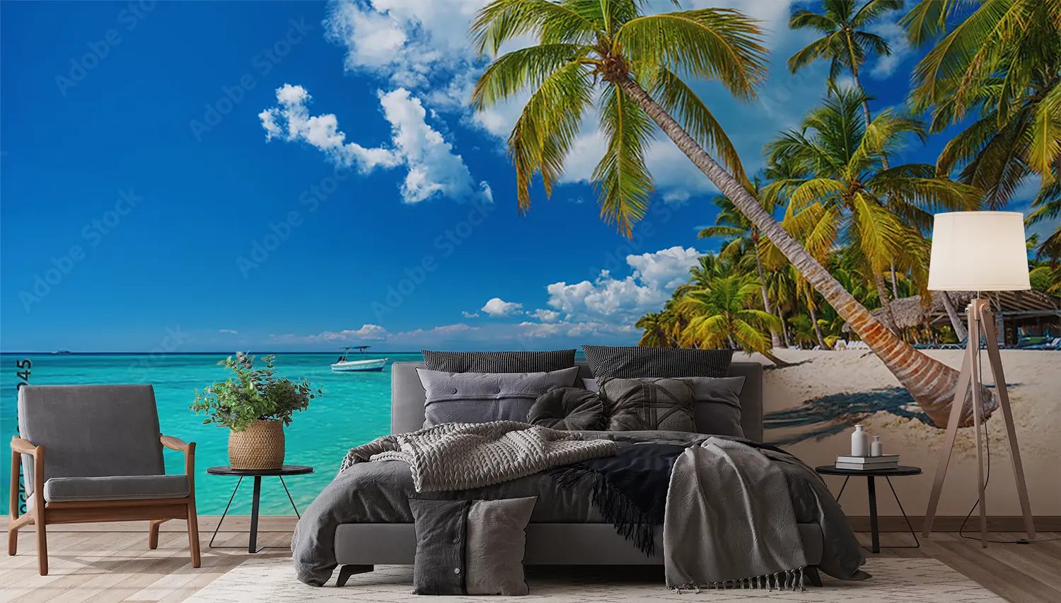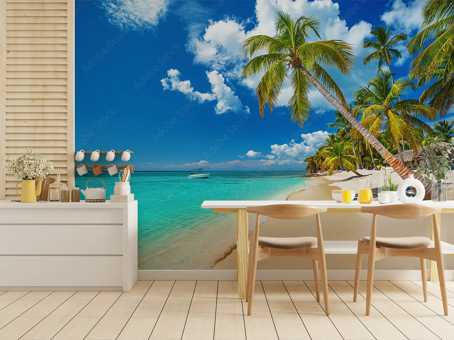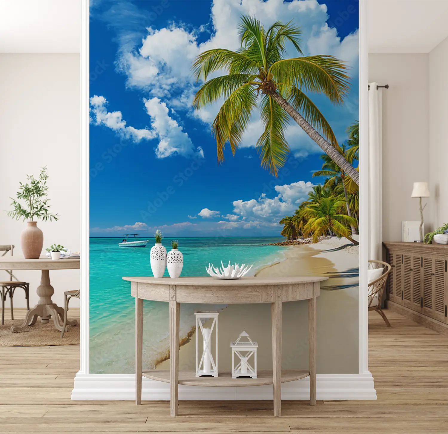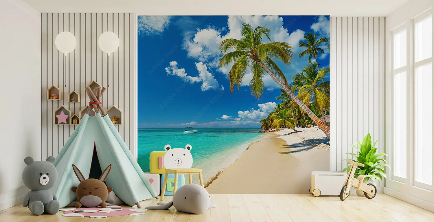 Transform your space with a stunning wall art featuring a tranquil beach scene with palm trees and a boat gently floating on crystal-clear waters. This piece exudes a sense of relaxation and serenity, perfect for enhancing your home decor. Complementary colors to consider are shades of blue, green, and sandy beige for a cohesive and inviting aesthetic.