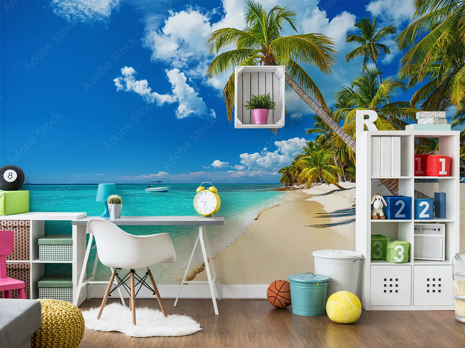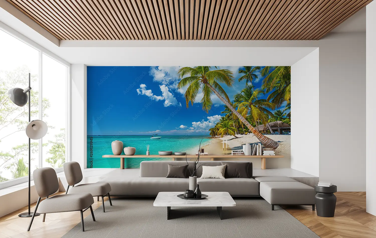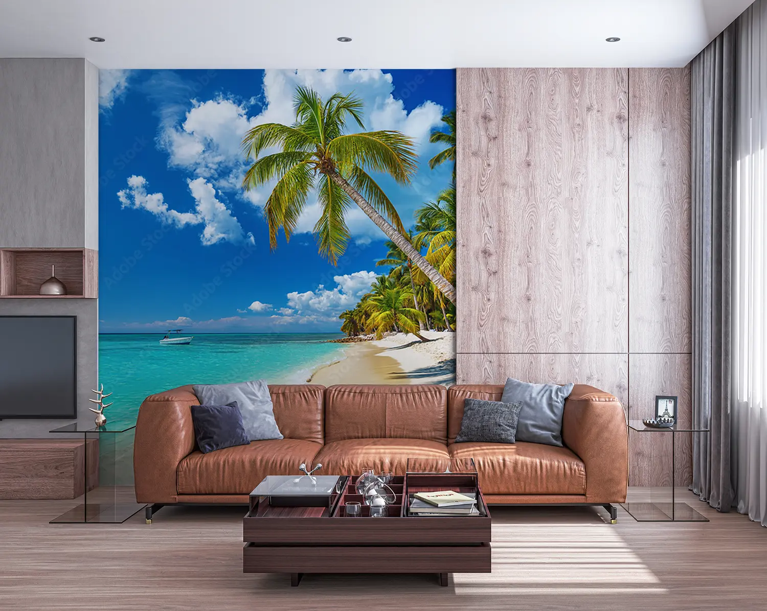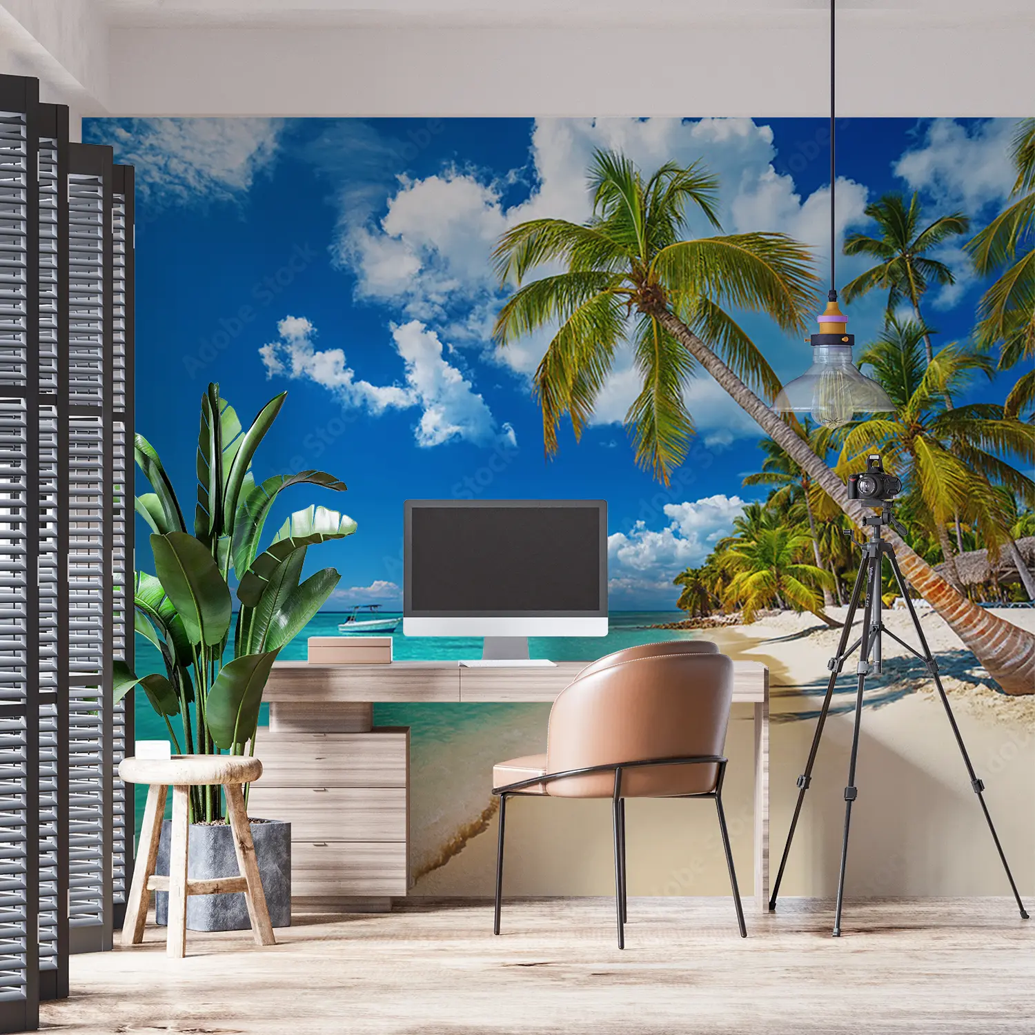 Transform your space with a stunning wall art featuring a tranquil beach scene with palm trees and a boat gently floating on crystal-clear waters. This piece exudes a sense of relaxation and serenity, perfect for enhancing your home decor. Complementary colors to consider are shades of blue, green, and sandy beige for a cohesive and inviting aesthetic.