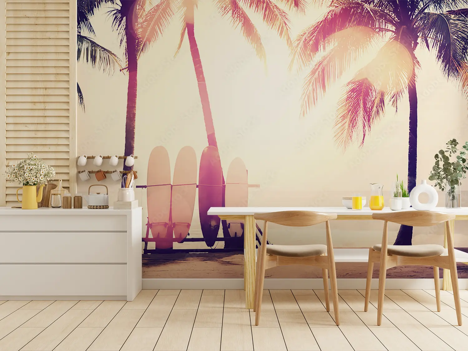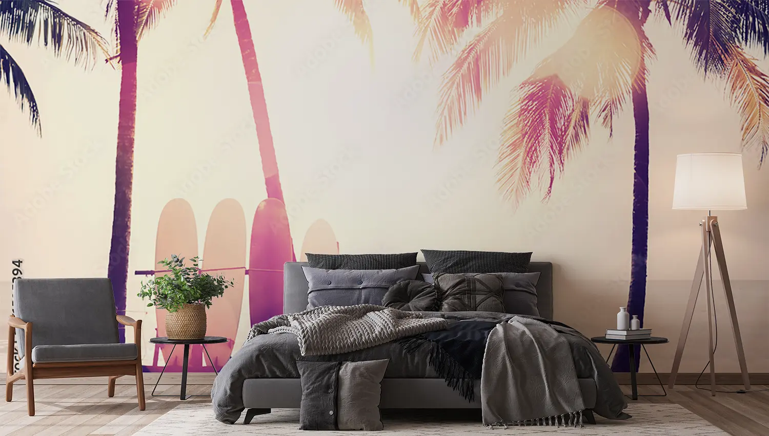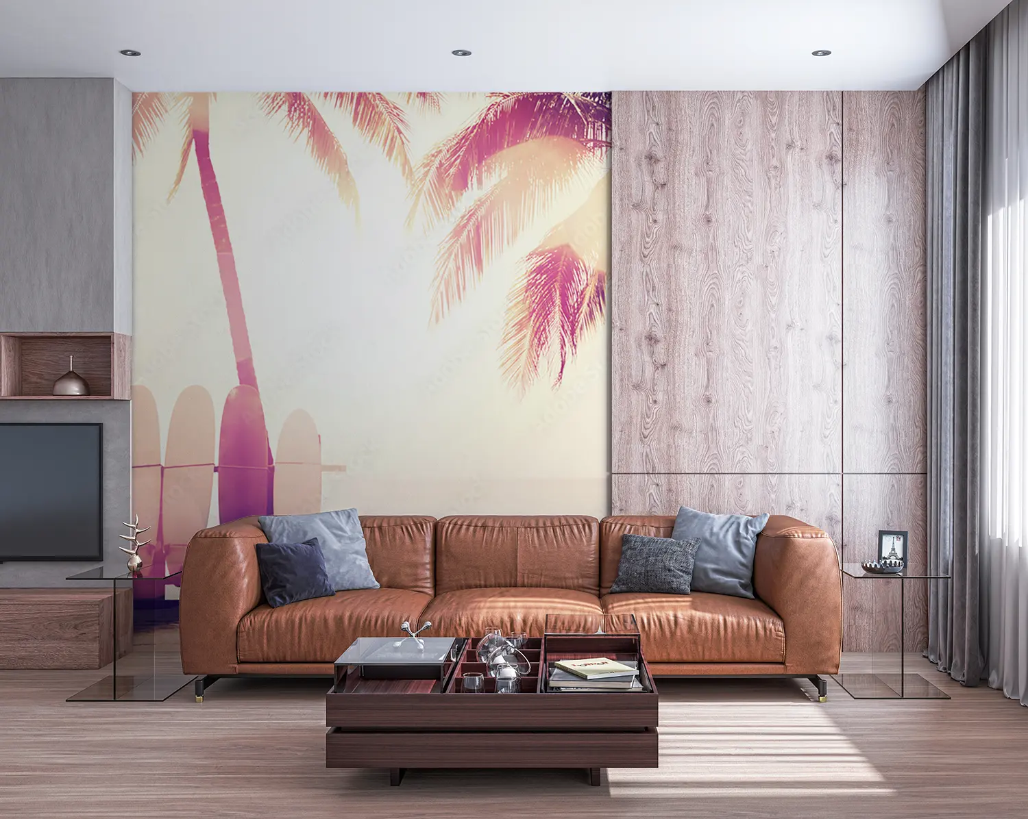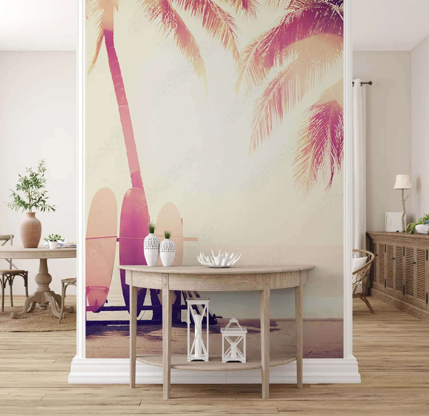 Transform your space into a serene tropical oasis with this captivating wall art featuring two surfboards resting under lush palm trees. The calming color palette of soft pinks, deep purples, and warm neutrals will bring a sense of tranquility to any room. Perfect for adding a touch of coastal charm to your home decor.