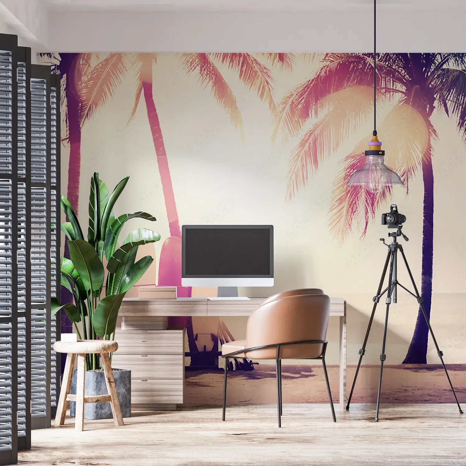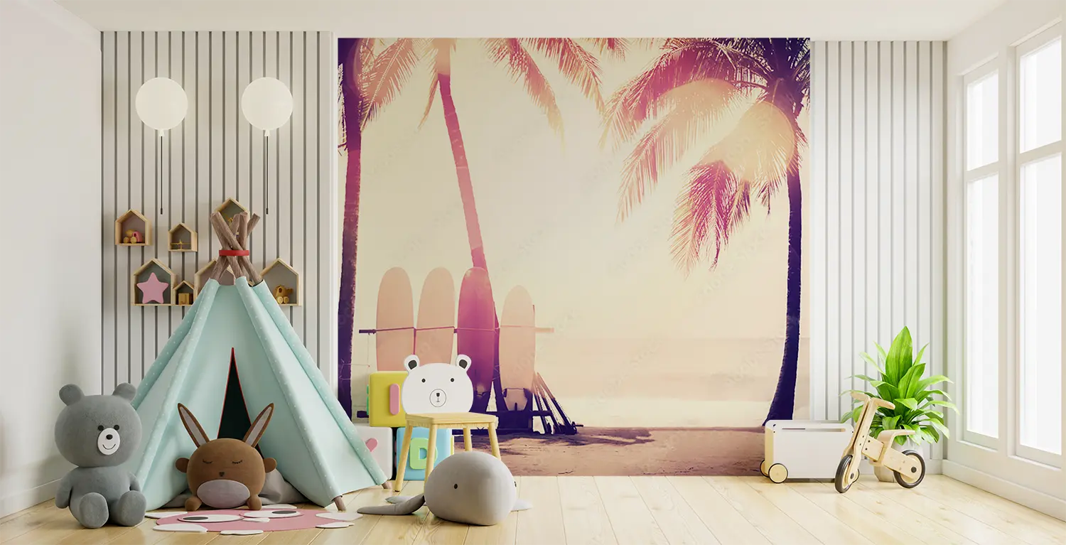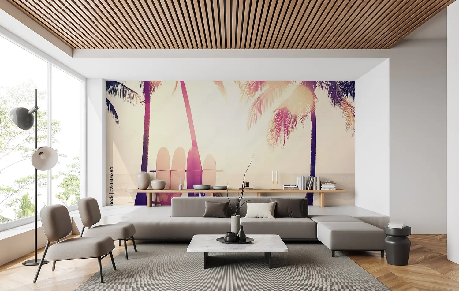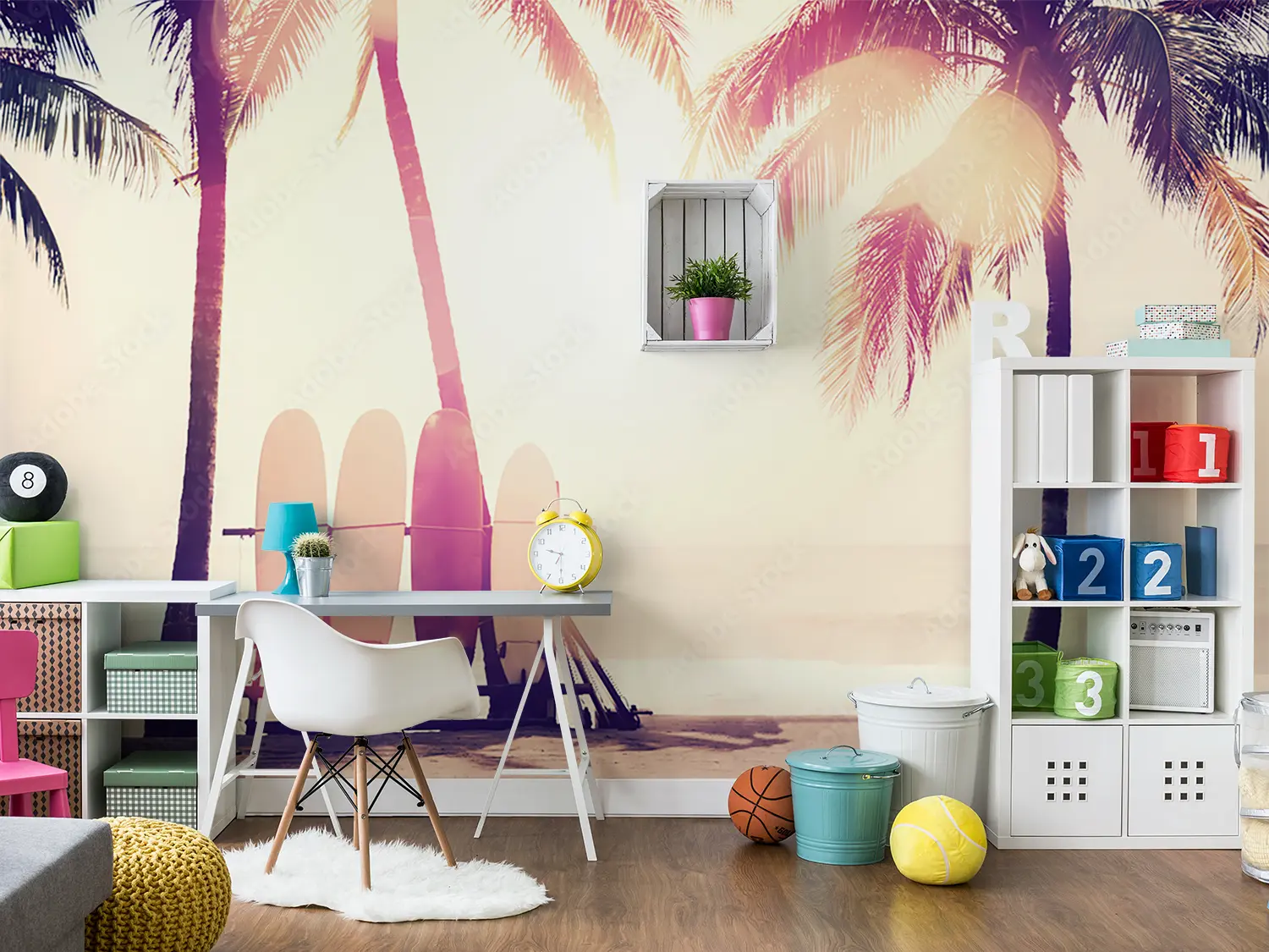 Transform your space into a serene tropical oasis with this captivating wall art featuring two surfboards resting under lush palm trees. The calming color palette of soft pinks, deep purples, and warm neutrals will bring a sense of tranquility to any room. Perfect for adding a touch of coastal charm to your home decor.
