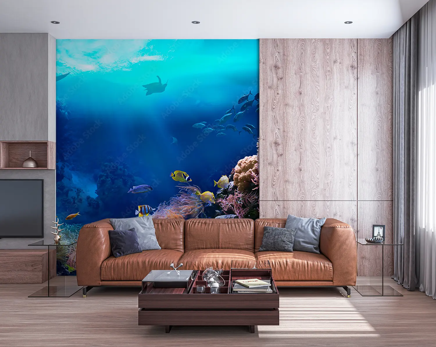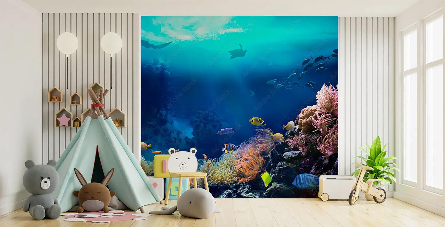 Transform your space with this stunning underwater scene featuring a group of colorful fish swimming in a vibrant aquarium. The intricate details and vibrant colors will add a touch of tranquility and elegance to your home decor. Complementary colors like shades of blue, pink, and coral will further enhance the aesthetic appeal of your living space.