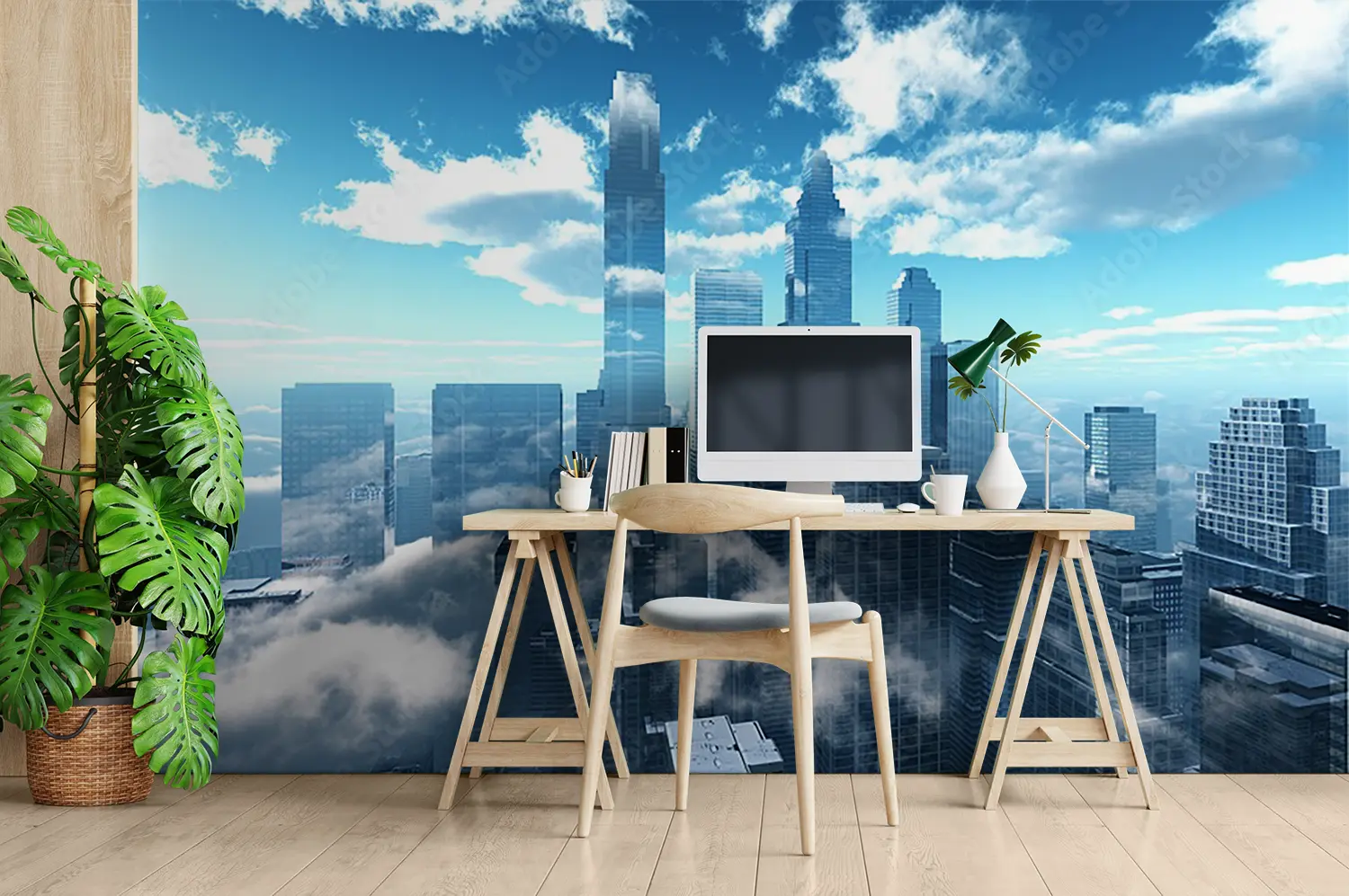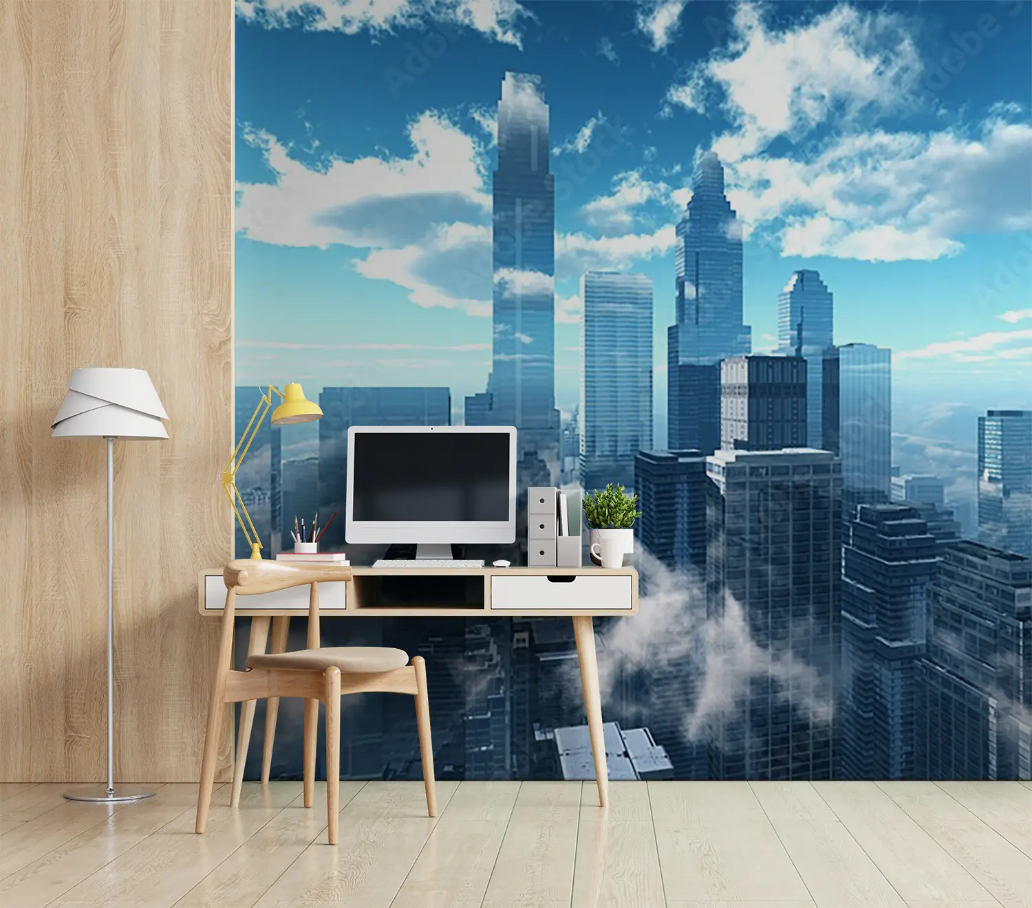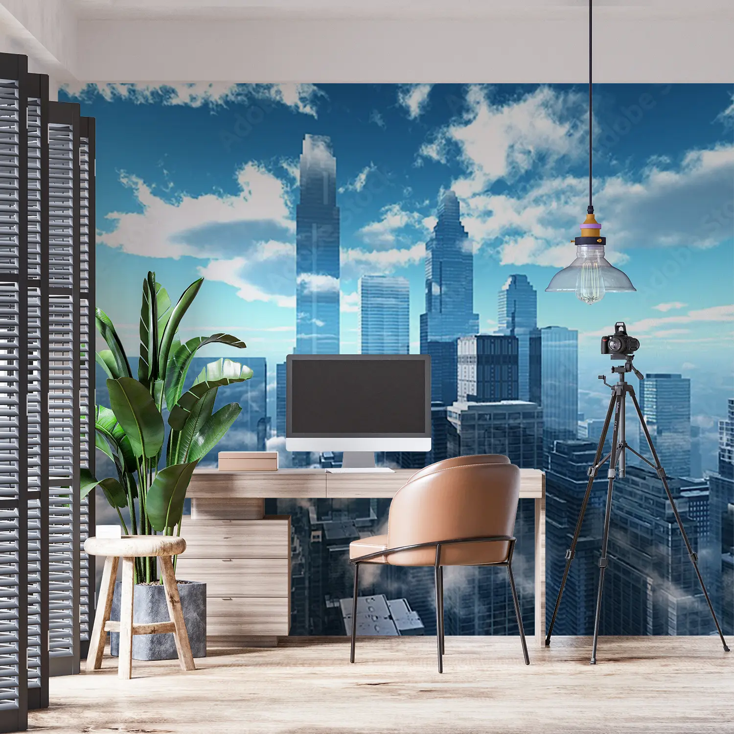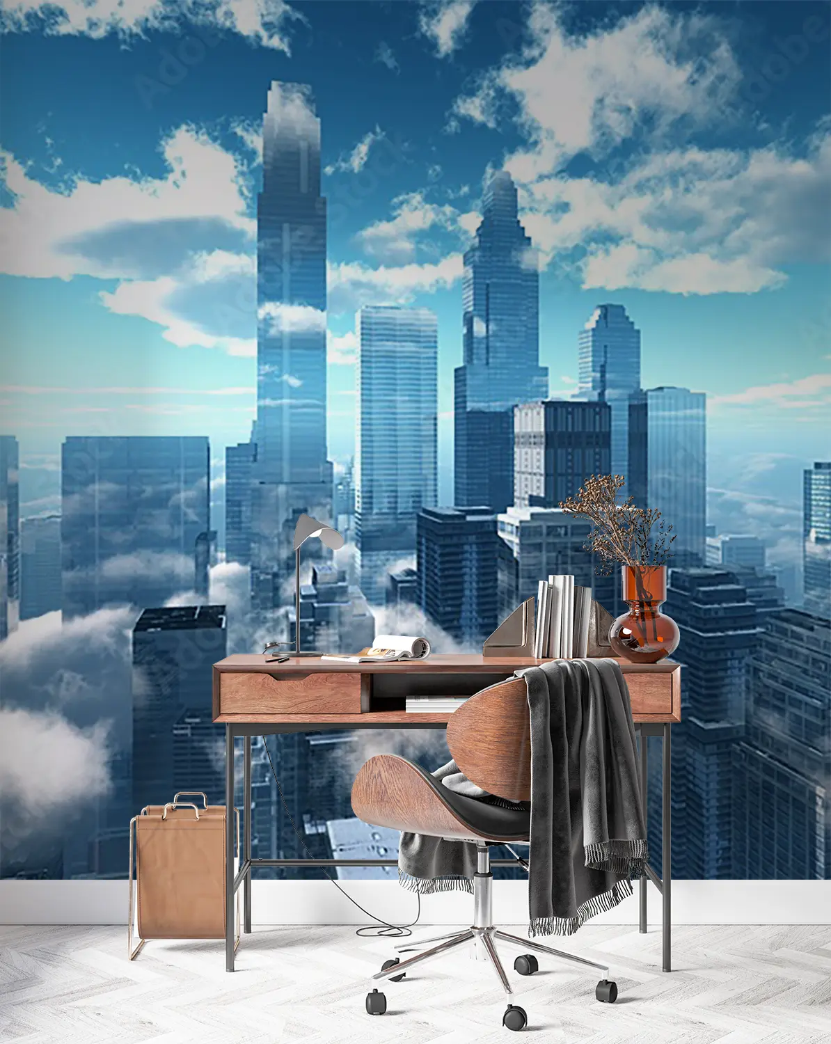 Transform your space with the captivating beauty of a city skyline featuring towering skyscrapers and fluffy clouds against a serene sky. This wall art adds a contemporary touch to any room, complementing modern home decor effortlessly. The calming shades of blue, white, and grey in the image can be paired with accents of navy, silver, and light blue for a cohesive look.