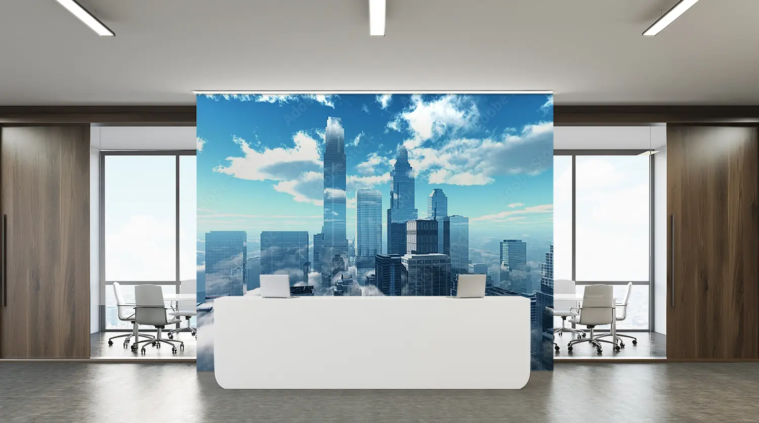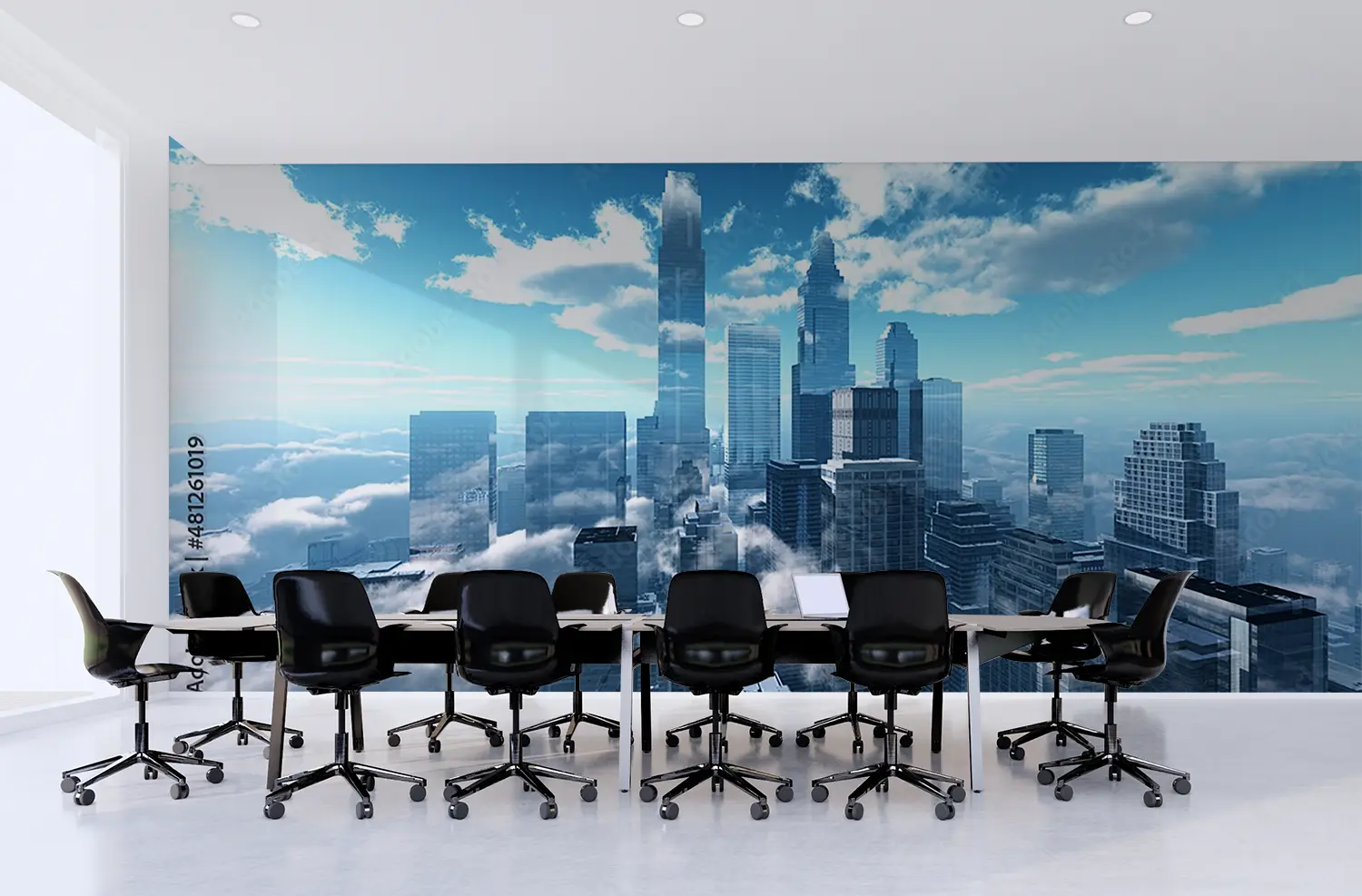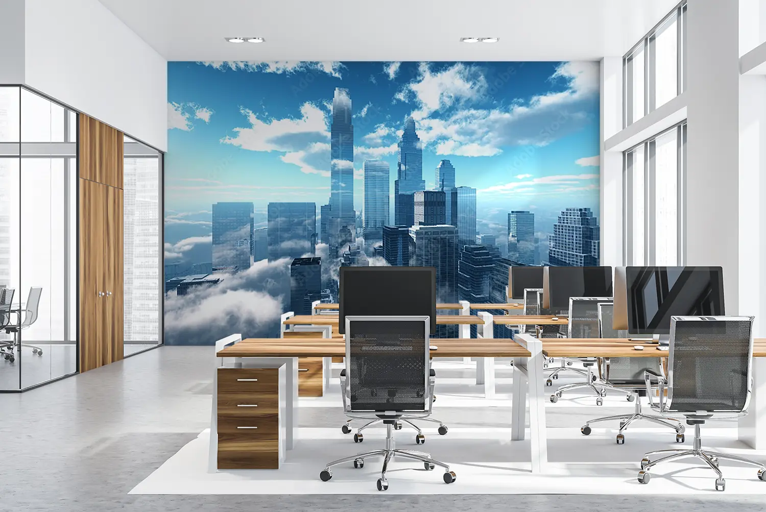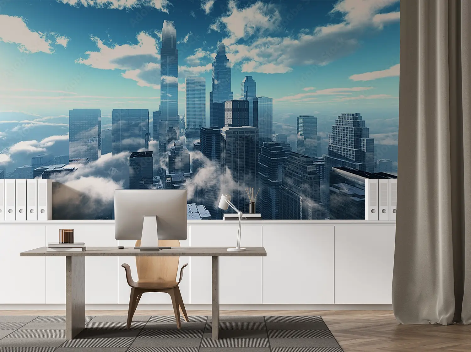 Transform your space with the captivating beauty of a city skyline featuring towering skyscrapers and fluffy clouds against a serene sky. This wall art adds a contemporary touch to any room, complementing modern home decor effortlessly. The calming shades of blue, white, and grey in the image can be paired with accents of navy, silver, and light blue for a cohesive look.