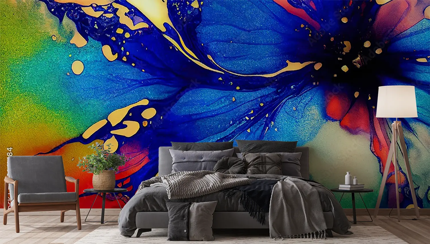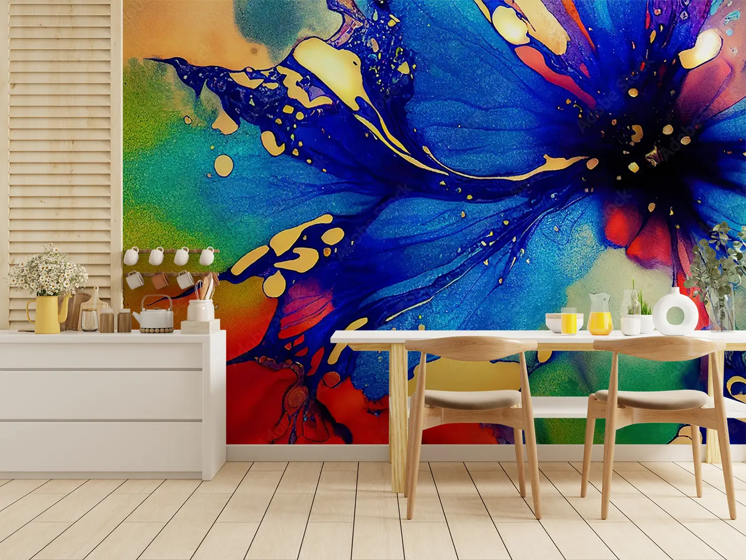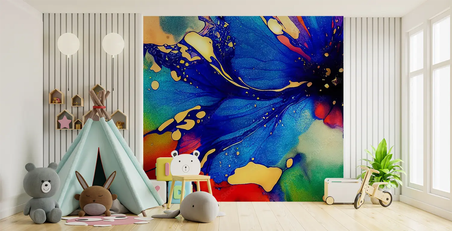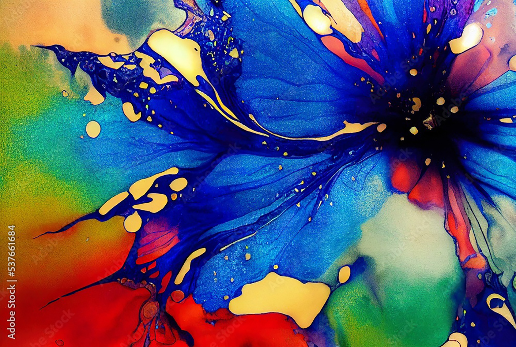 Elevate your space with this stunning painting of a blue flower with red and yellow petals. Its vibrant colors and intricate details will add a pop of color and nature-inspired beauty to any room. Complementary colors like green, yellow, and deep red will further enhance the aesthetic appeal of your home decor.