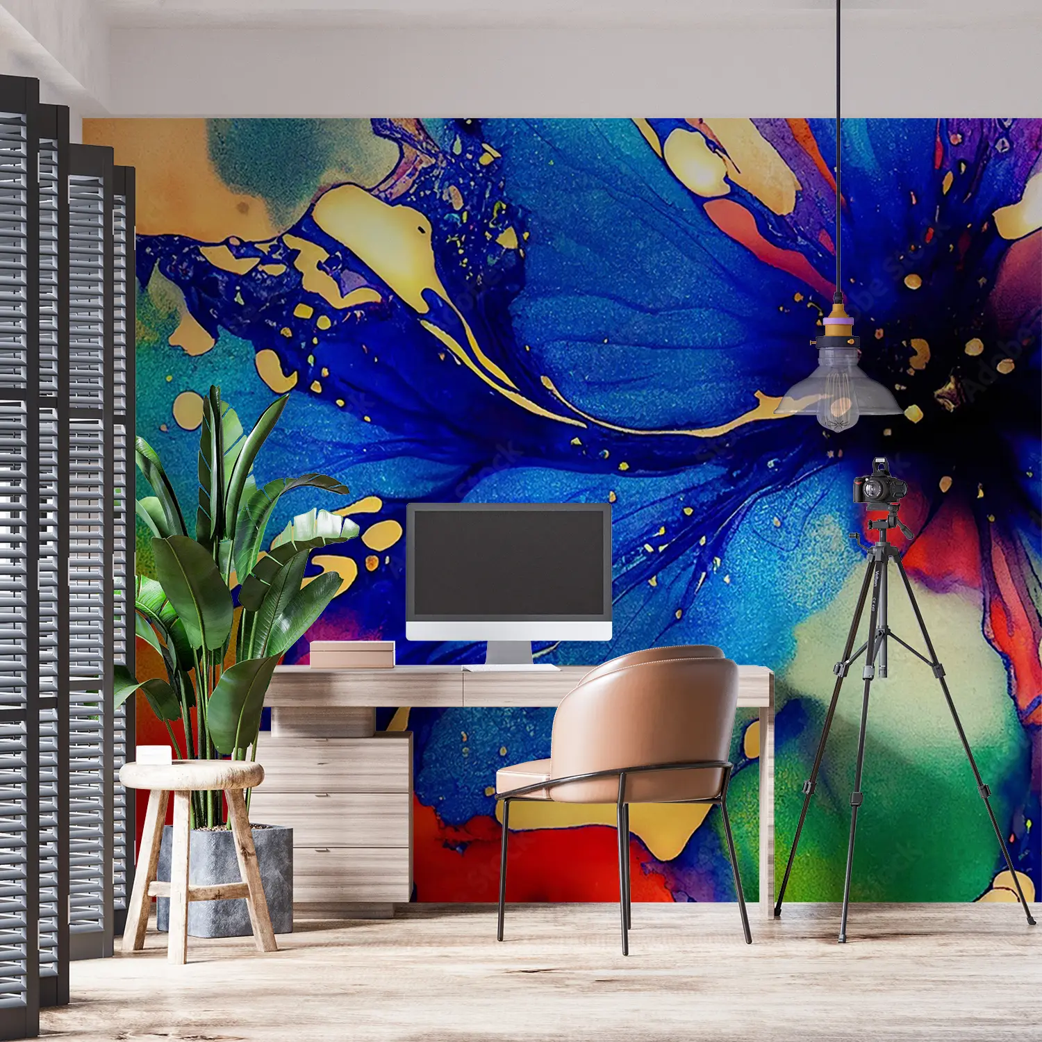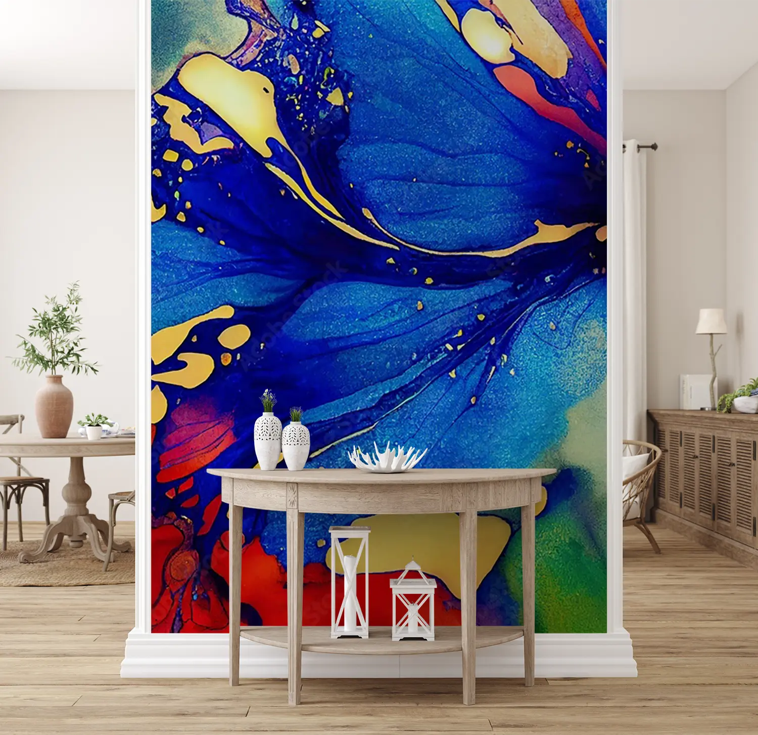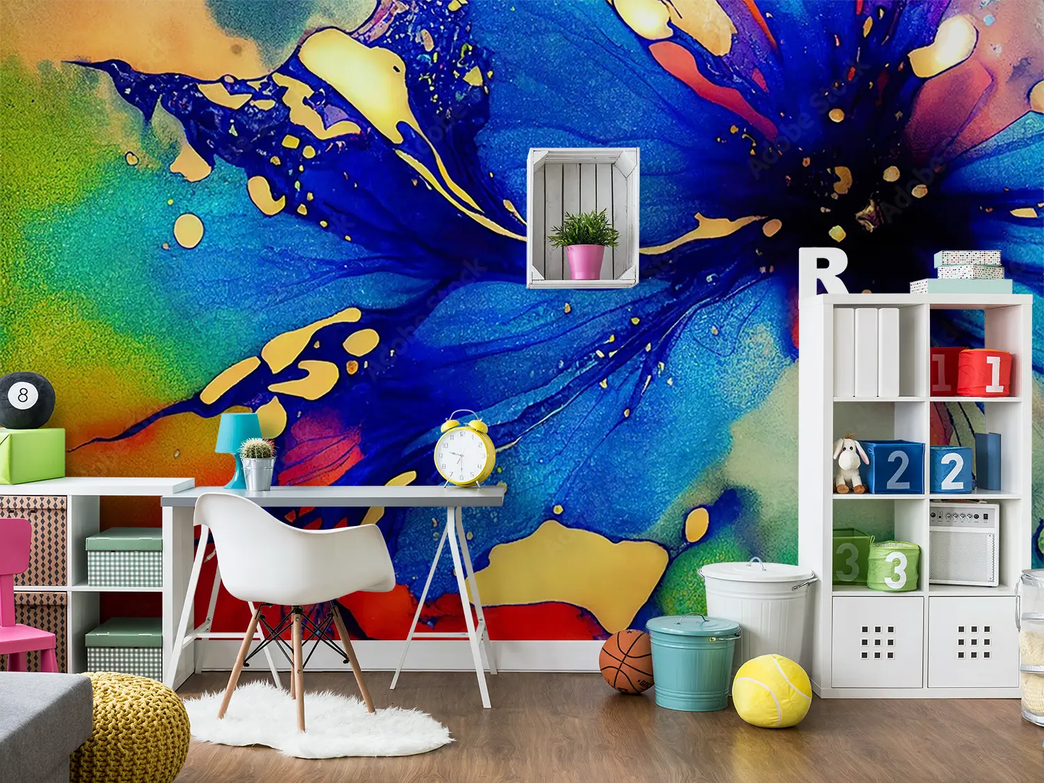 Elevate your space with this stunning painting of a blue flower with red and yellow petals. Its vibrant colors and intricate details will add a pop of color and nature-inspired beauty to any room. Complementary colors like green, yellow, and deep red will further enhance the aesthetic appeal of your home decor.