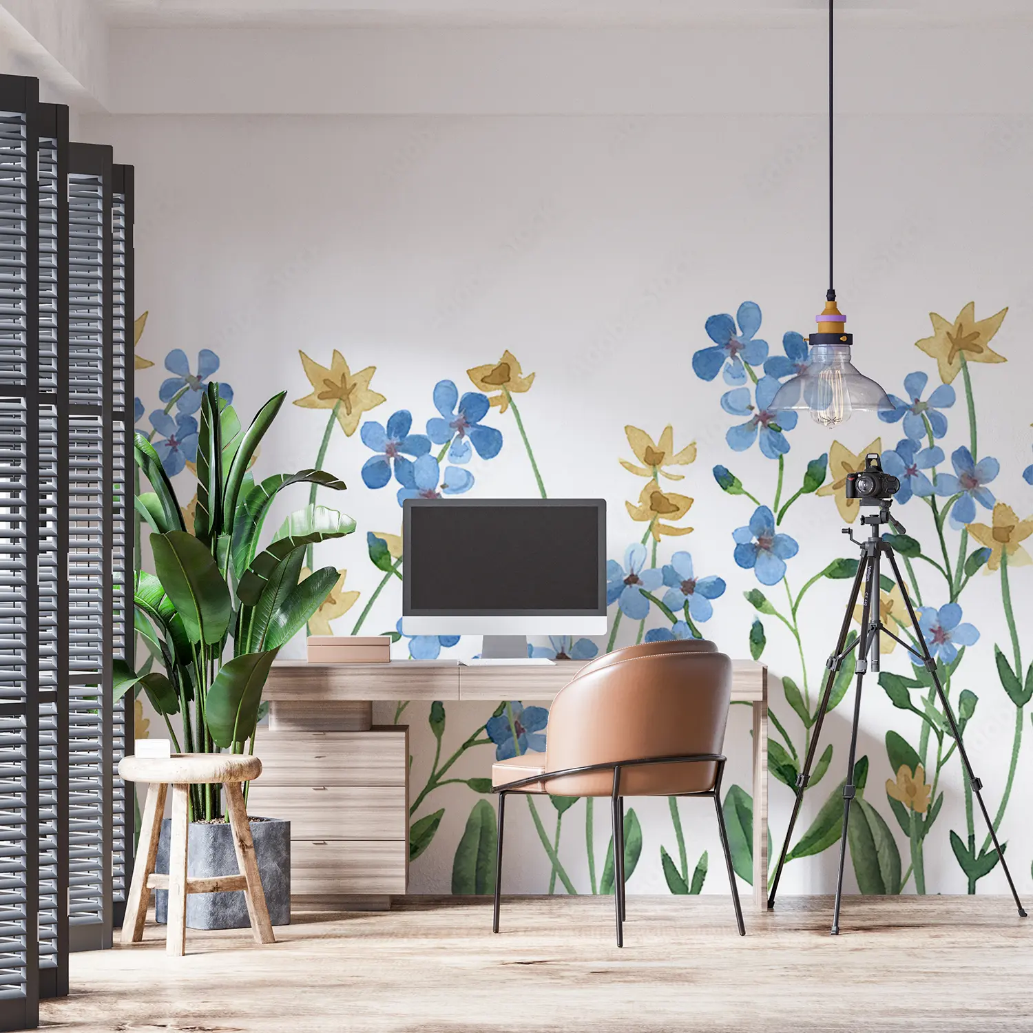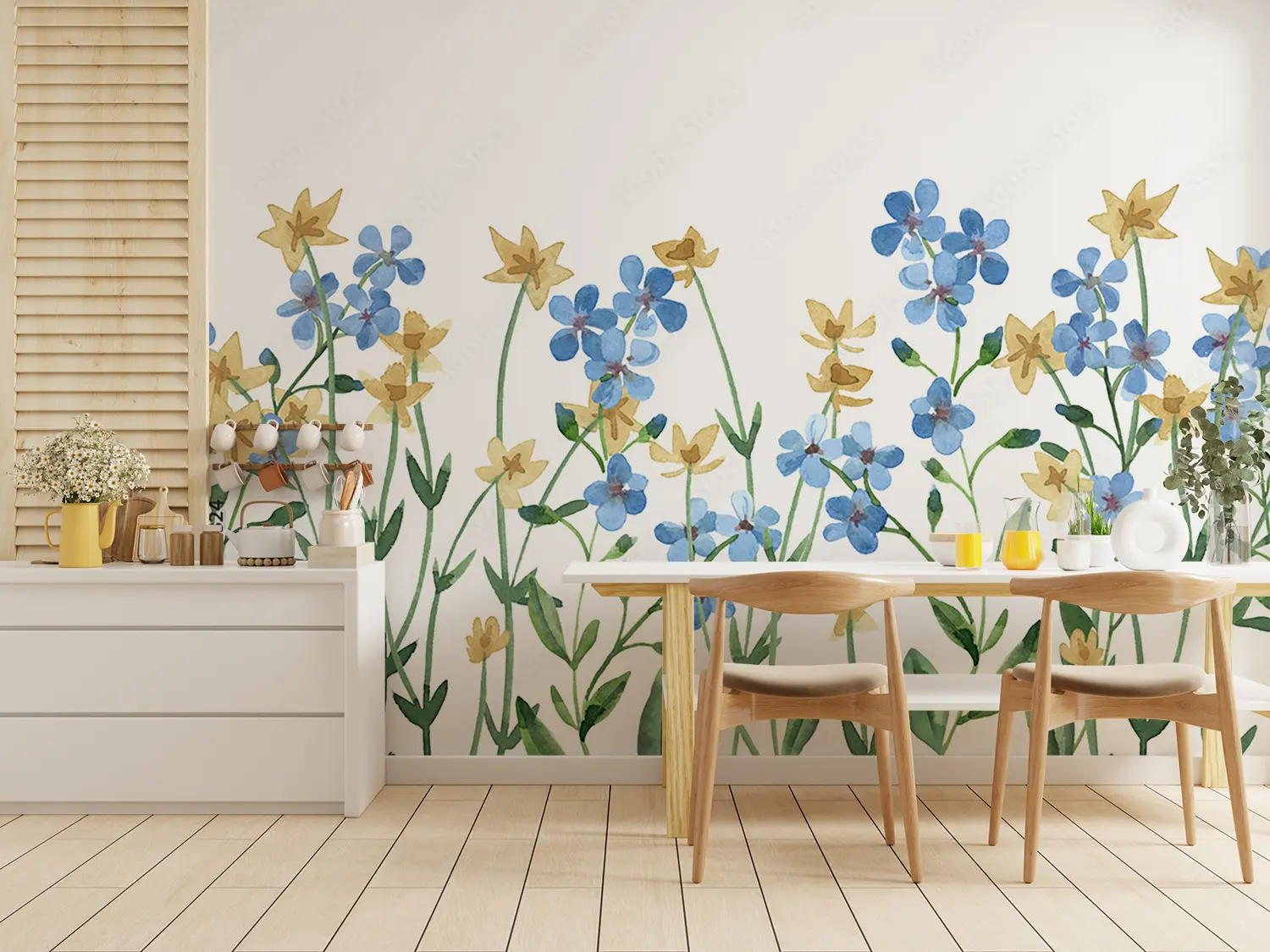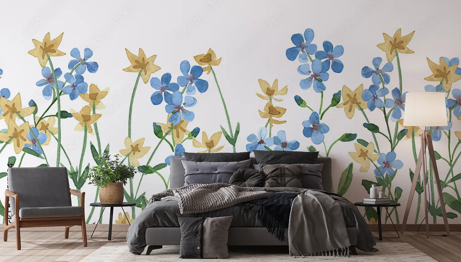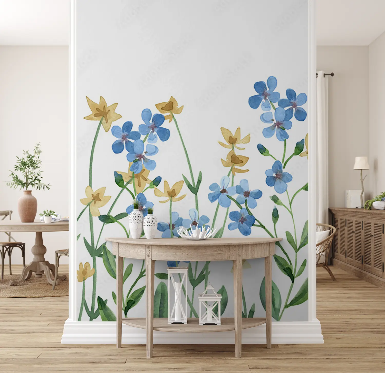 Transform your living space with a stunning watercolor painting of a field bursting with blue and yellow flowers. This captivating artwork will add a touch of nature's beauty to your home decor, creating a serene and inviting atmosphere. Complementary colors like green, white, and soft gray will enhance the overall aesthetic appeal of your space.
