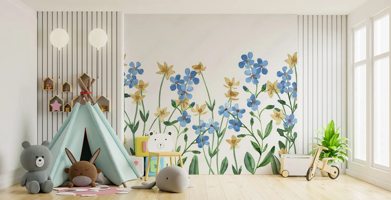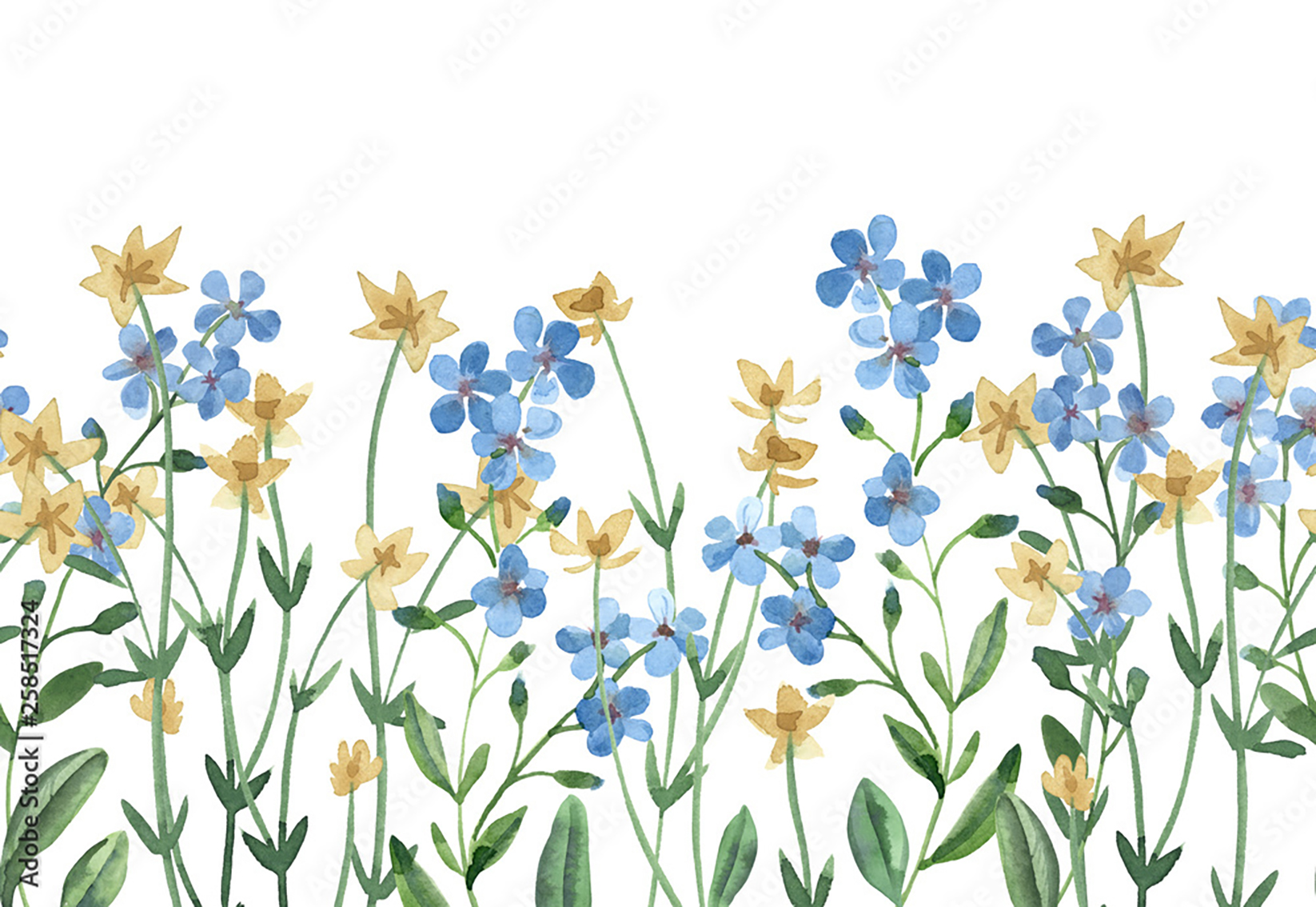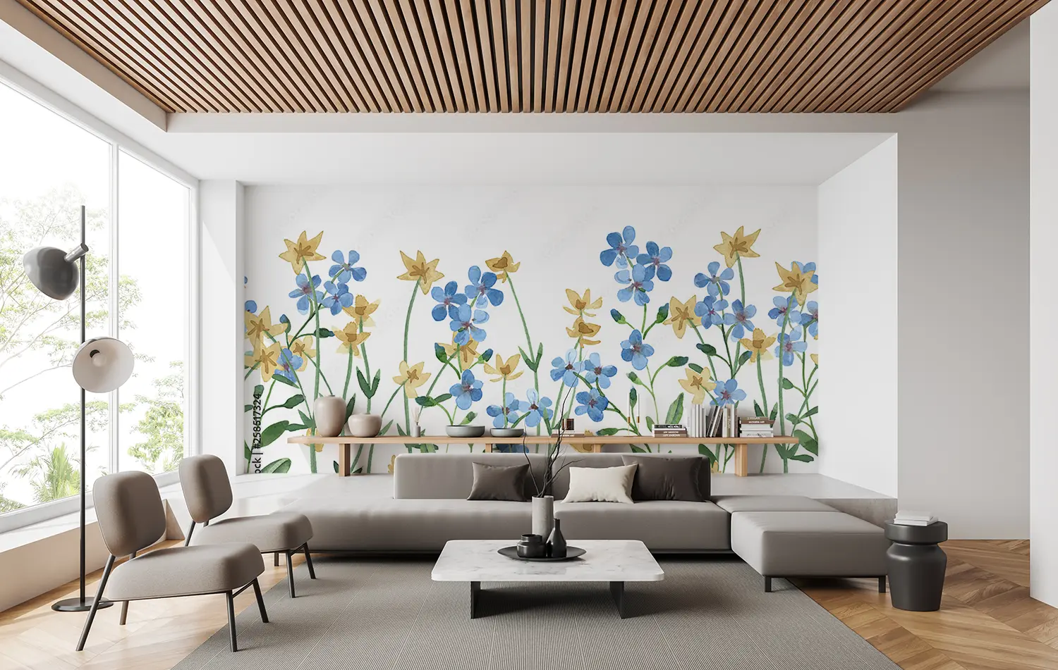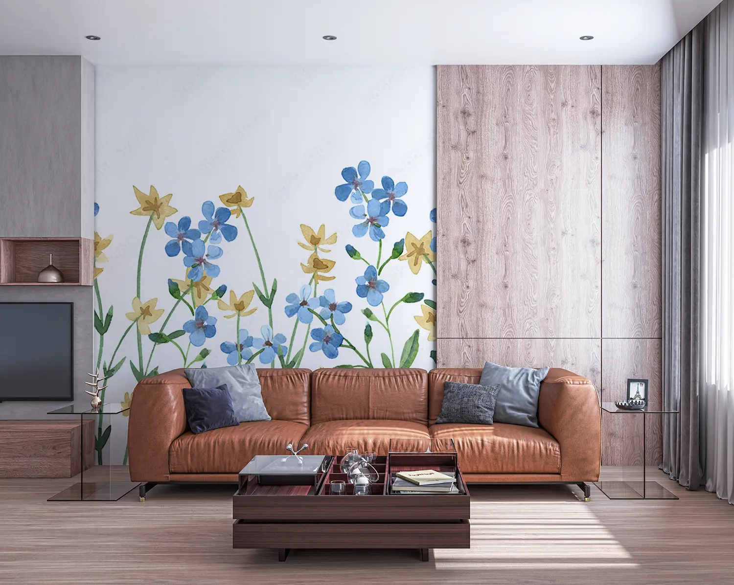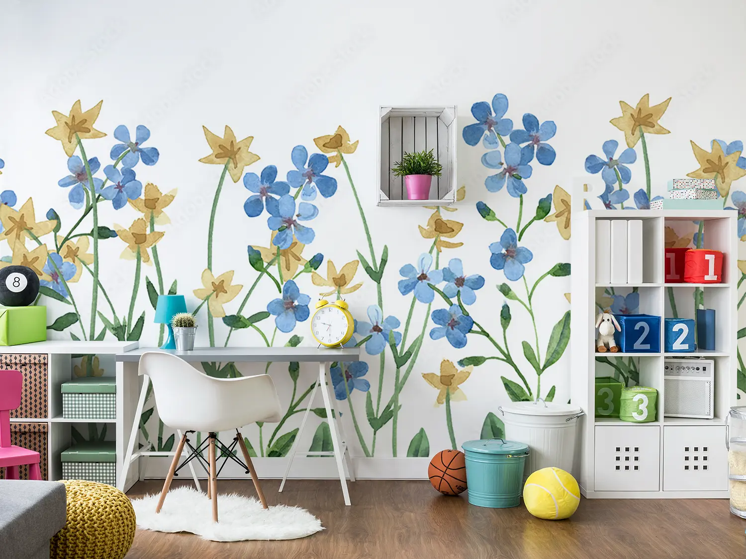 Transform your living space with a stunning watercolor painting of a field bursting with blue and yellow flowers. This captivating artwork will add a touch of nature's beauty to your home decor, creating a serene and inviting atmosphere. Complementary colors like green, white, and soft gray will enhance the overall aesthetic appeal of your space.