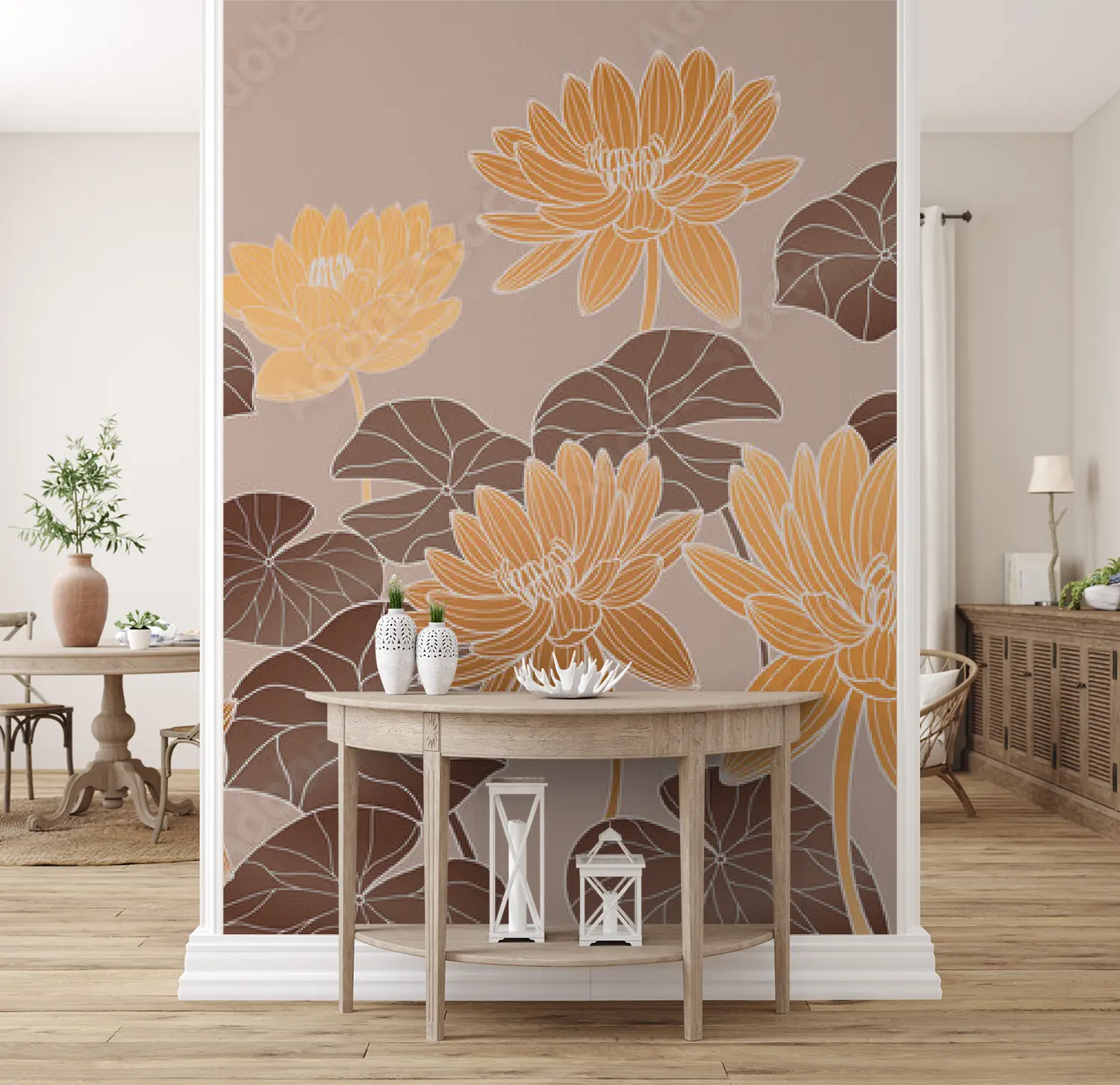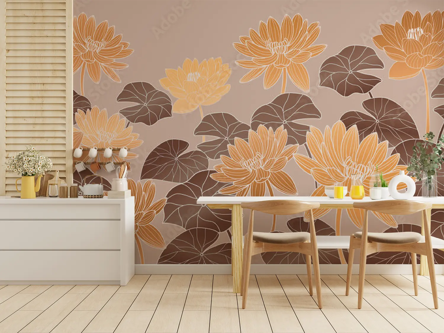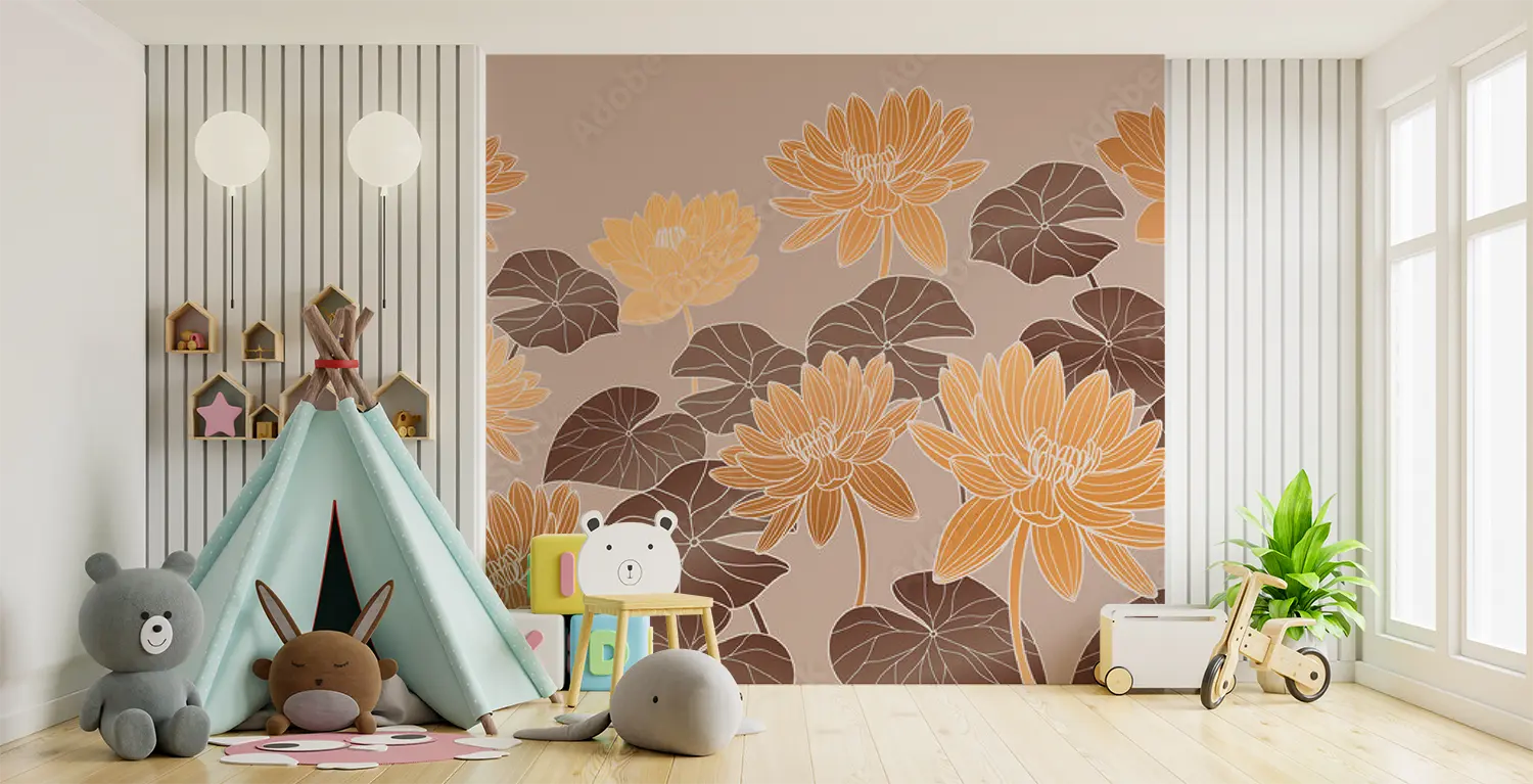 Transform your living space with this stunning floral masterpiece, featuring a beautiful array of orange and yellow flowers on a beige background. The intricate pattern and colorful design add a touch of elegance to any room. Complementary colors to consider for your decor include warm tones like brown, orange, and yellow. Bring nature indoors with this captivating wall art.