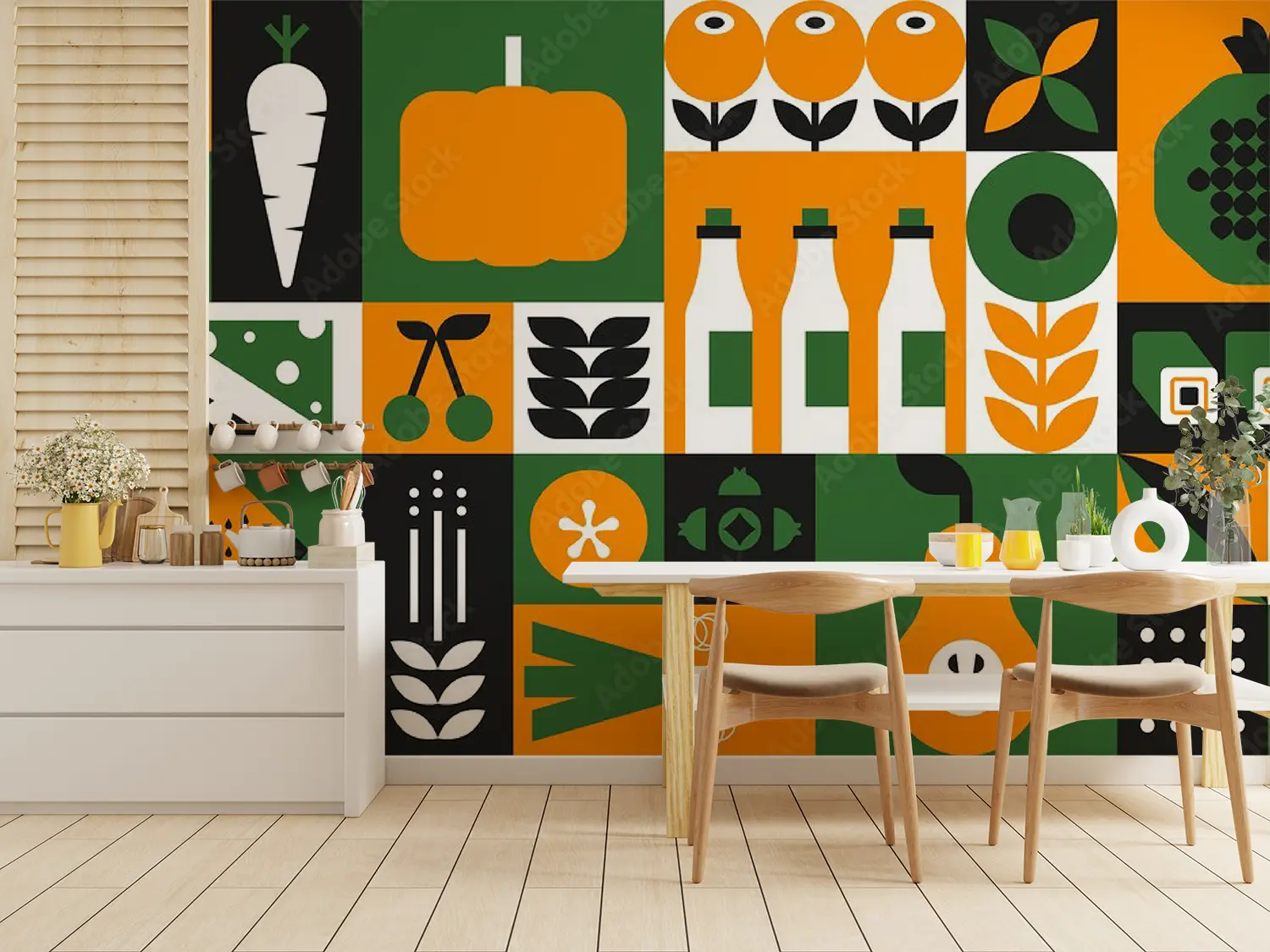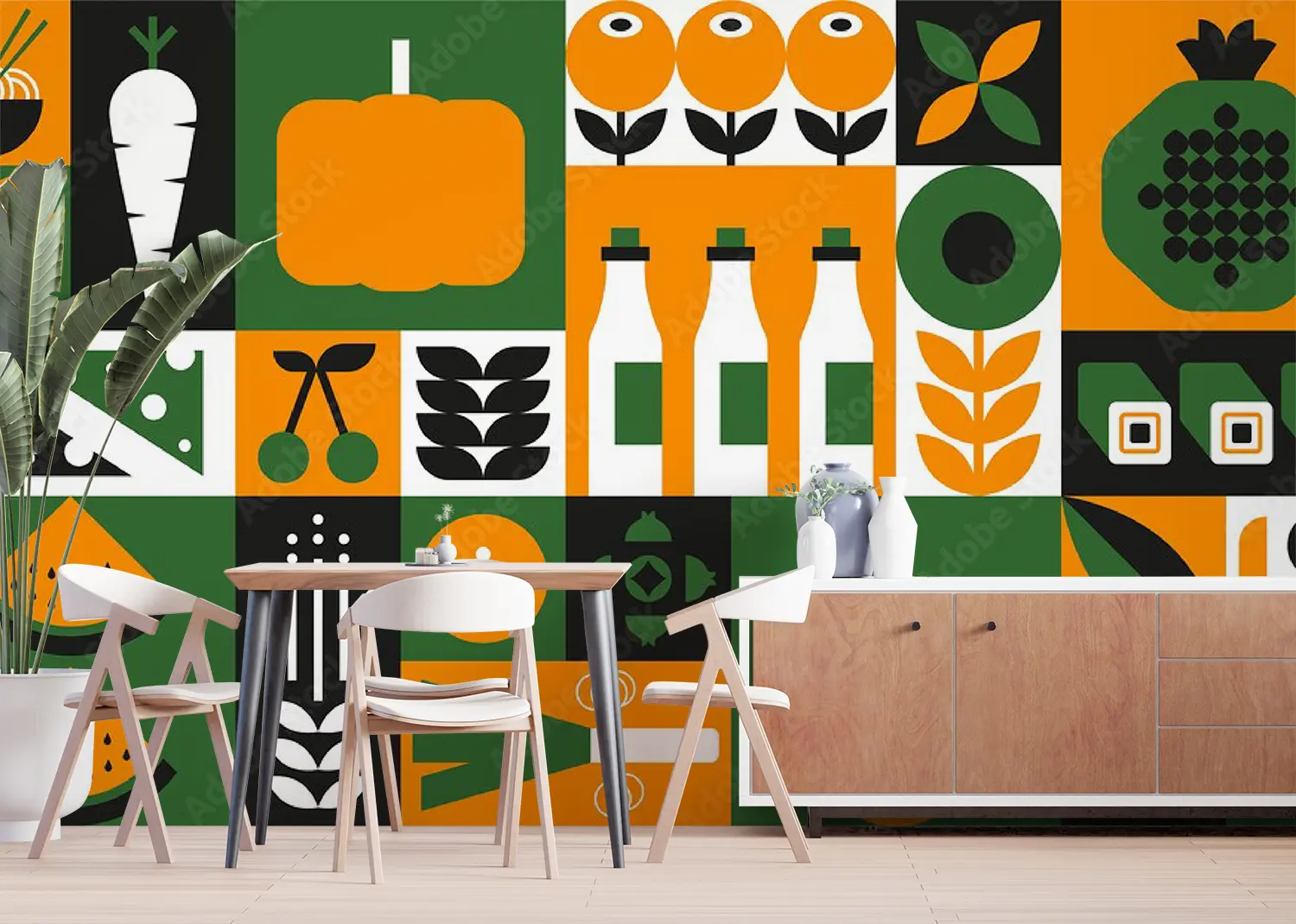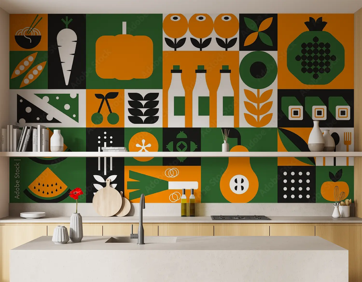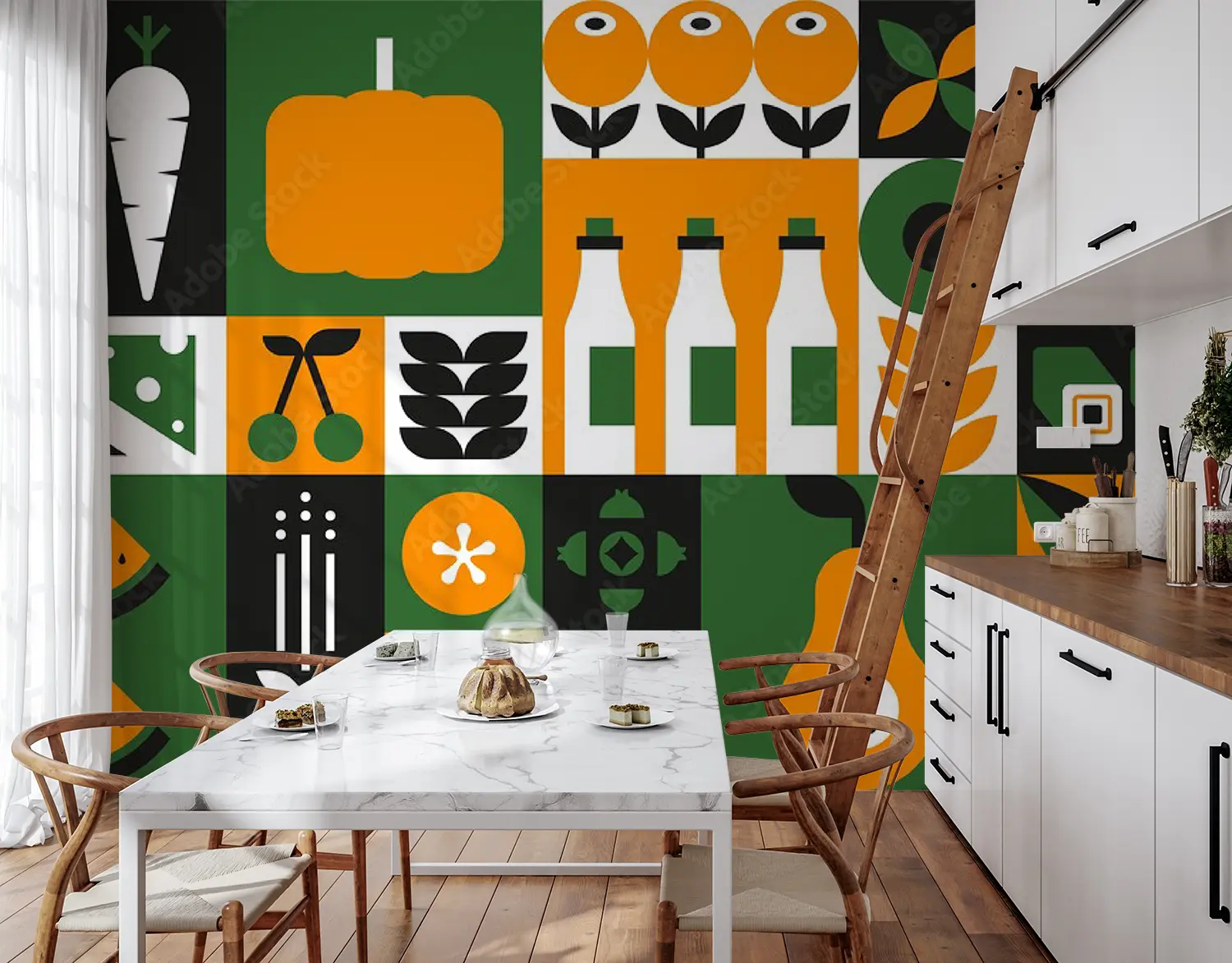 Elevate your home decor with this captivating wall art featuring a variety of food items in a square pattern. The colorful design includes bottles of milk, fruits, and vegetables, creating a visually appealing aesthetic. Complementary colors such as green, orange, and yellow add a lively touch to any room. Perfect for food enthusiasts and art lovers alike.
