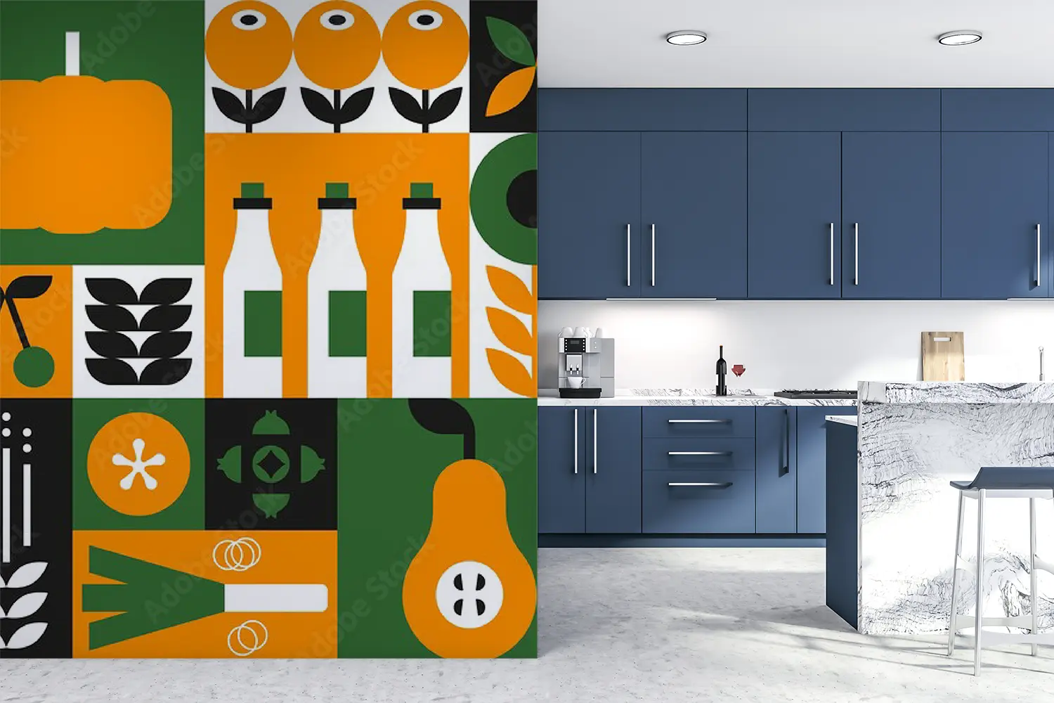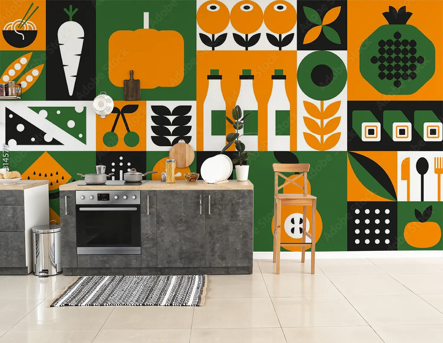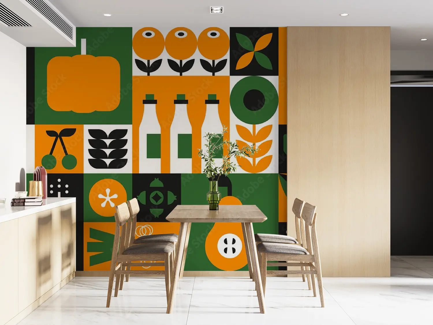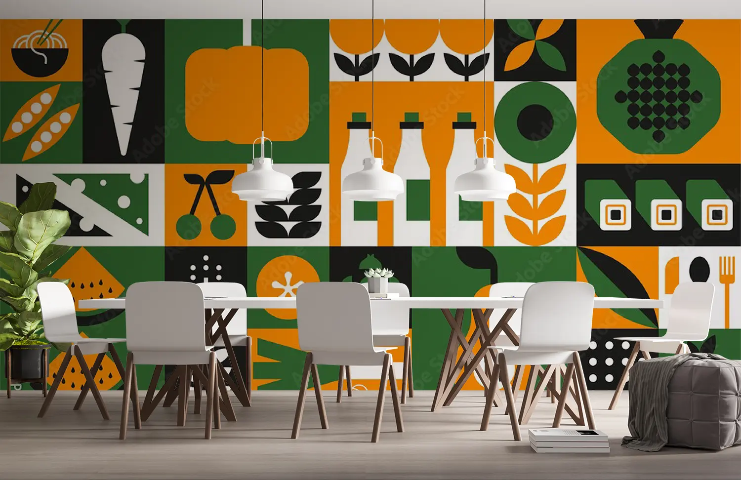 Elevate your home decor with this captivating wall art featuring a variety of food items in a square pattern. The colorful design includes bottles of milk, fruits, and vegetables, creating a visually appealing aesthetic. Complementary colors such as green, orange, and yellow add a lively touch to any room. Perfect for food enthusiasts and art lovers alike.