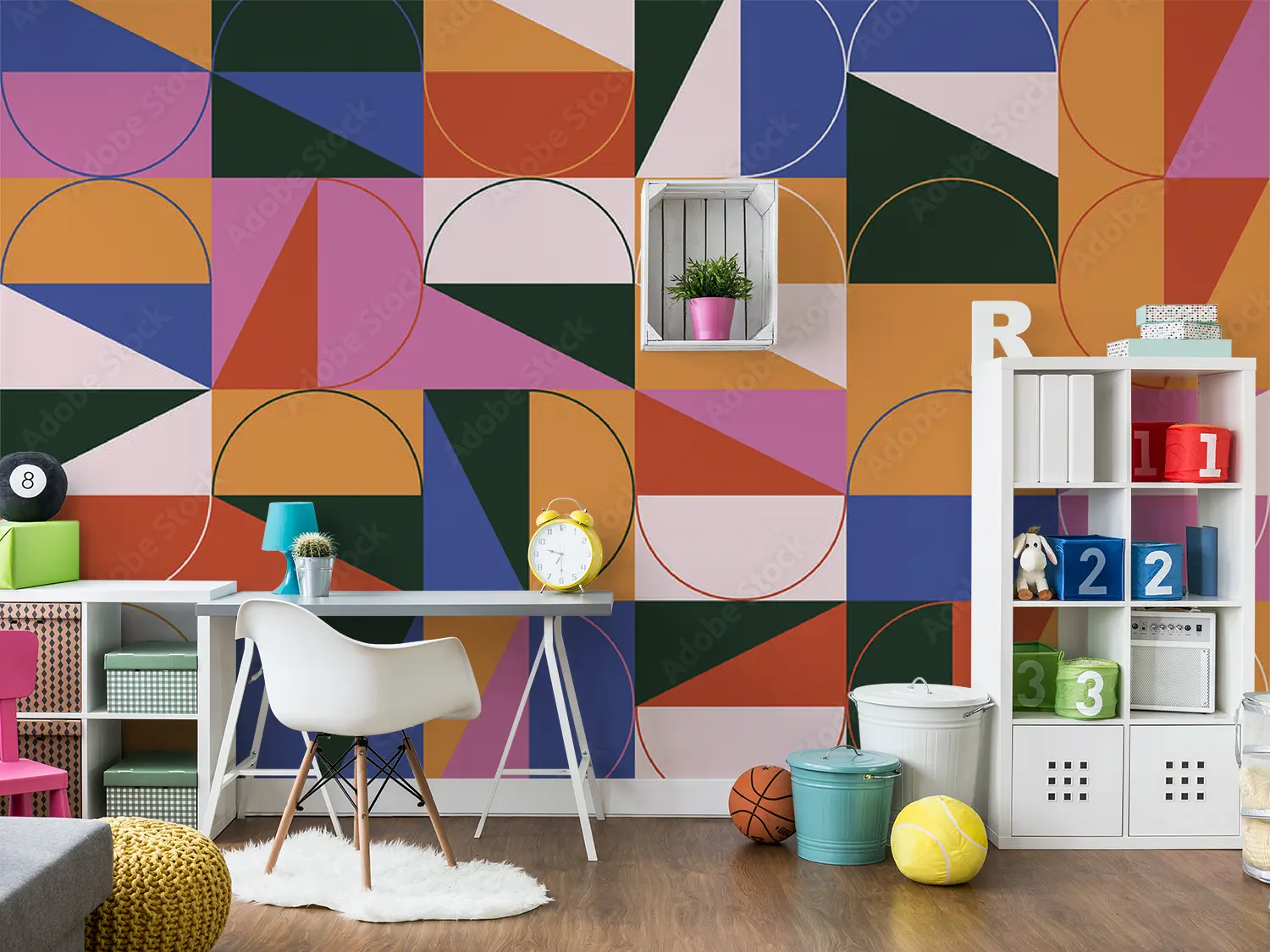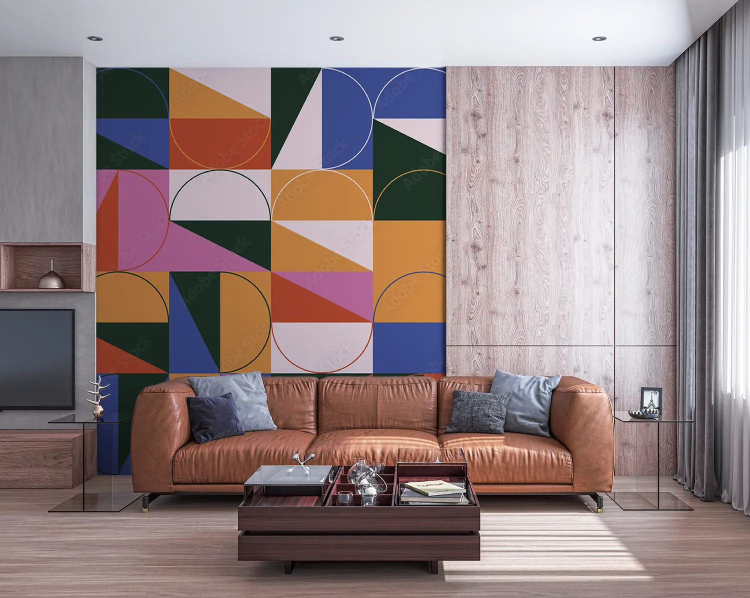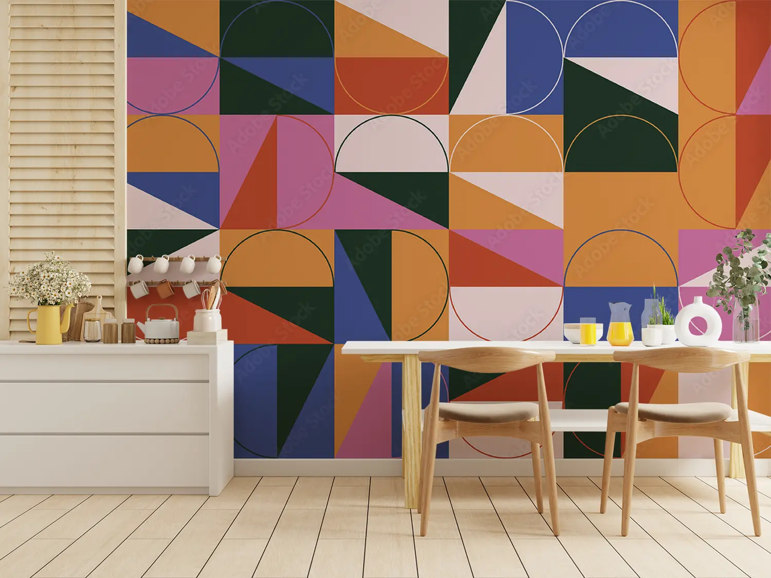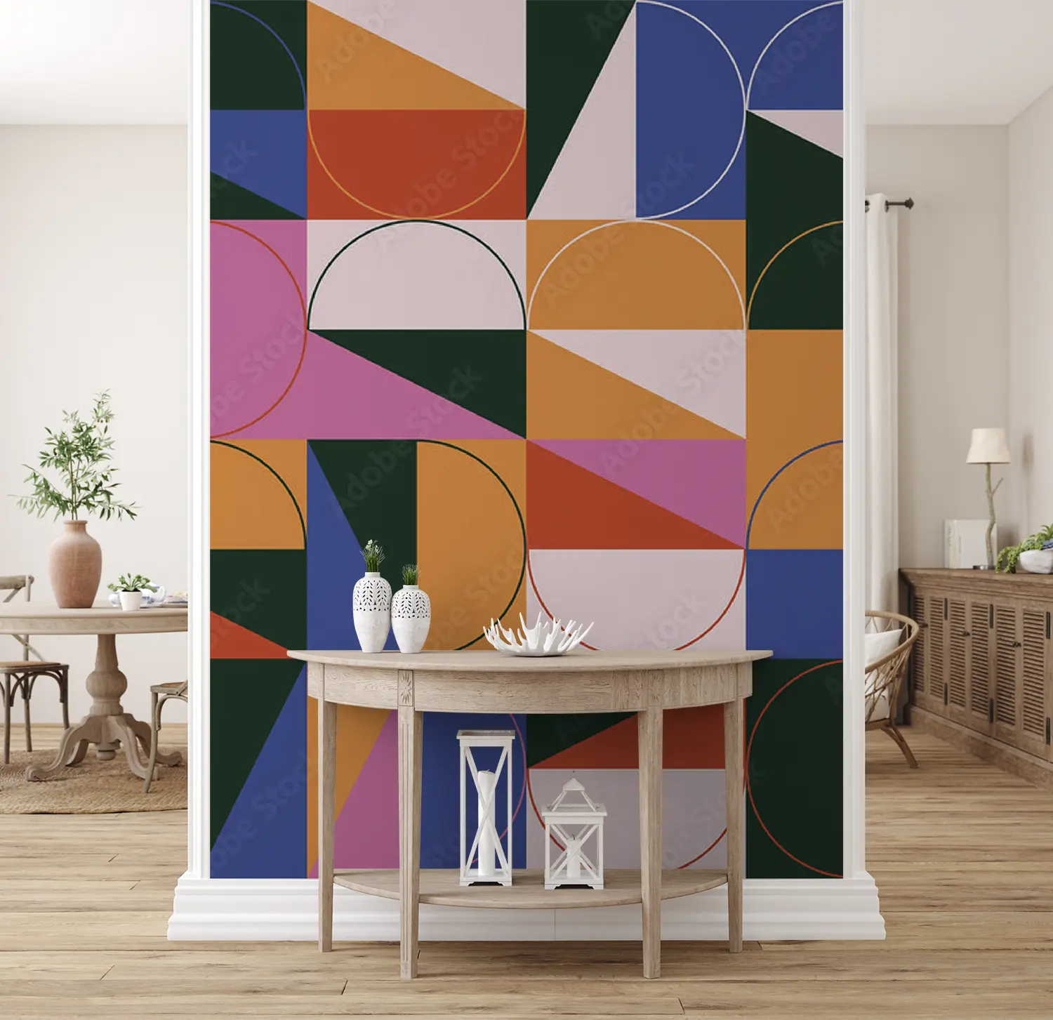 Enhance your living space with this captivating abstract design featuring colorful circles and triangles. Perfect for adding a modern touch to any room, this wall art exudes a trendy aesthetic appeal. Complementary colors to consider include shades of burnt orange, navy blue, and light pink to create a cohesive and visually pleasing decor scheme.