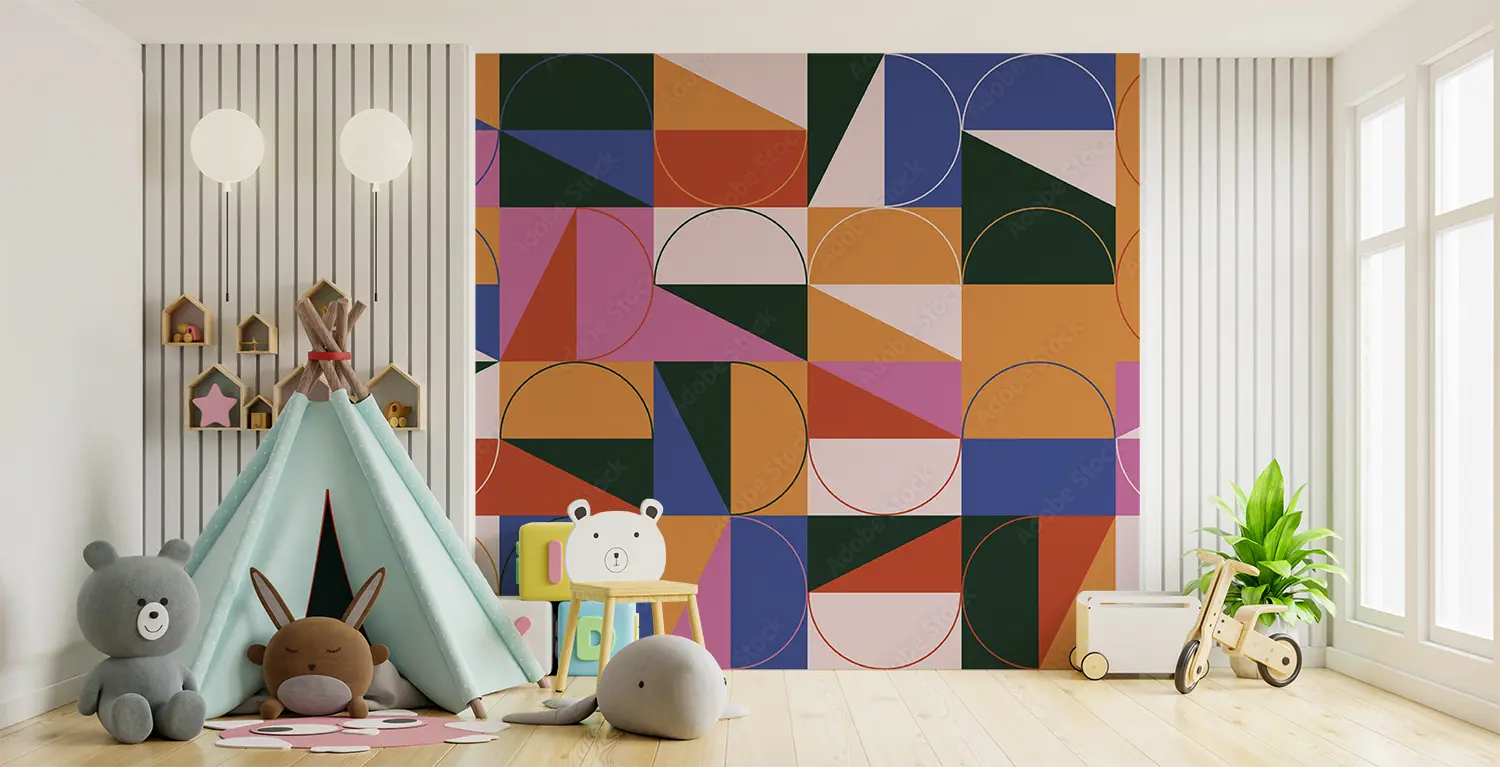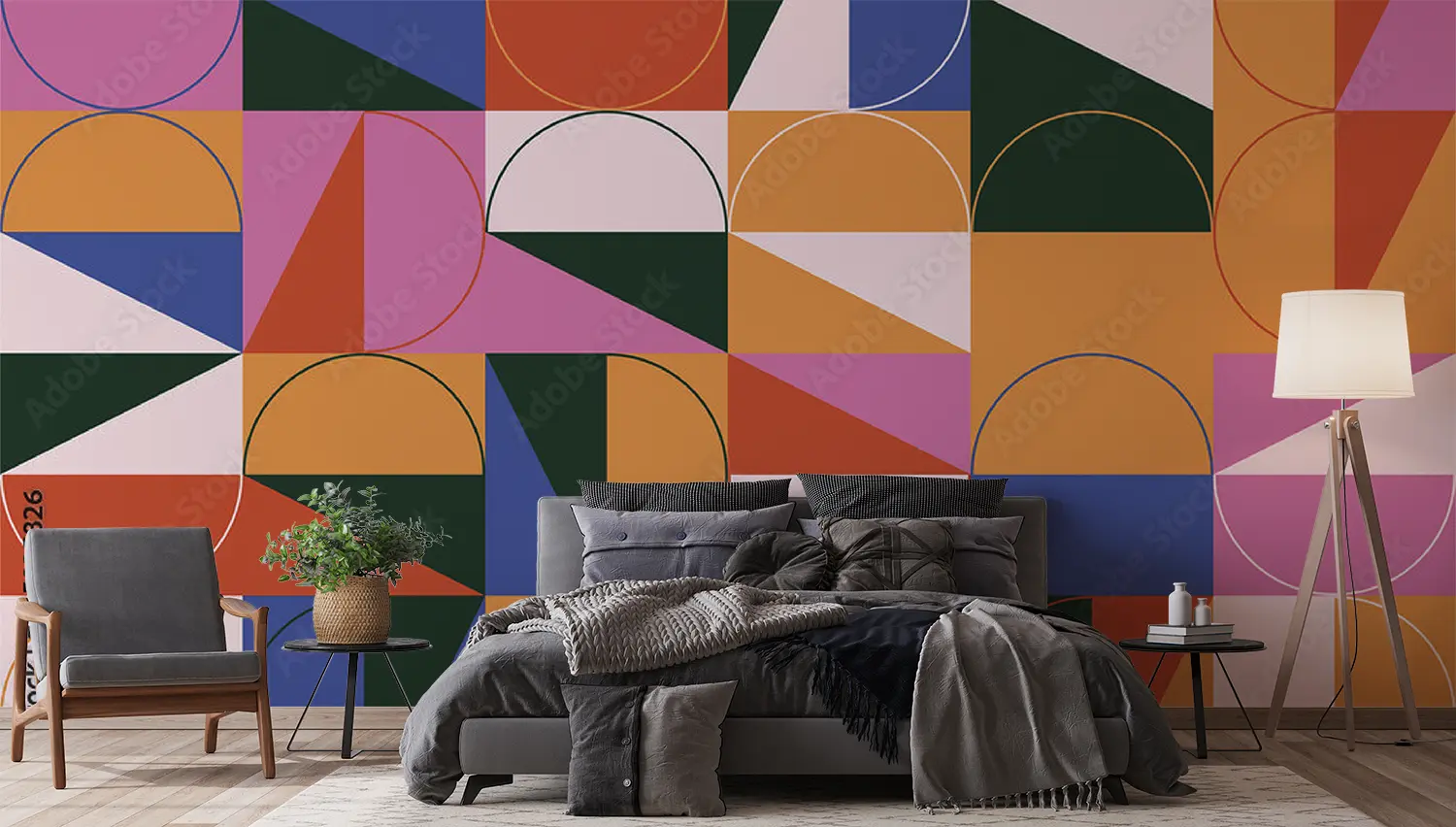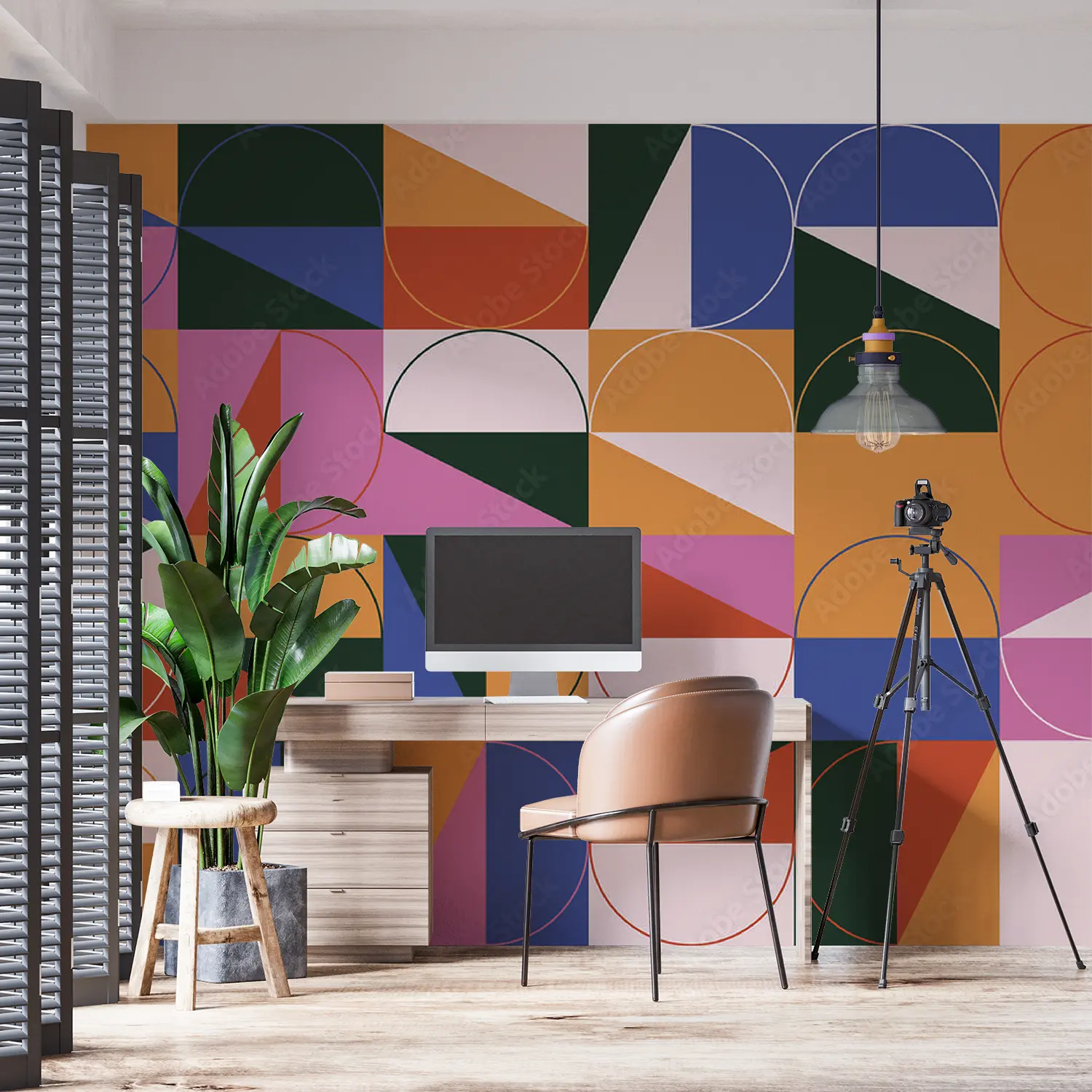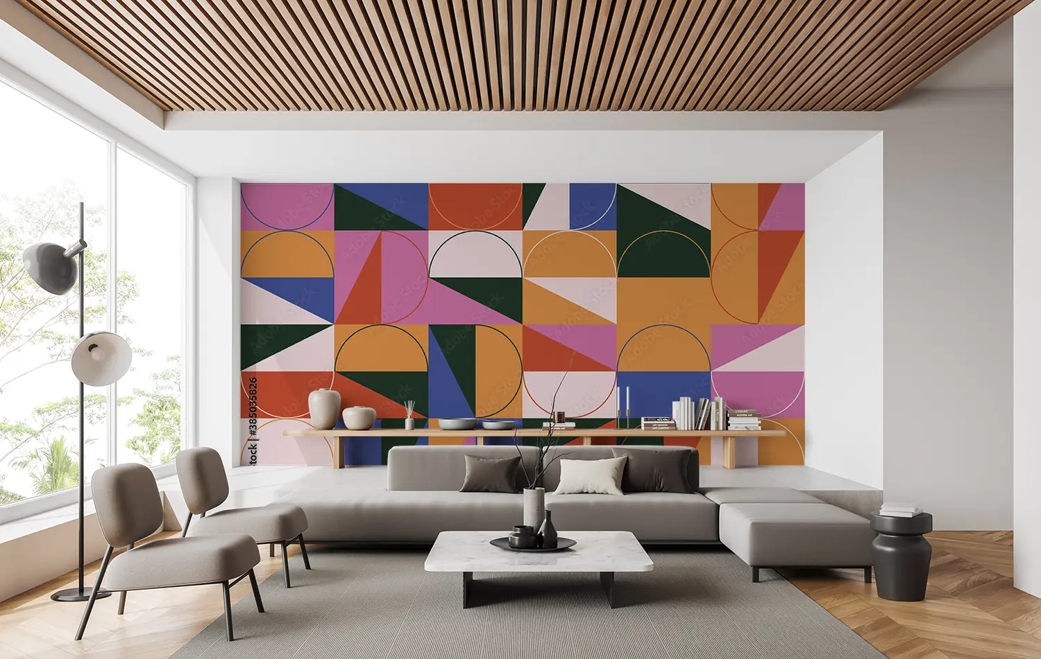 Enhance your living space with this captivating abstract design featuring colorful circles and triangles. Perfect for adding a modern touch to any room, this wall art exudes a trendy aesthetic appeal. Complementary colors to consider include shades of burnt orange, navy blue, and light pink to create a cohesive and visually pleasing decor scheme.