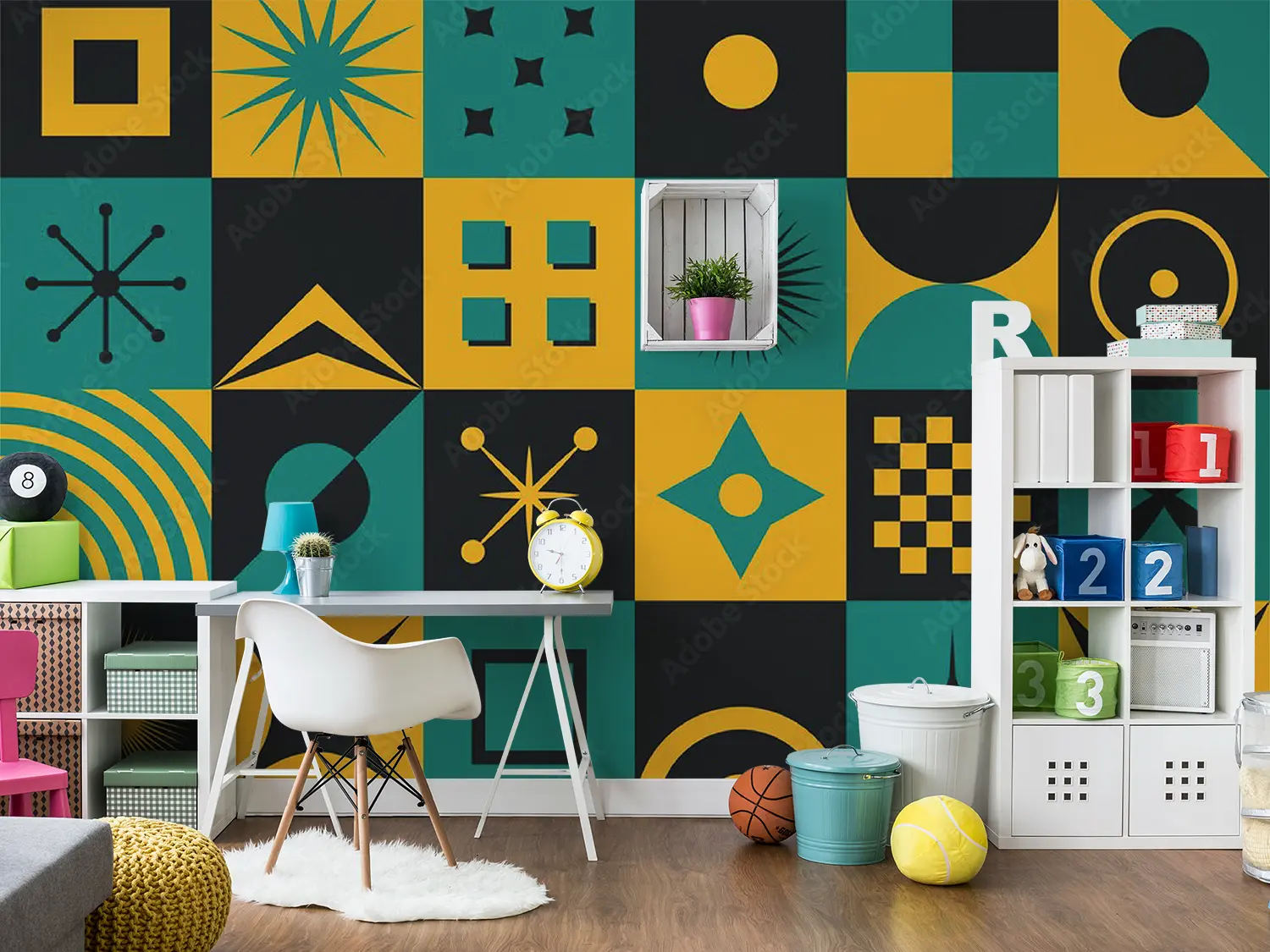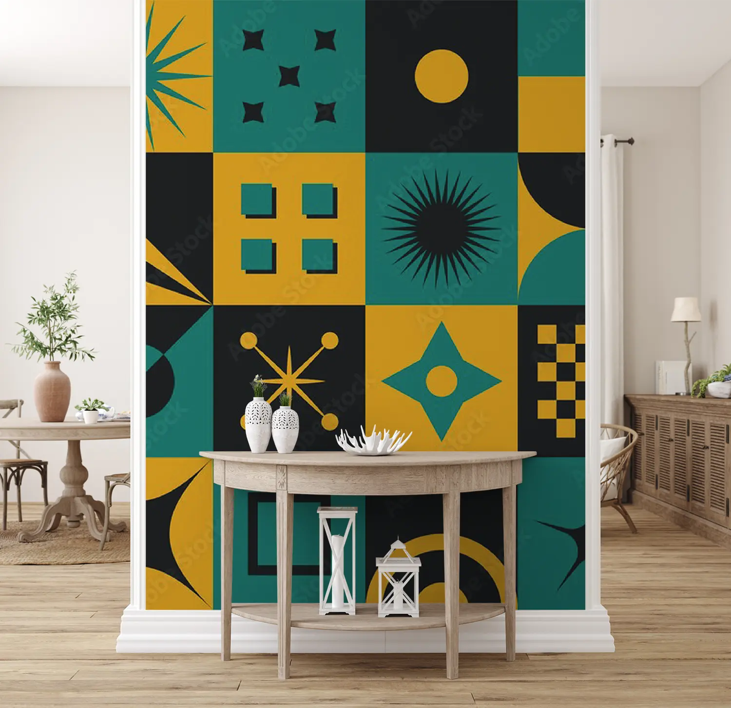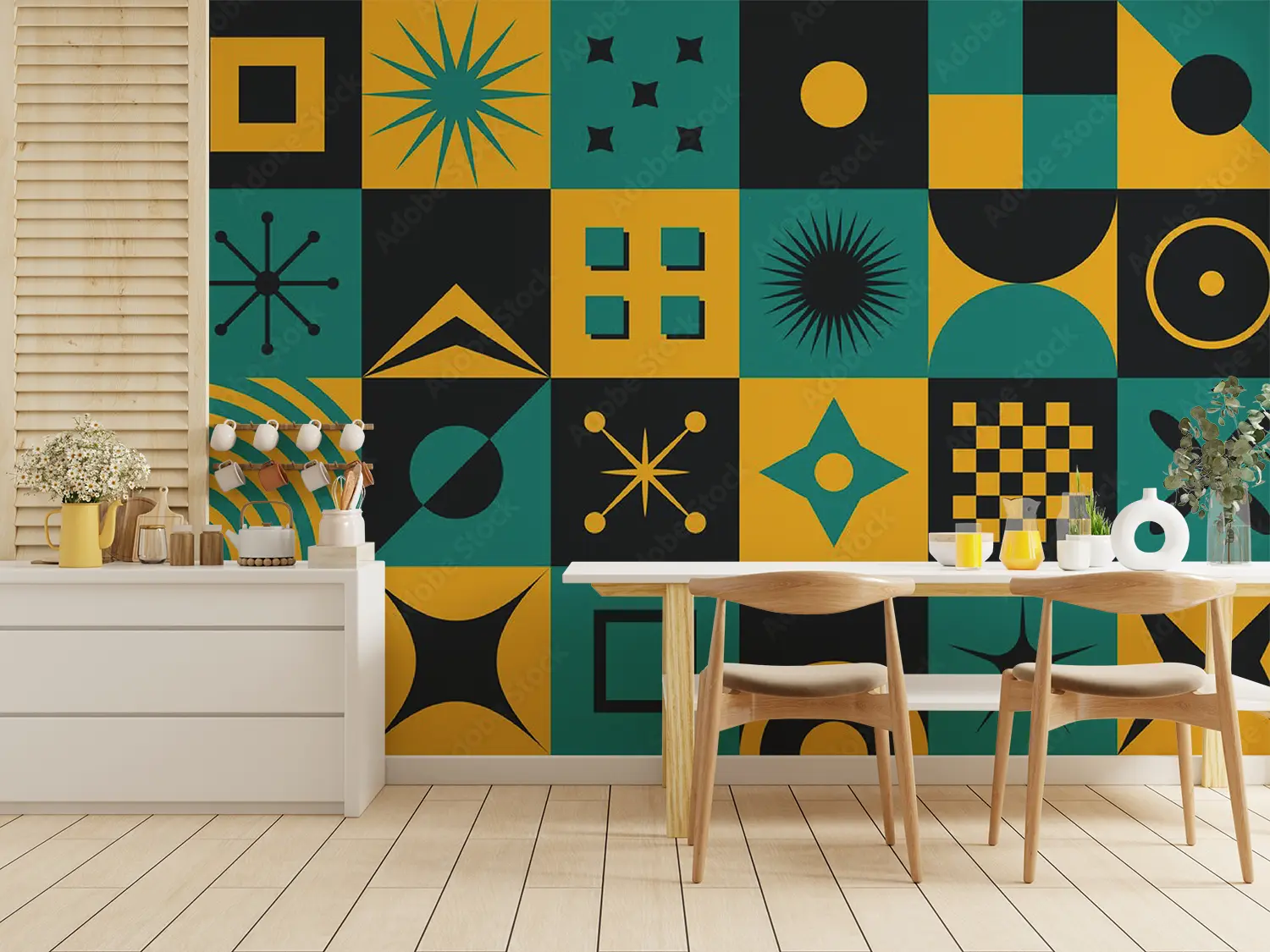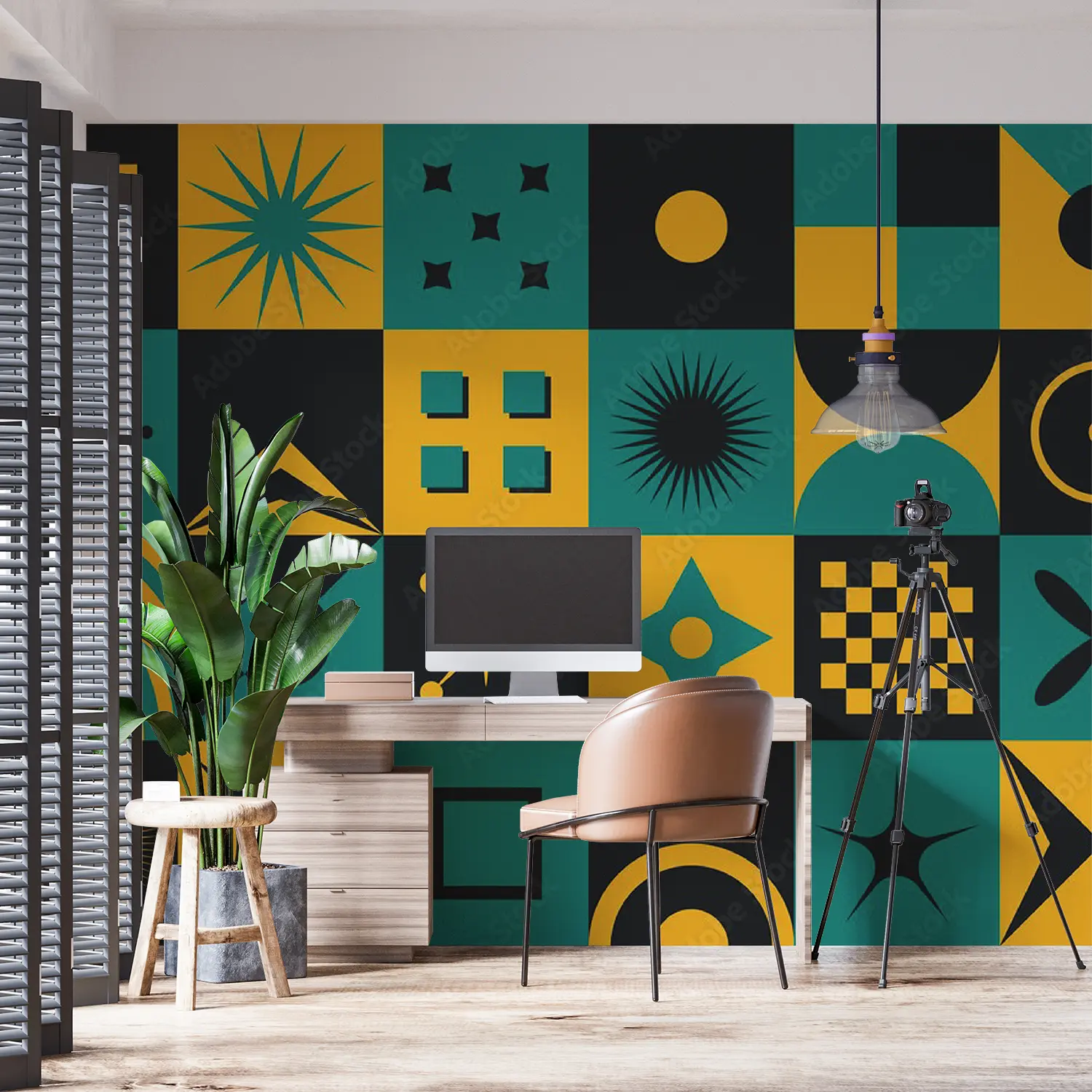 Elevate your home decor with this captivating wall art featuring a mix of colorful geometric shapes on a sleek black background. The intricate design adds a modern touch to any room, while the complementary colors of green, yellow, and black create a bold and eye-catching aesthetic. Perfect for adding a pop of personality to your space.