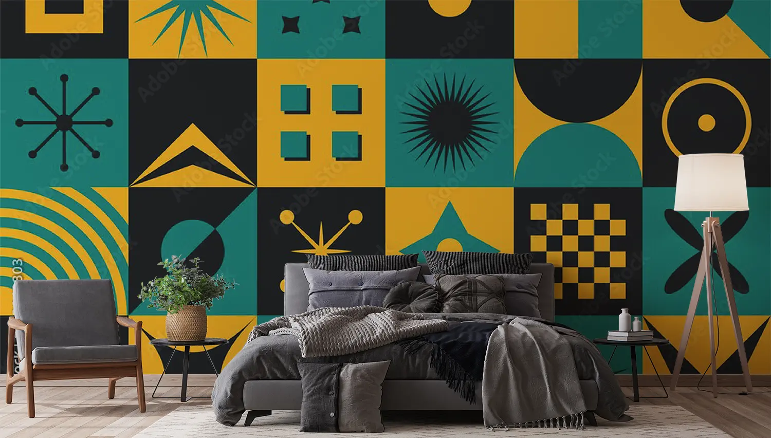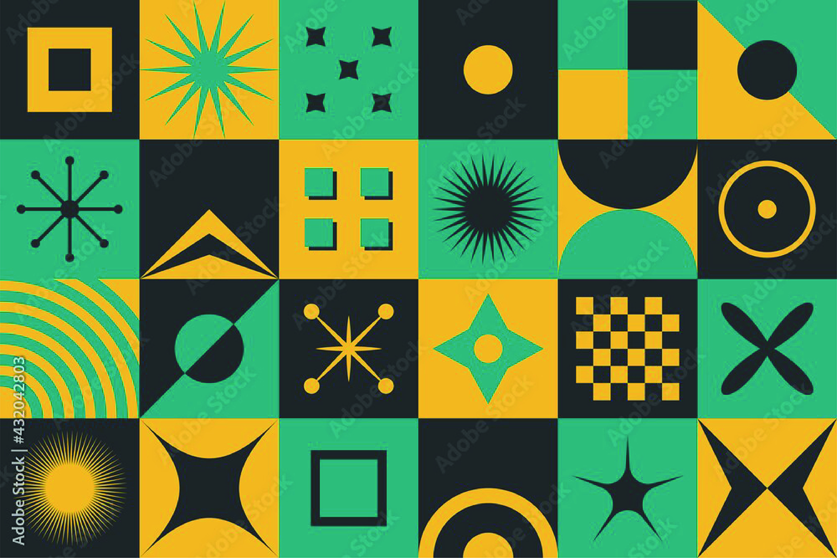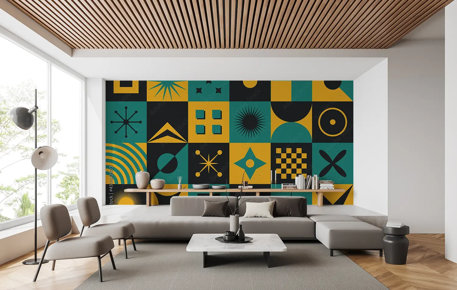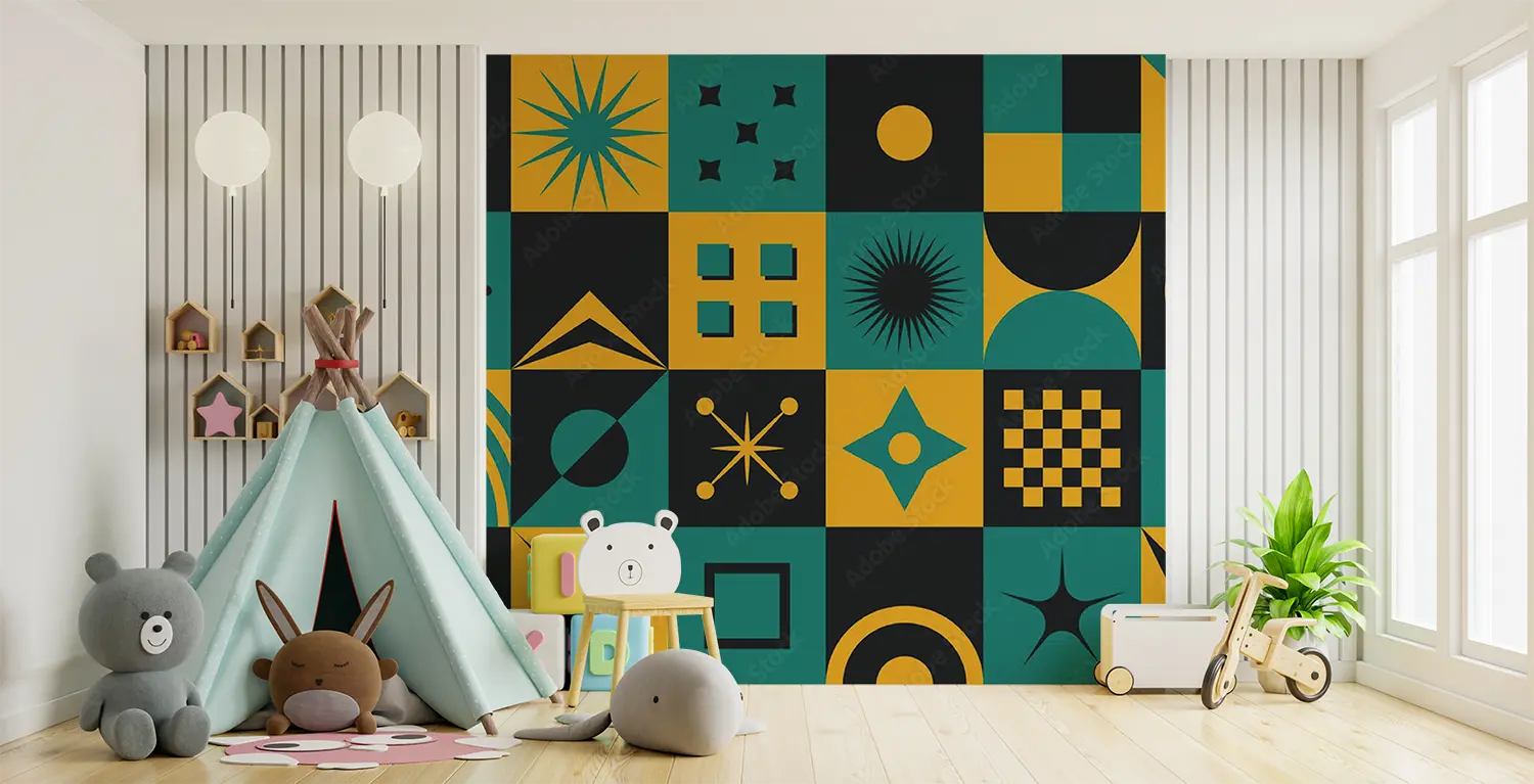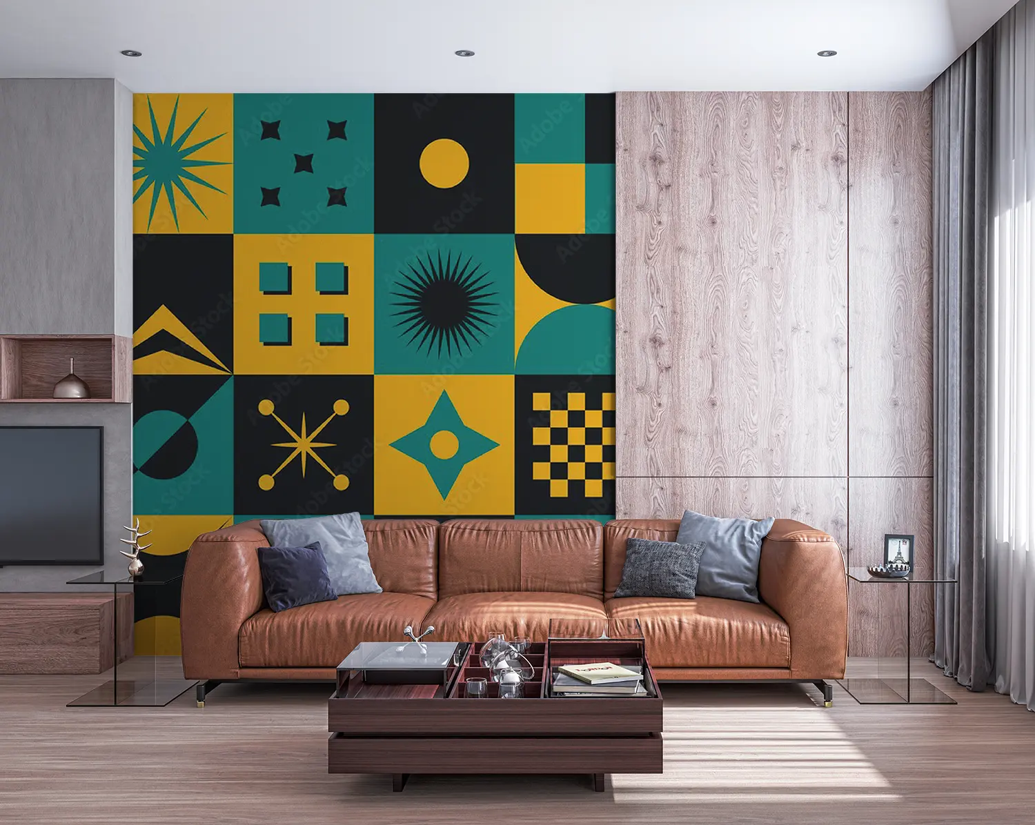 Elevate your home decor with this captivating wall art featuring a mix of colorful geometric shapes on a sleek black background. The intricate design adds a modern touch to any room, while the complementary colors of green, yellow, and black create a bold and eye-catching aesthetic. Perfect for adding a pop of personality to your space.