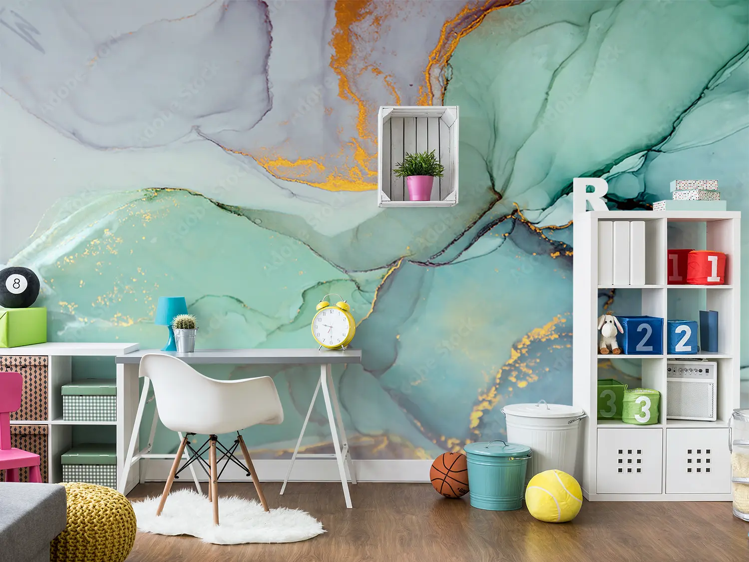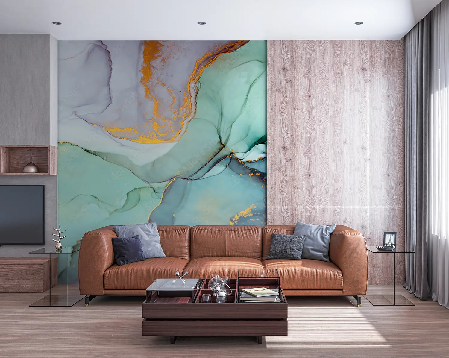Elevate your home decor with this breathtaking close-up painting of green and blue hues. The intricate blend of colors and textures adds a touch of elegance to any room. Complementary colors to consider incorporating are gold, yellow, and shades of blue to enhance the overall aesthetic appeal of your space.