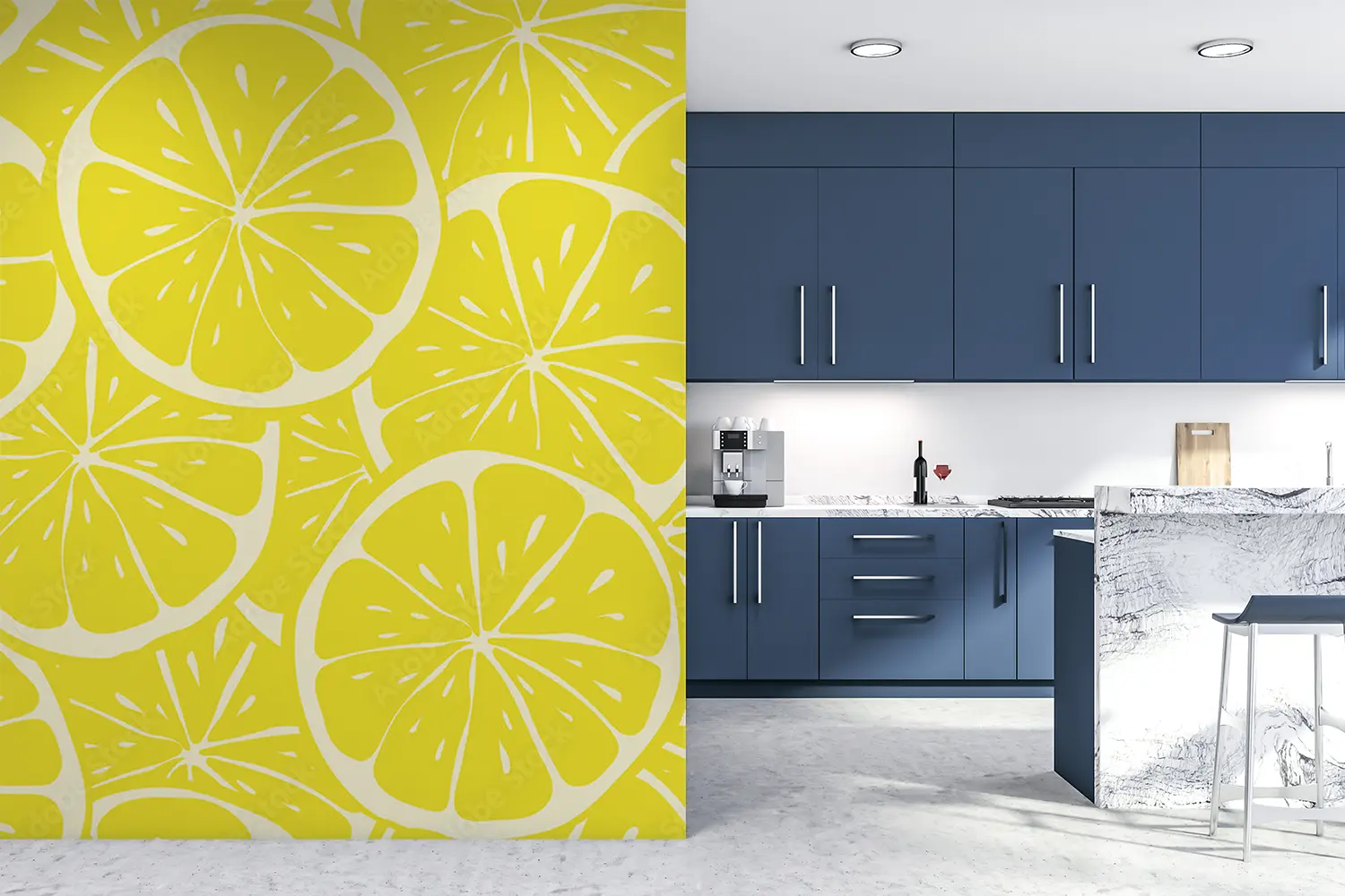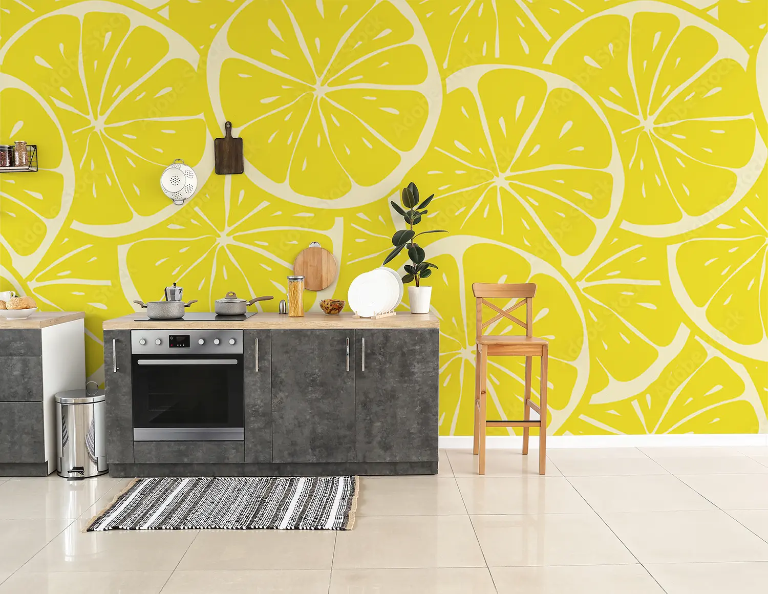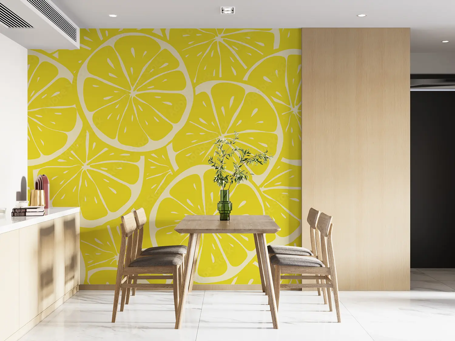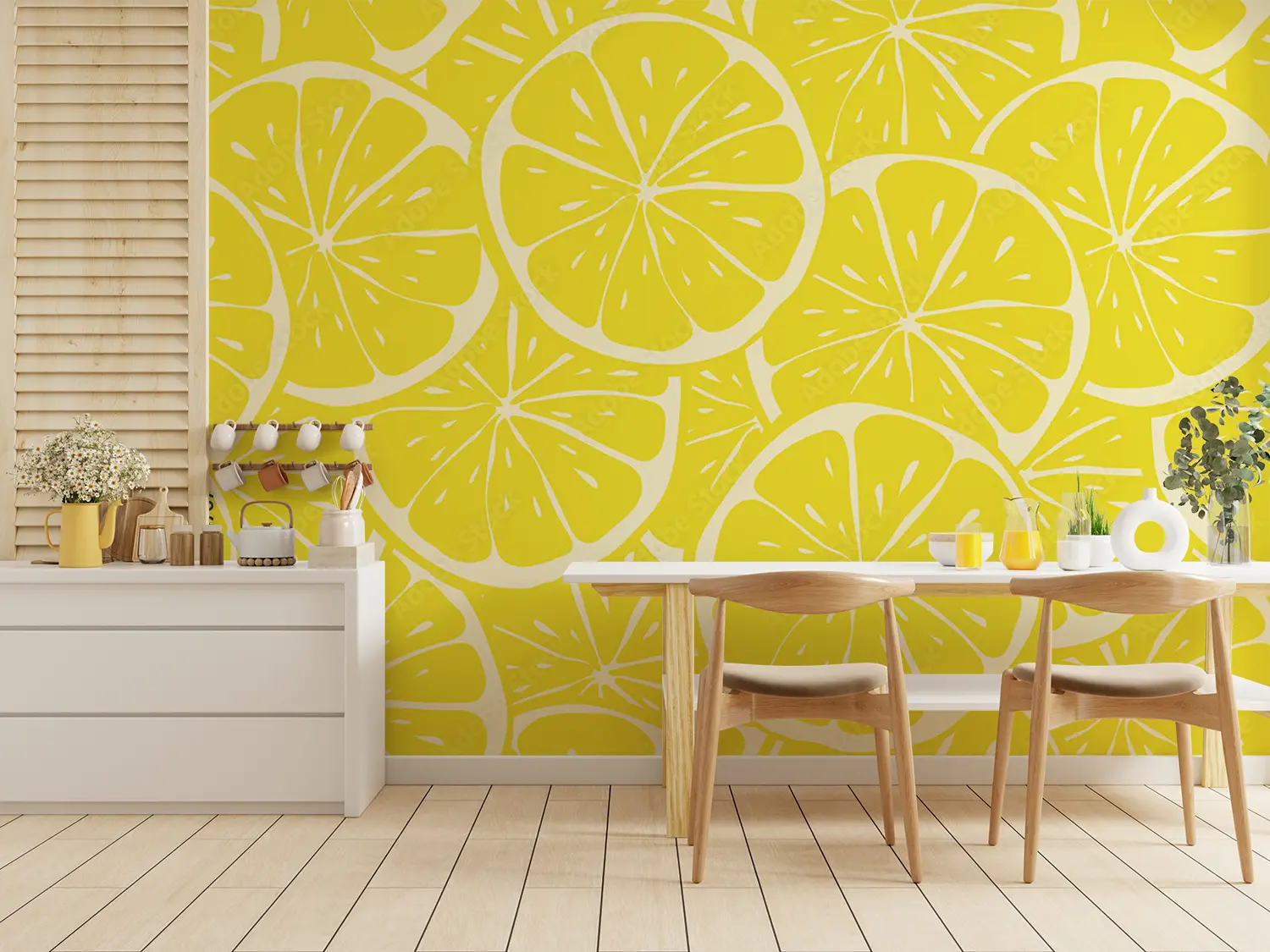 Transform your space with a stunning wall featuring a lively pattern of lemon slices on a sunny yellow background. This eye-catching design adds a touch of freshness and brightness to any room, perfect for creating a lively and inviting atmosphere. Complementary colors to consider include shades of green, yellow, and orange to enhance the citrusy theme.