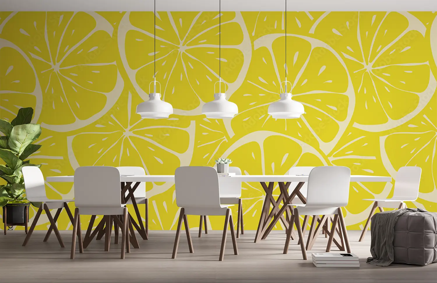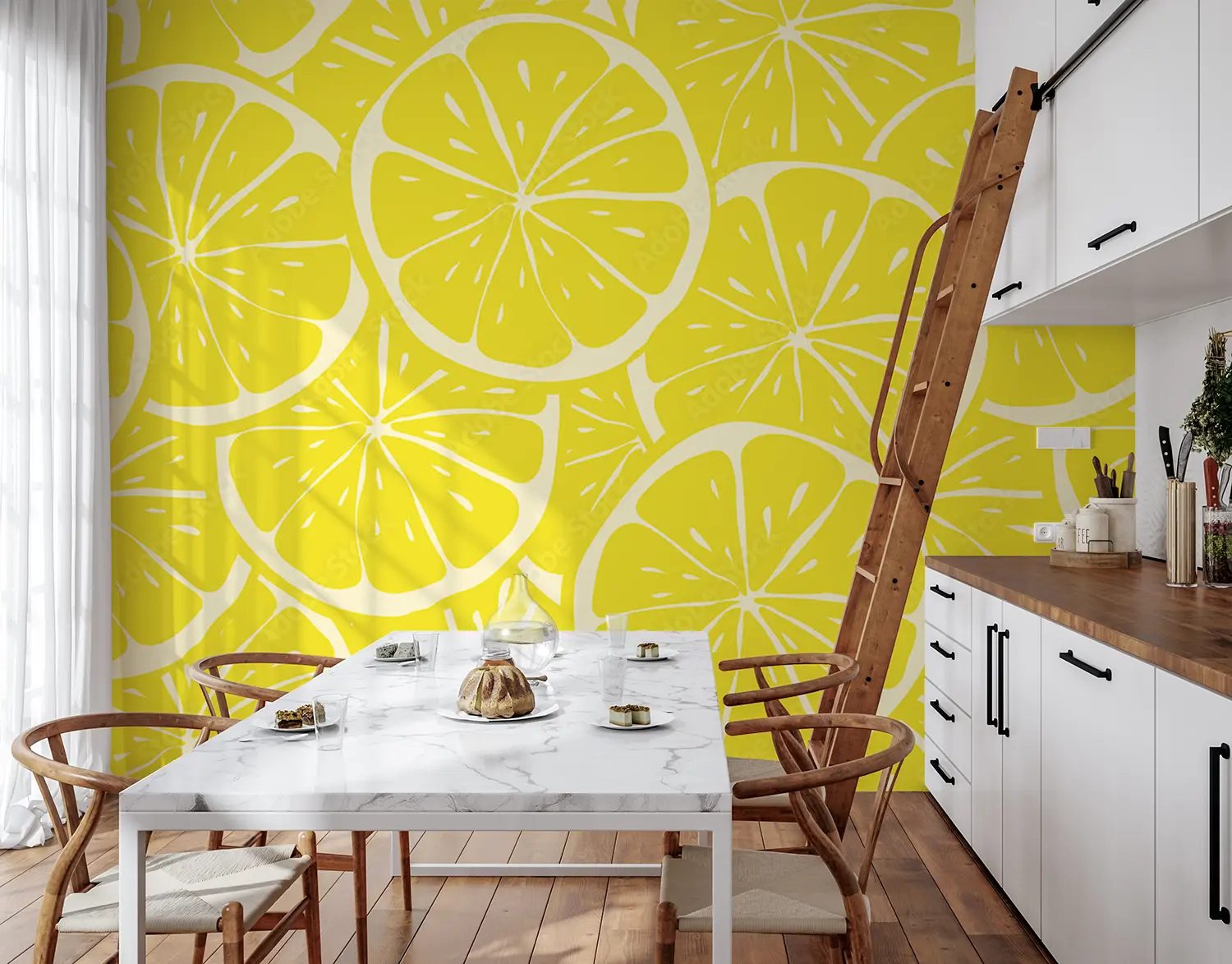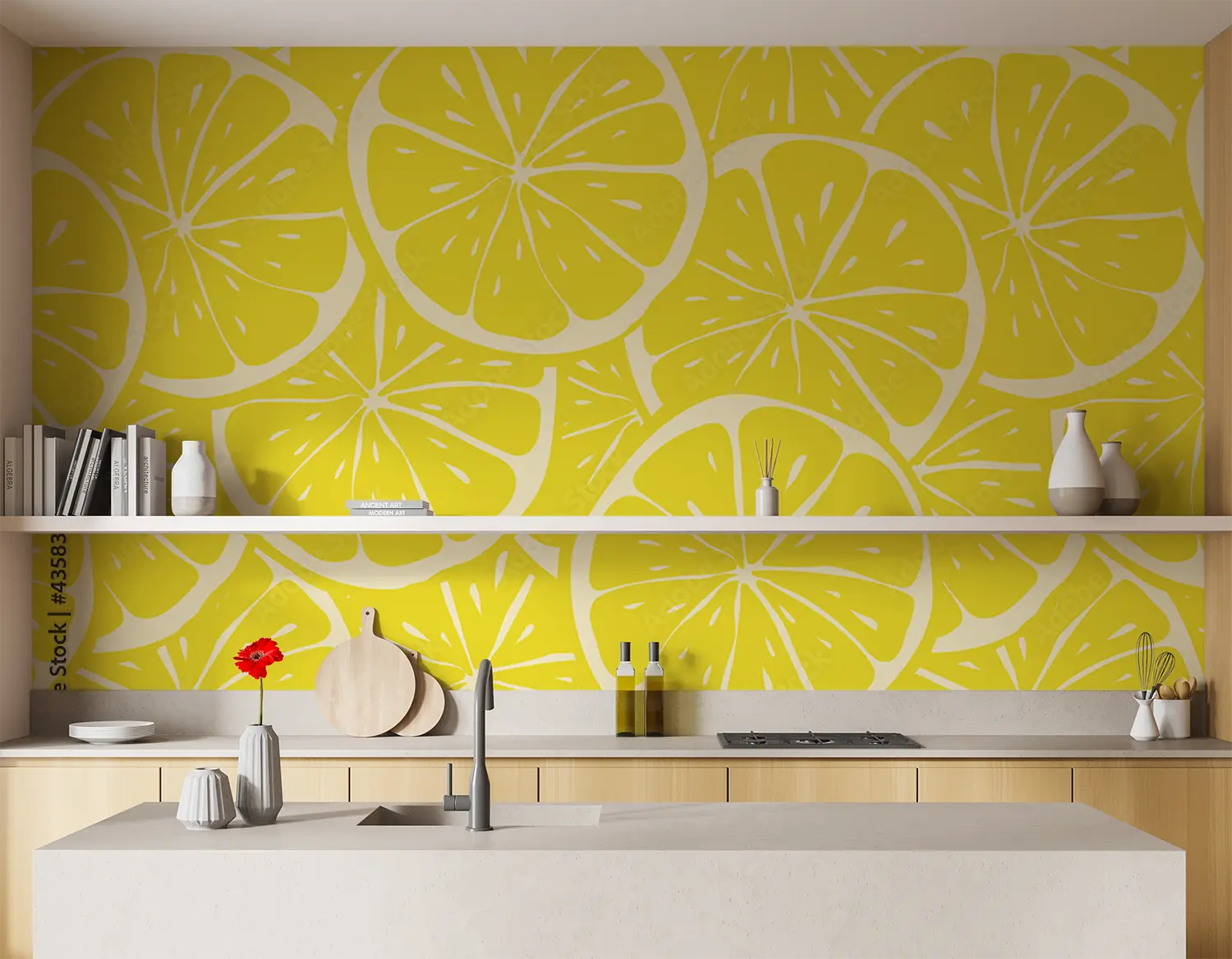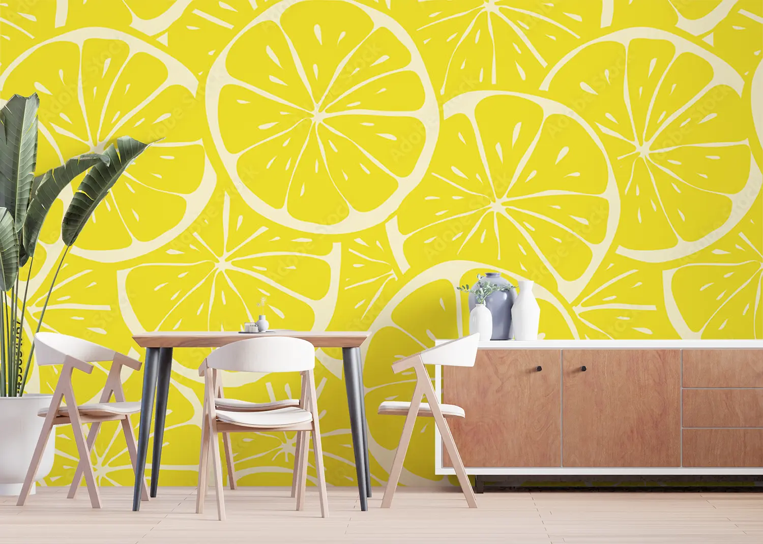 Transform your space with a stunning wall featuring a lively pattern of lemon slices on a sunny yellow background. This eye-catching design adds a touch of freshness and brightness to any room, perfect for creating a lively and inviting atmosphere. Complementary colors to consider include shades of green, yellow, and orange to enhance the citrusy theme.