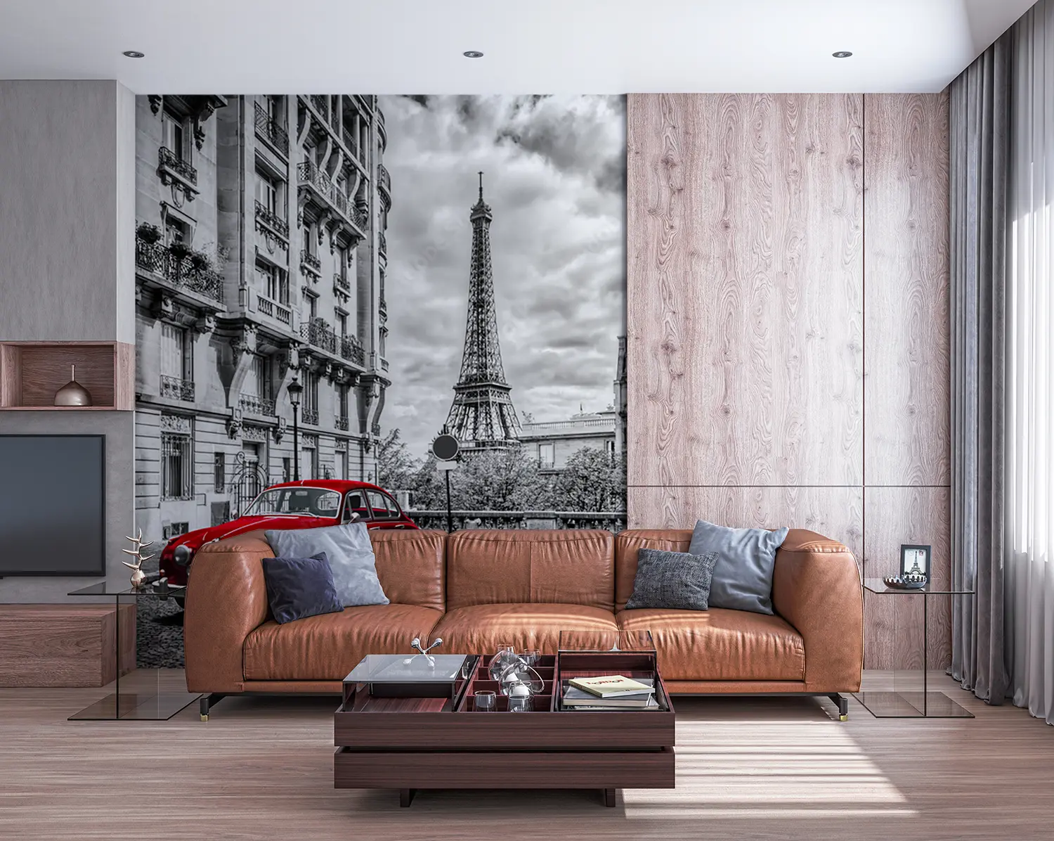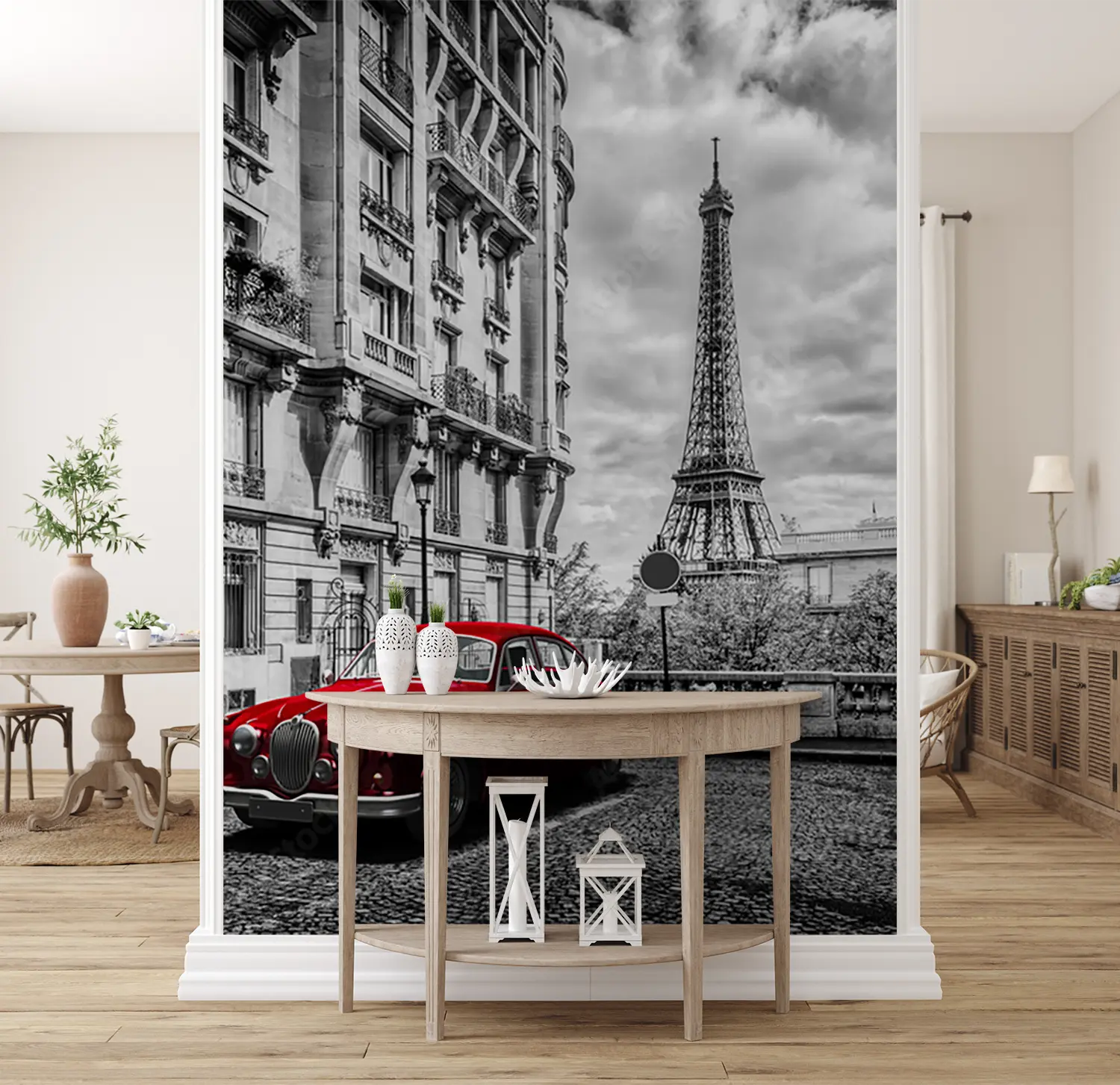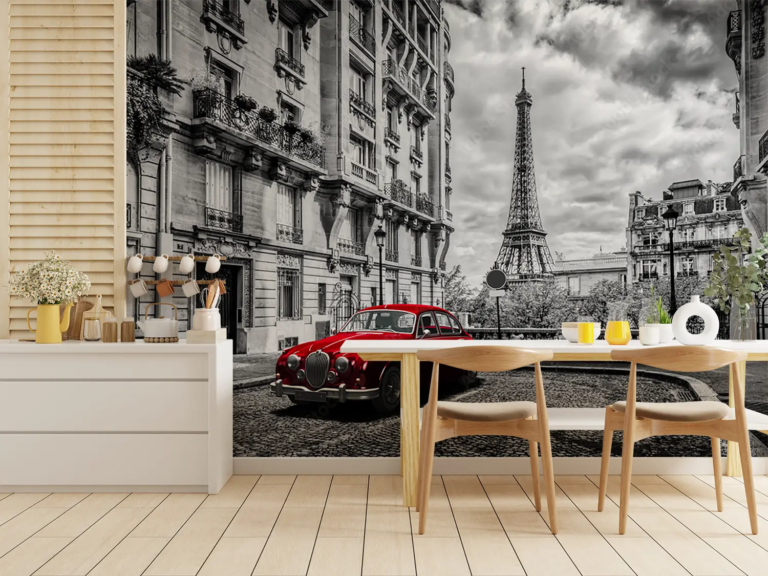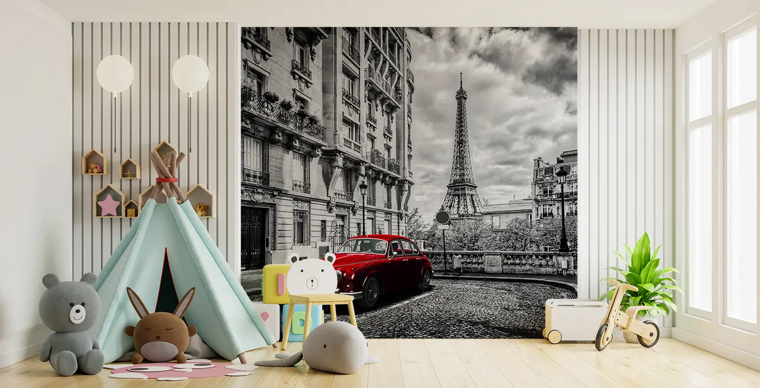 Bring the vibrant energy of a red car parked in front of a tall building into your home with this stunning wall art. The bold red color adds a pop of excitement to any space, while the sleek design creates a modern aesthetic. Complement the mural with accents in shades of black, white, and gray for a balanced and stylish look.