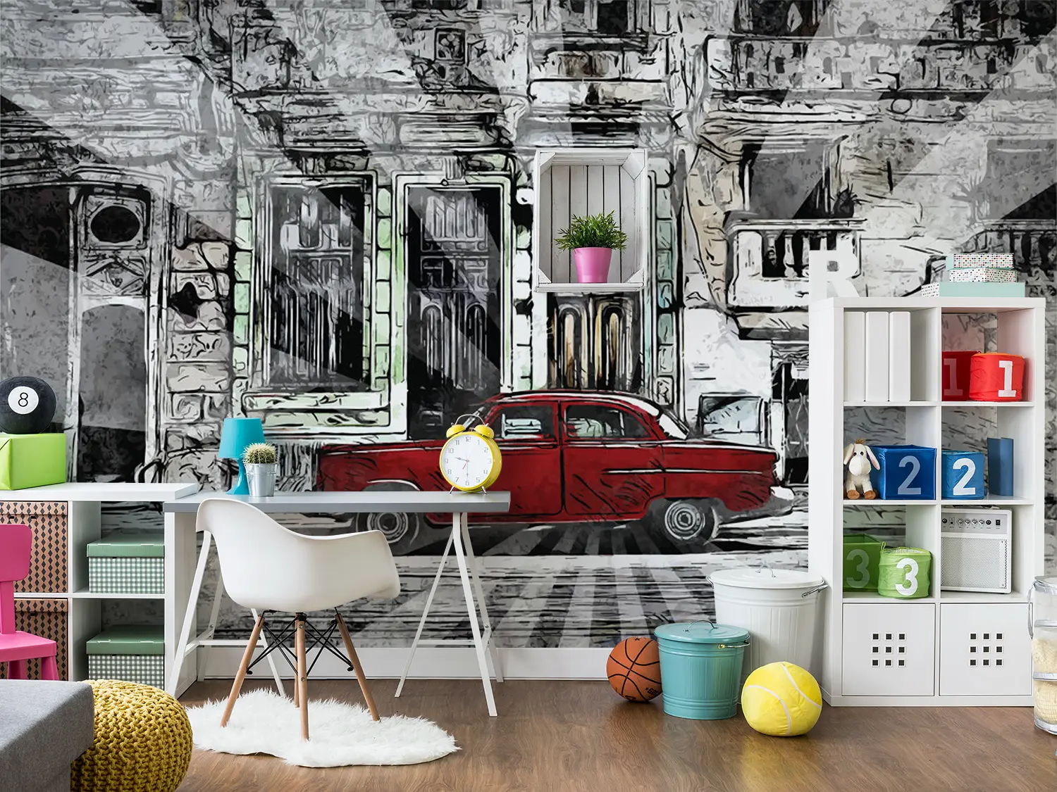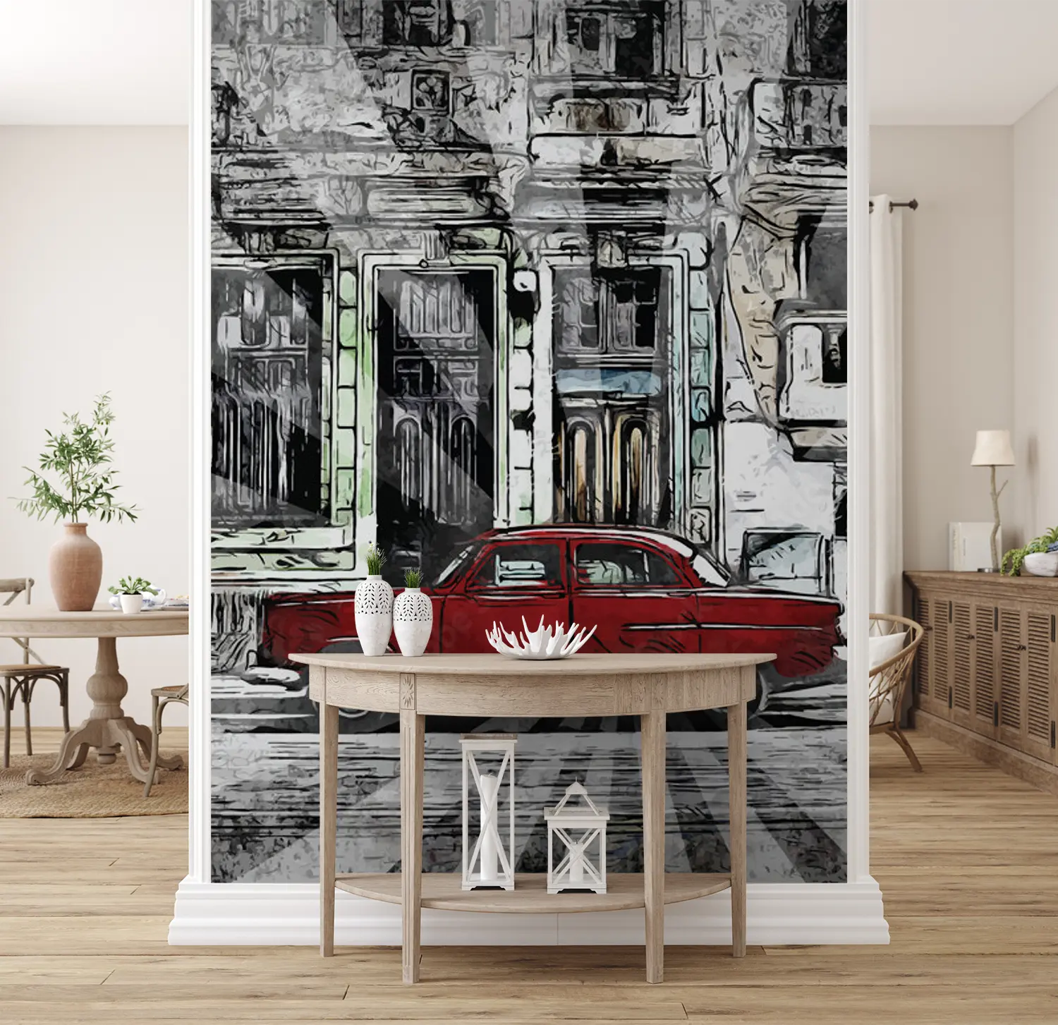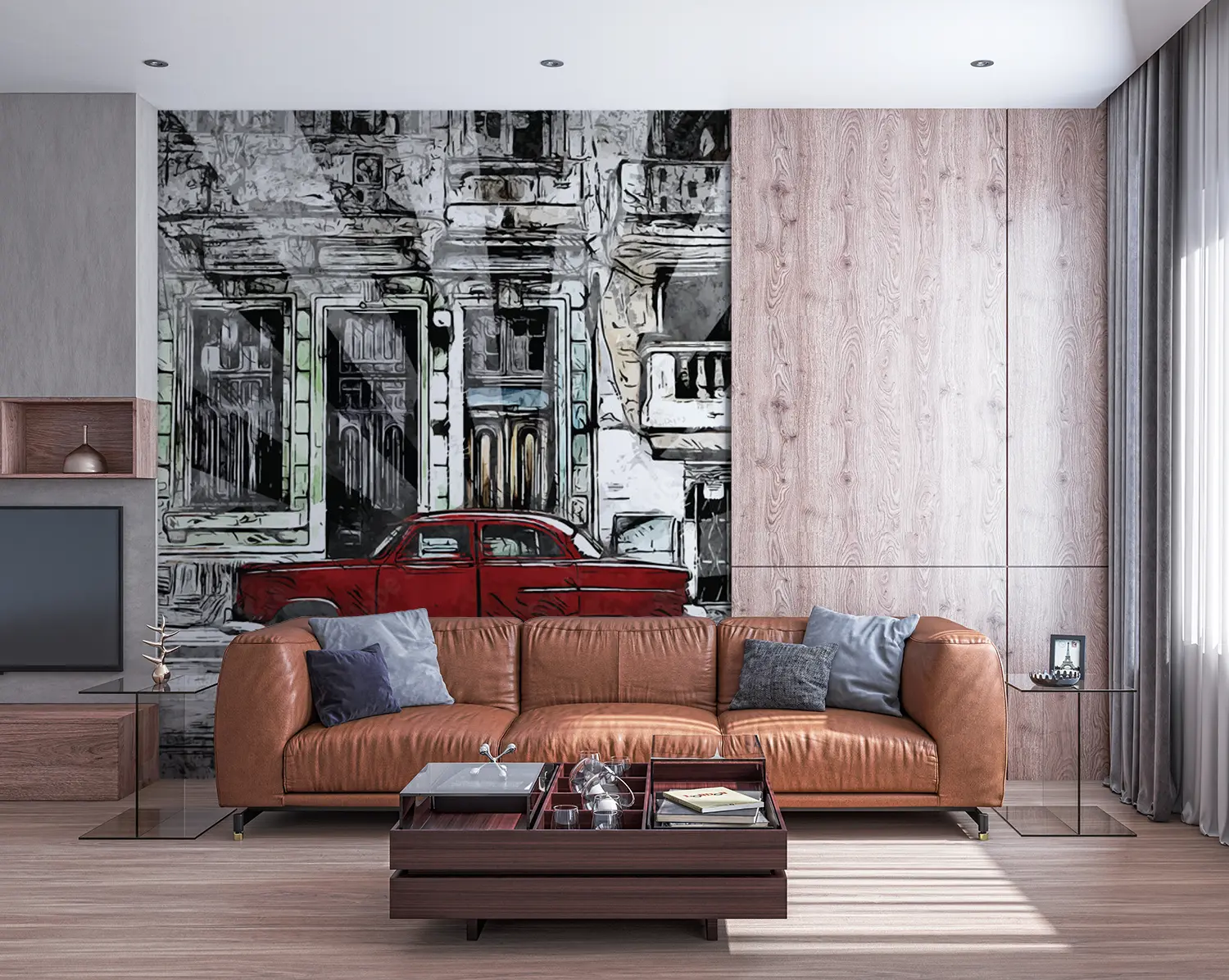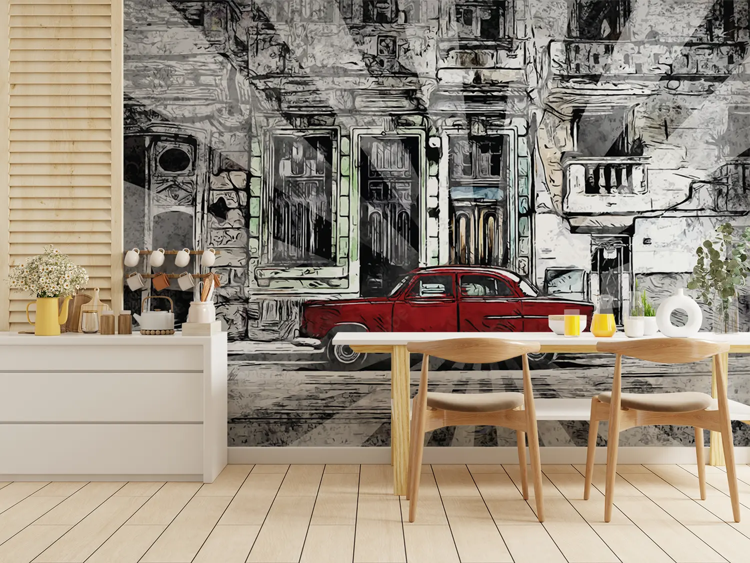Transform your space with this stunning wall art featuring a vibrant red car parked in front of a charming building. The bold colors and intricate details add a touch of sophistication to any room, making it a focal point for conversation and admiration. Complementary colors to consider include black, white, and shades of grey for a modern and stylish look.