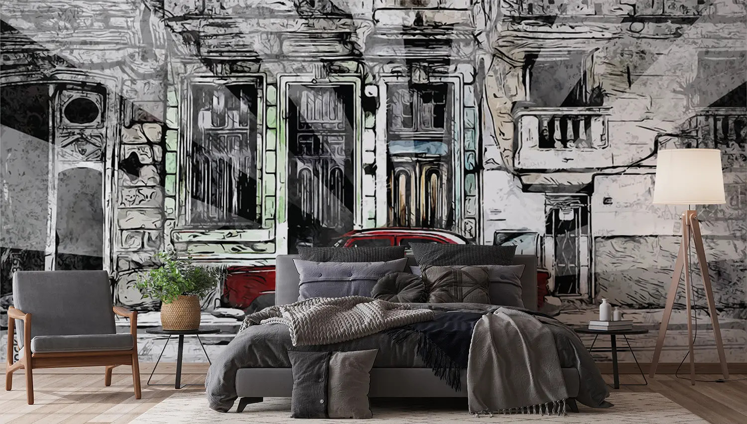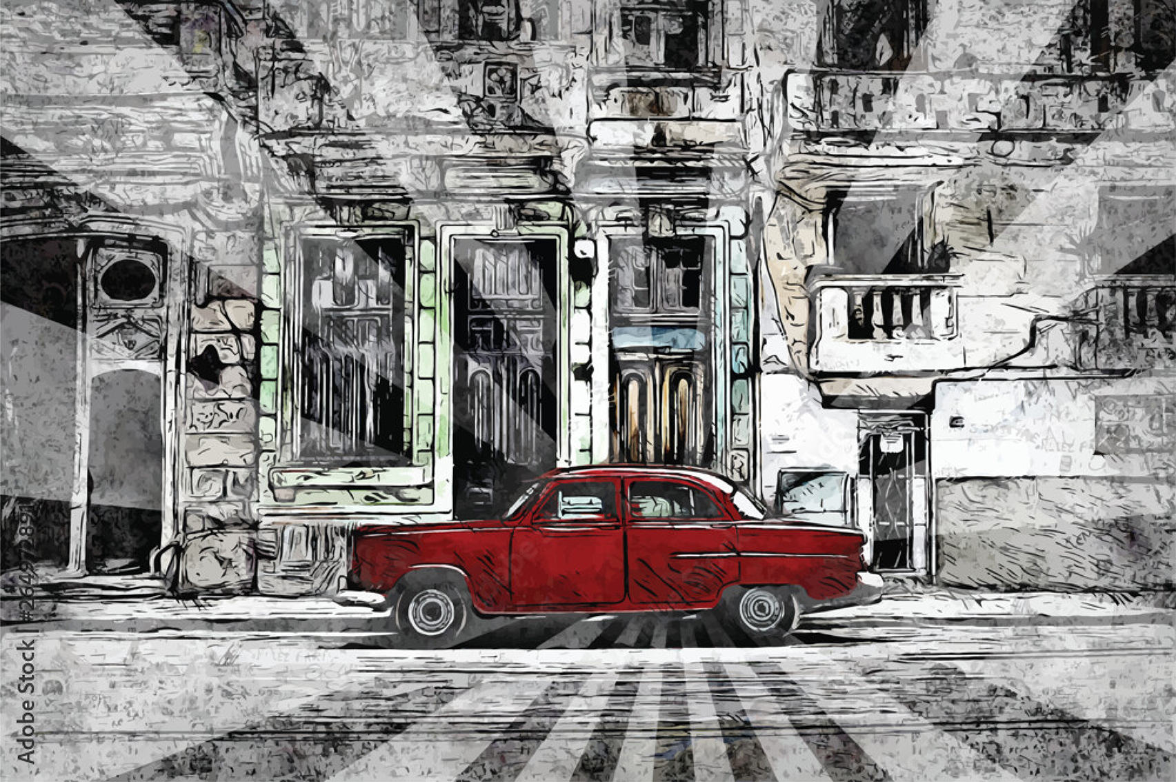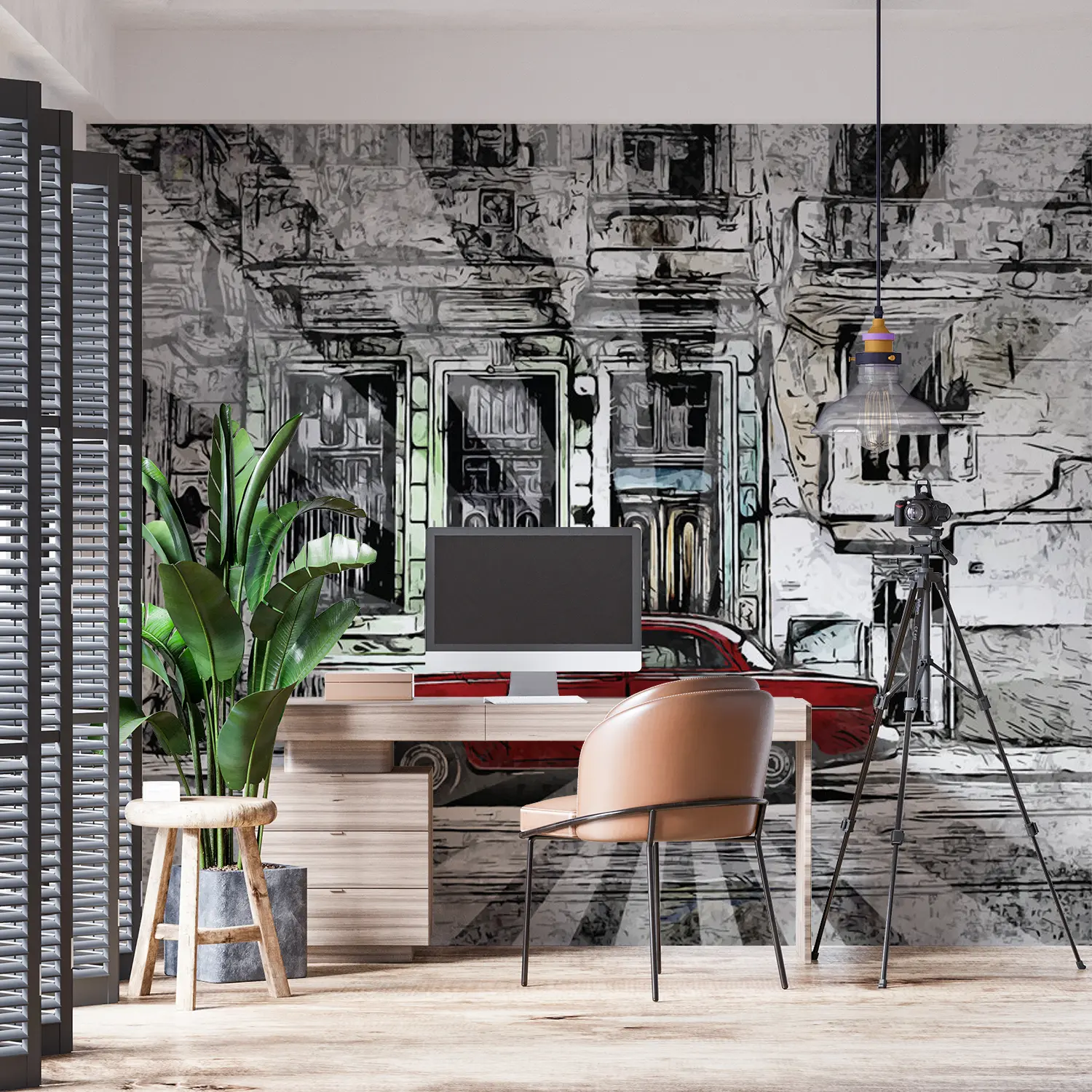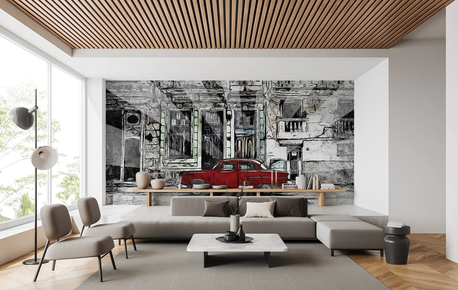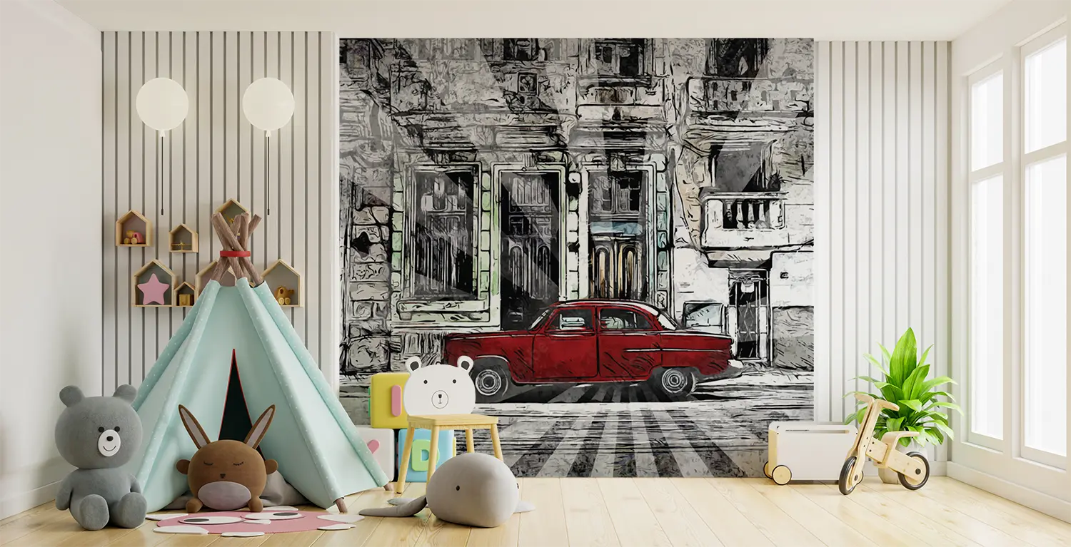Transform your space with this stunning wall art featuring a vibrant red car parked in front of a charming building. The bold colors and intricate details add a touch of sophistication to any room, making it a focal point for conversation and admiration. Complementary colors to consider include black, white, and shades of grey for a modern and stylish look.