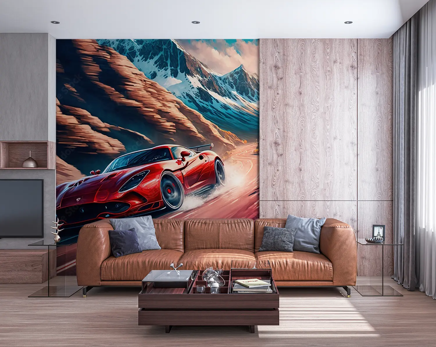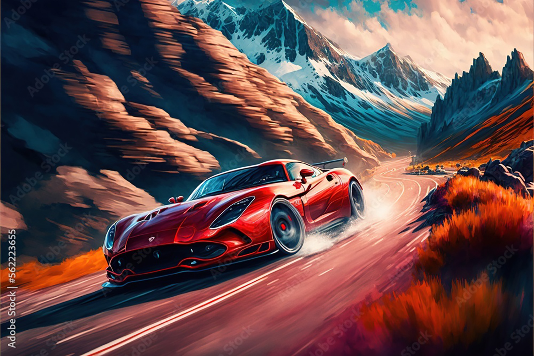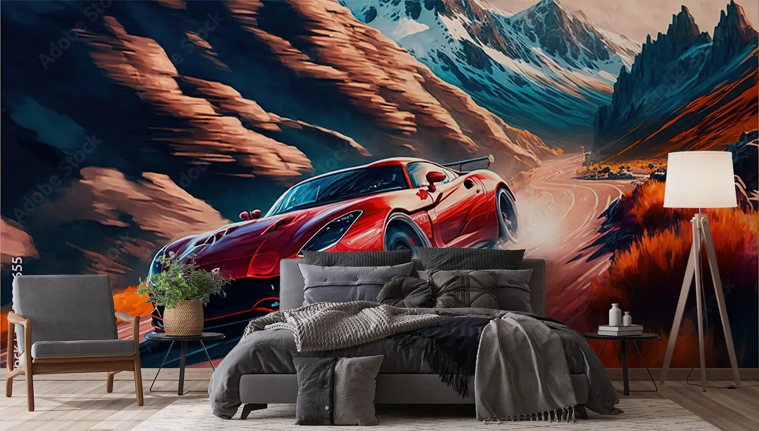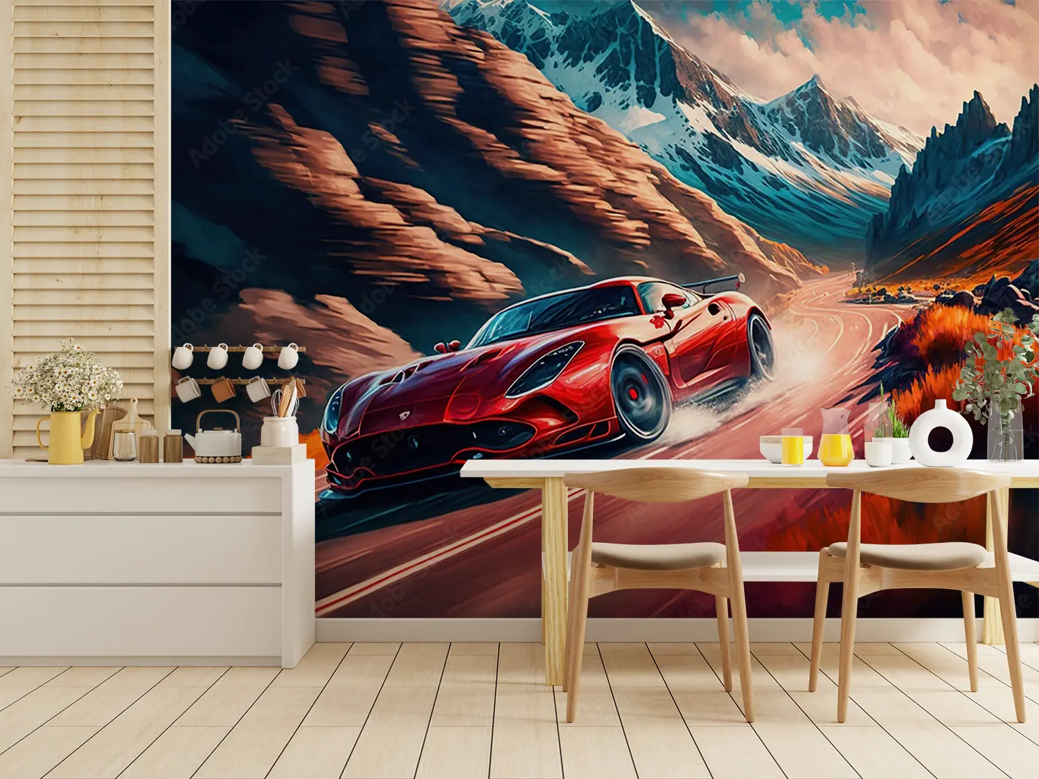Immerse yourself in the thrilling beauty of a red sports car driving through scenic mountains. This captivating wall art will add a dynamic touch to your home decor, perfect for car enthusiasts and adventure seekers. Complementary colors like deep navy, soft beige, and rustic terracotta will enhance the visual impact of this striking piece.