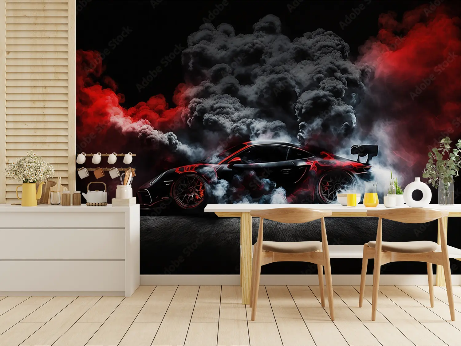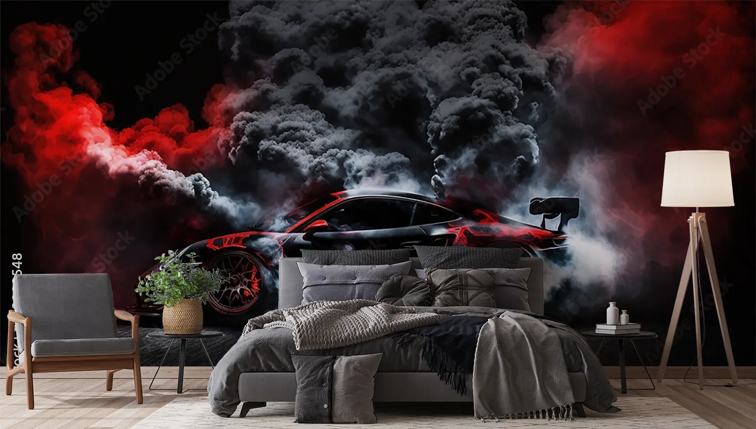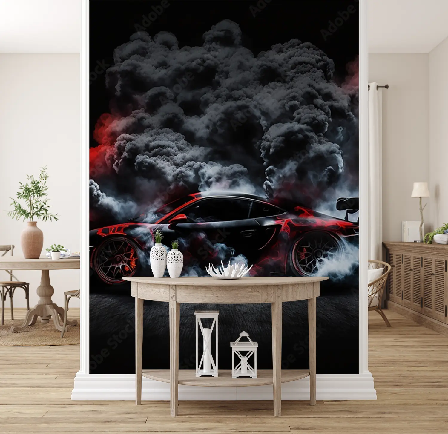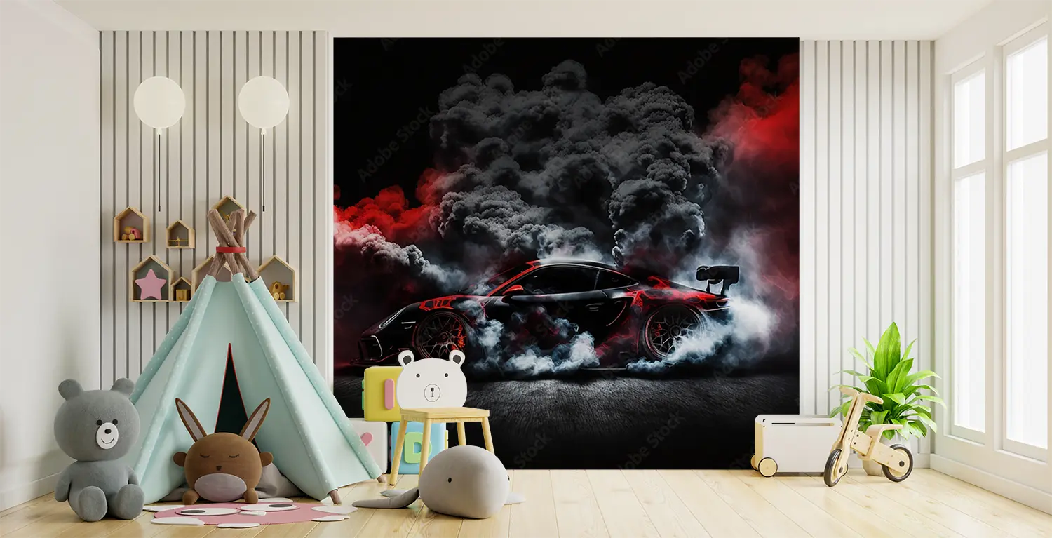 Elevate your space with a striking image of a red sports car emitting smoke, adding a dynamic and energetic touch to your home decor. The bold colors and sleek design will captivate any viewer, making it a perfect focal point for any room. Complementary colors include black, white, and shades of gray for a modern and stylish look.