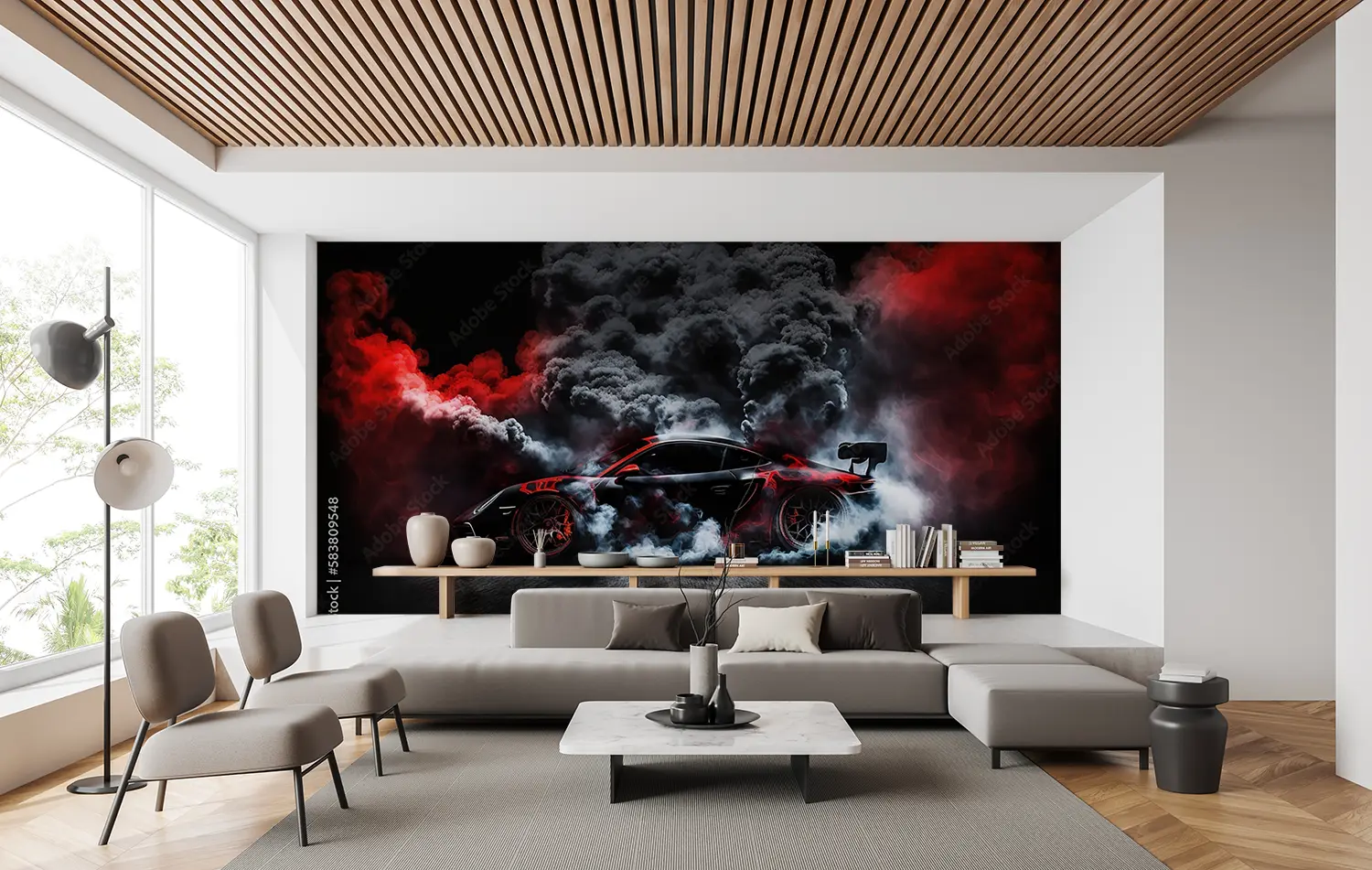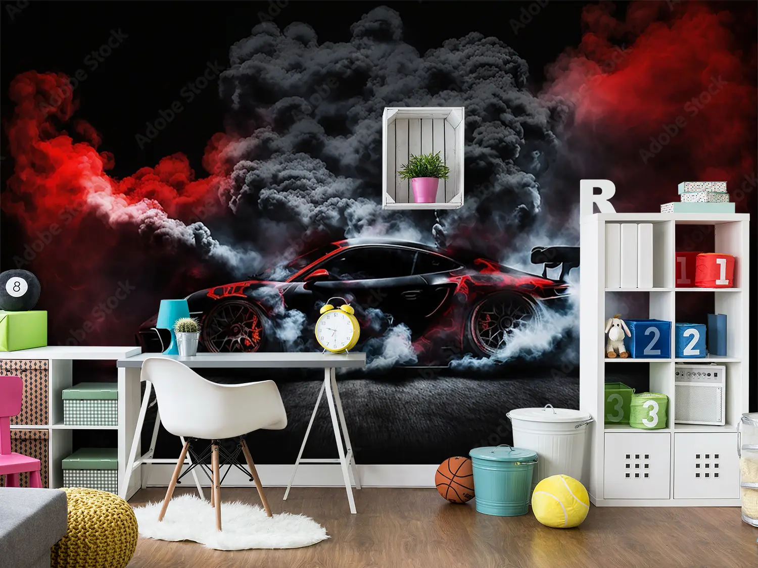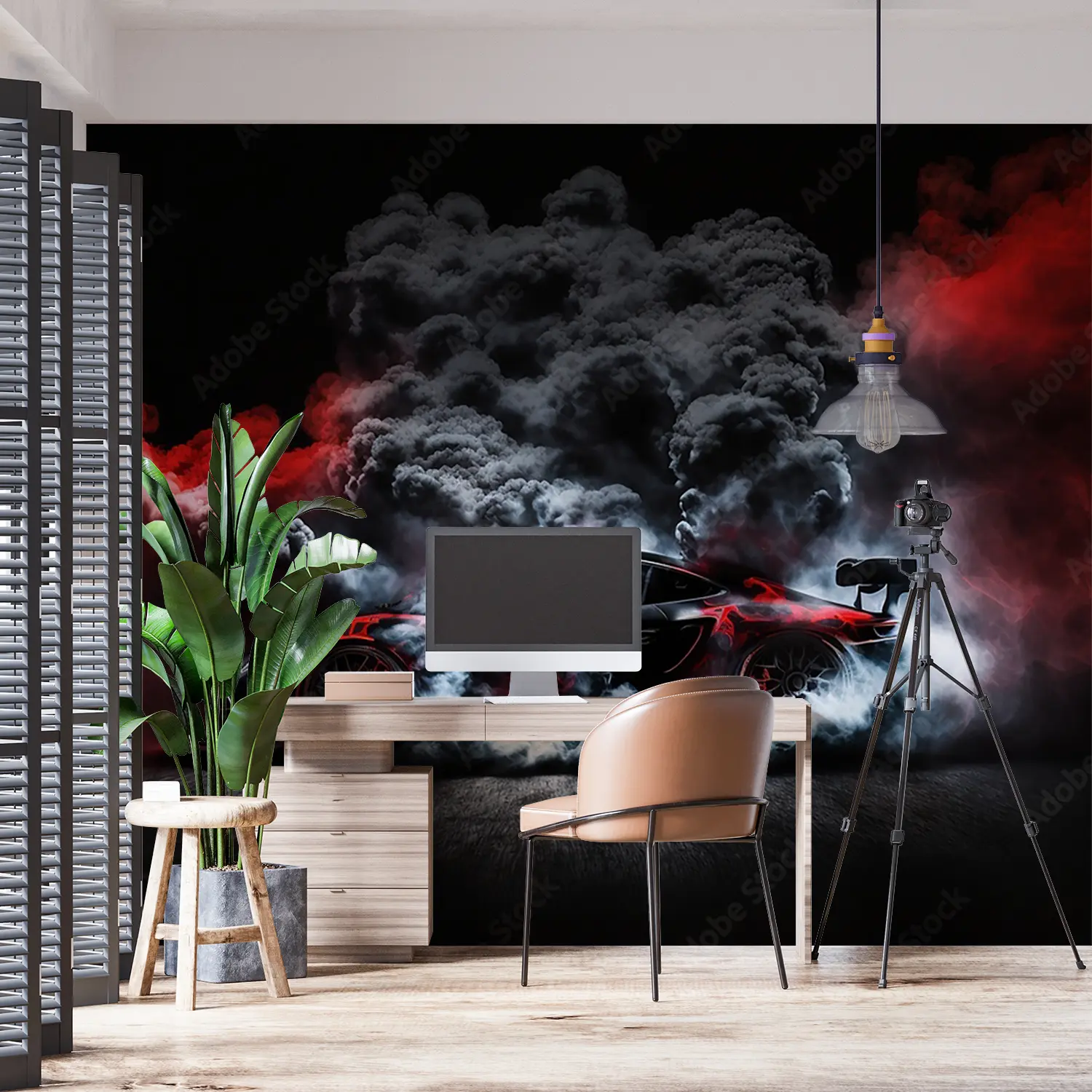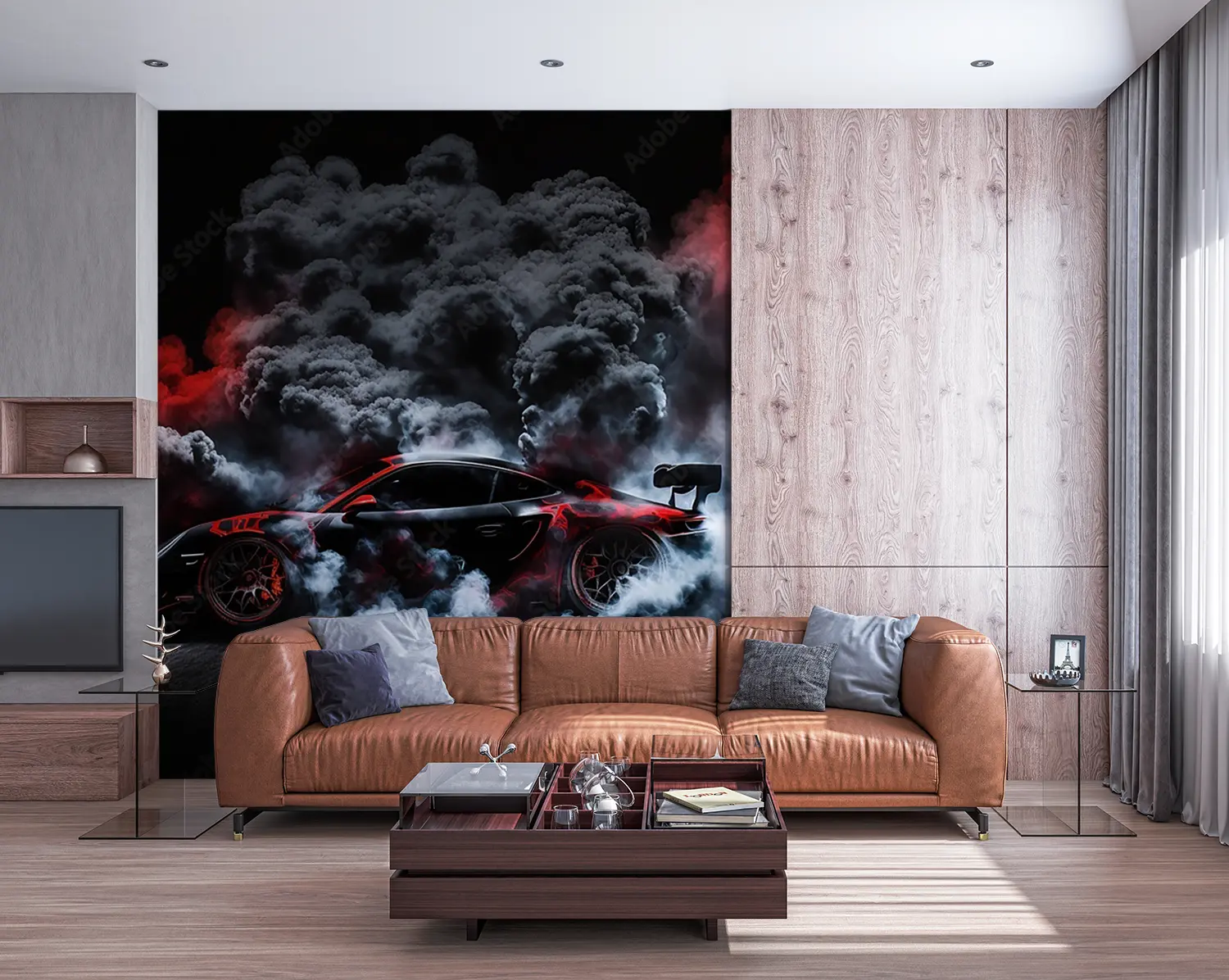 Elevate your space with a striking image of a red sports car emitting smoke, adding a dynamic and energetic touch to your home decor. The bold colors and sleek design will captivate any viewer, making it a perfect focal point for any room. Complementary colors include black, white, and shades of gray for a modern and stylish look.