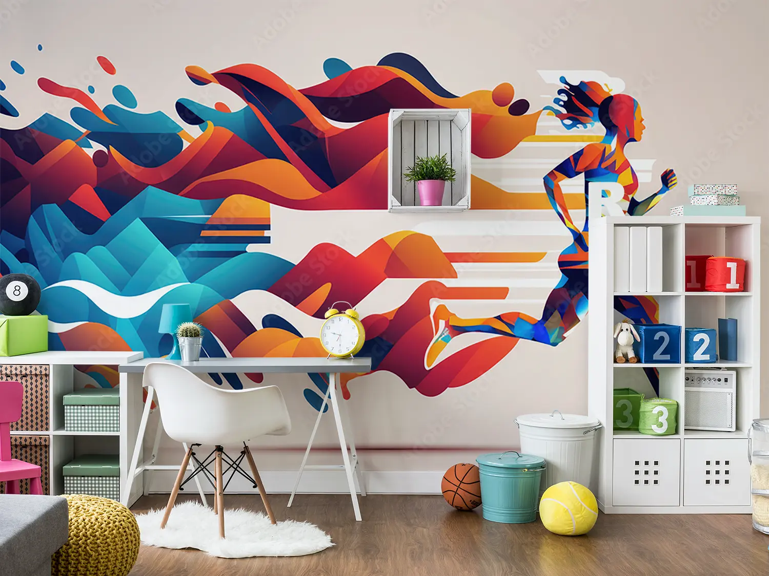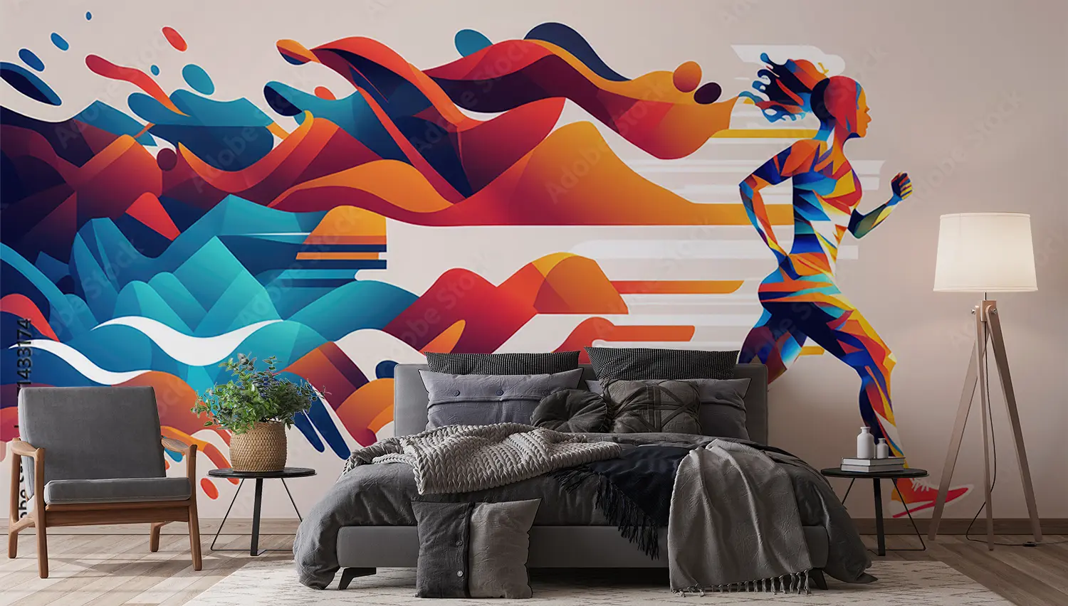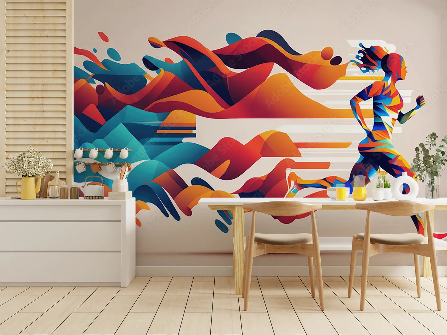 Transform your living space with this vibrant wall art featuring a dynamic scene of a person running against a colorful abstract background. The energetic composition adds a touch of movement and excitement to your home decor. Complementary colors like deep blue, fiery red, and soft pink will enhance the visual impact of this captivating artwork.