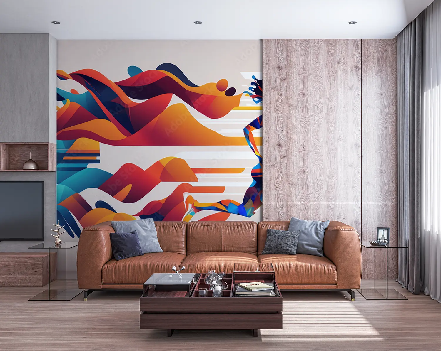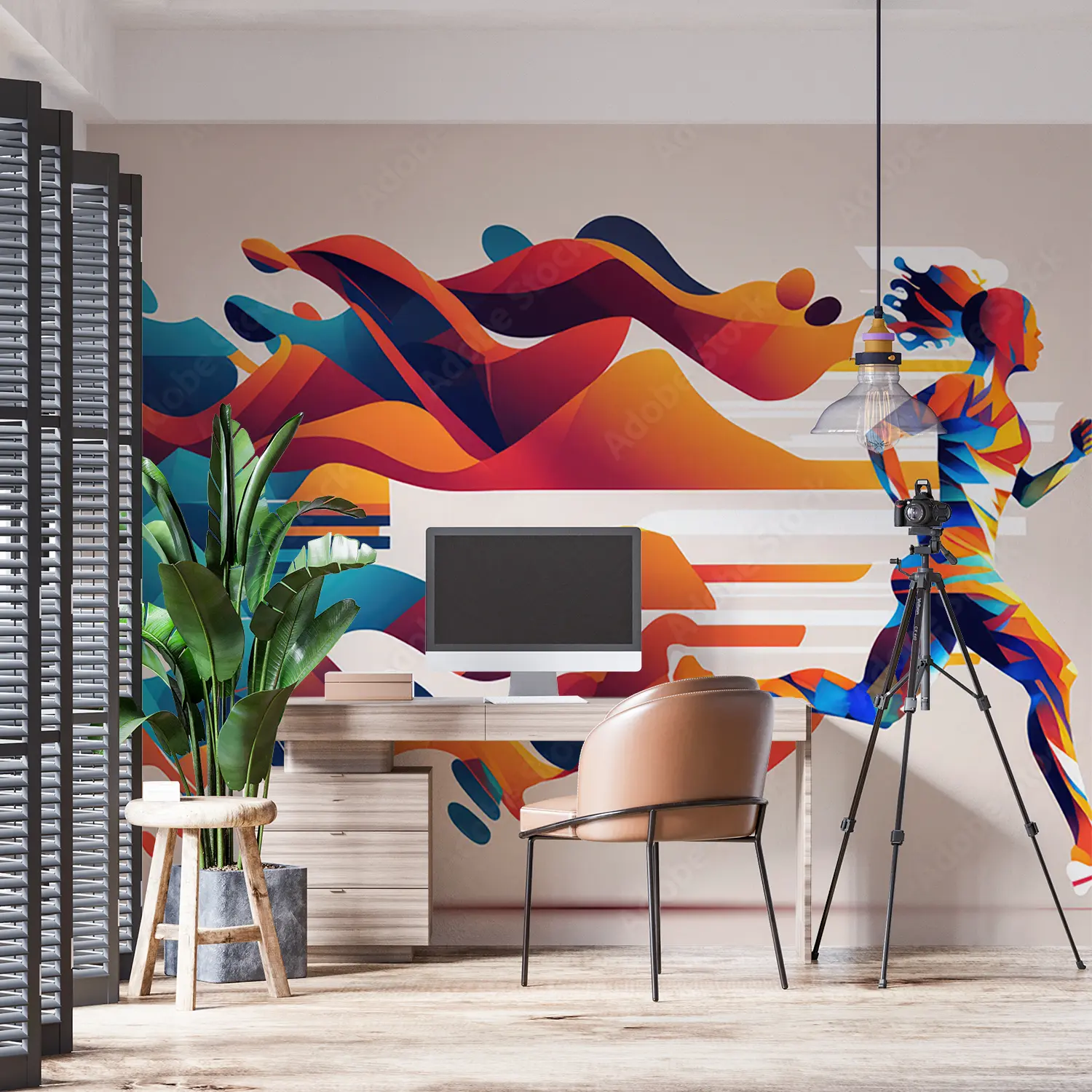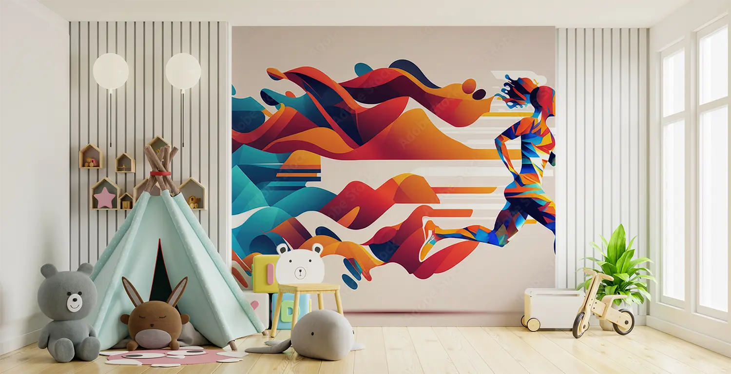 Transform your living space with this vibrant wall art featuring a dynamic scene of a person running against a colorful abstract background. The energetic composition adds a touch of movement and excitement to your home decor. Complementary colors like deep blue, fiery red, and soft pink will enhance the visual impact of this captivating artwork.