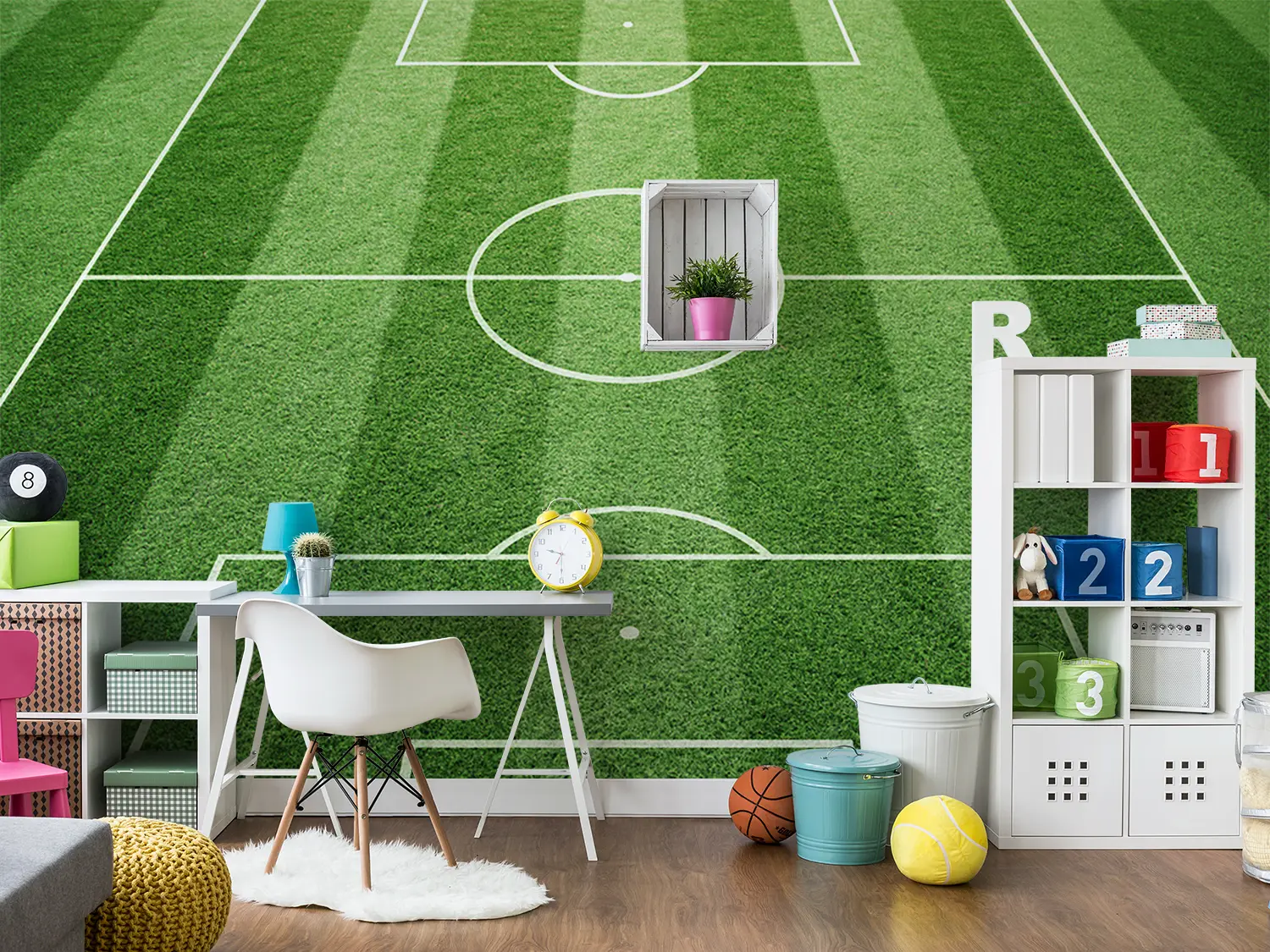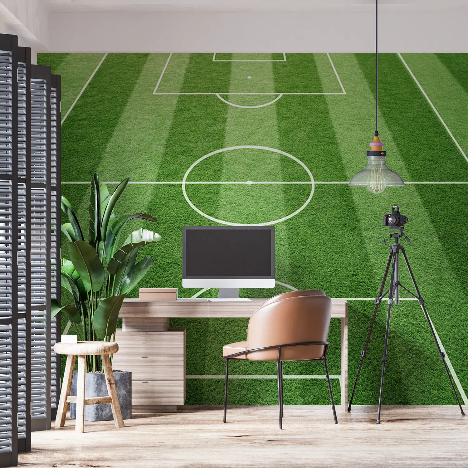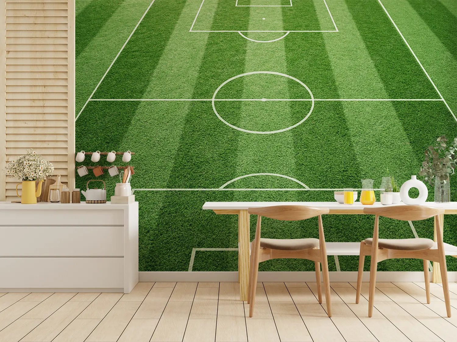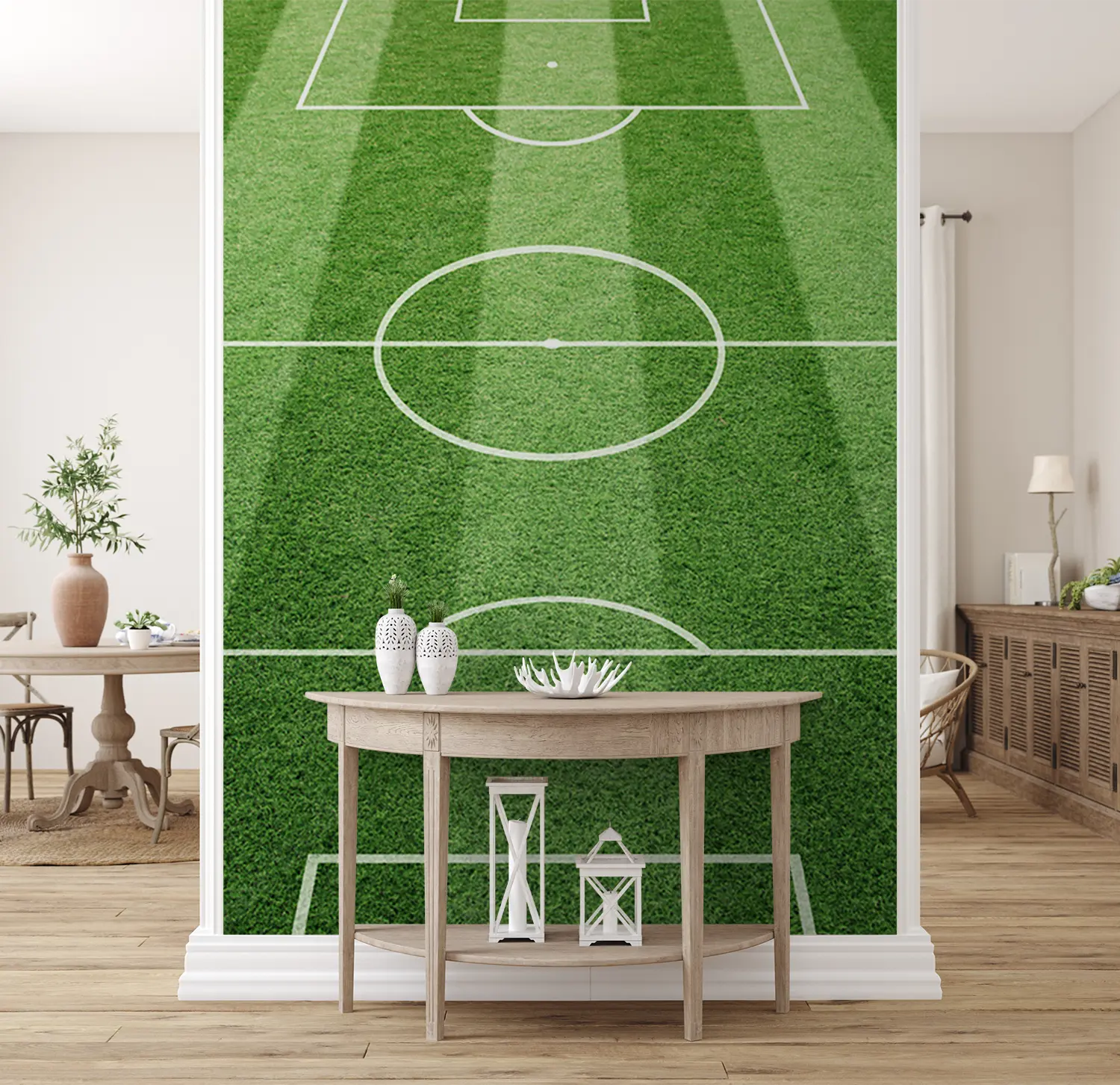 Transform your space with this captivating soccer field art piece, featuring dynamic lines and a pop of green grass. Add a touch of athleticism and energy to your home decor with this eye-catching mural. Complementary colors include shades of green, white, and earth tones for a harmonious and lively ambiance. Perfect for sports enthusiasts and design lovers alike.