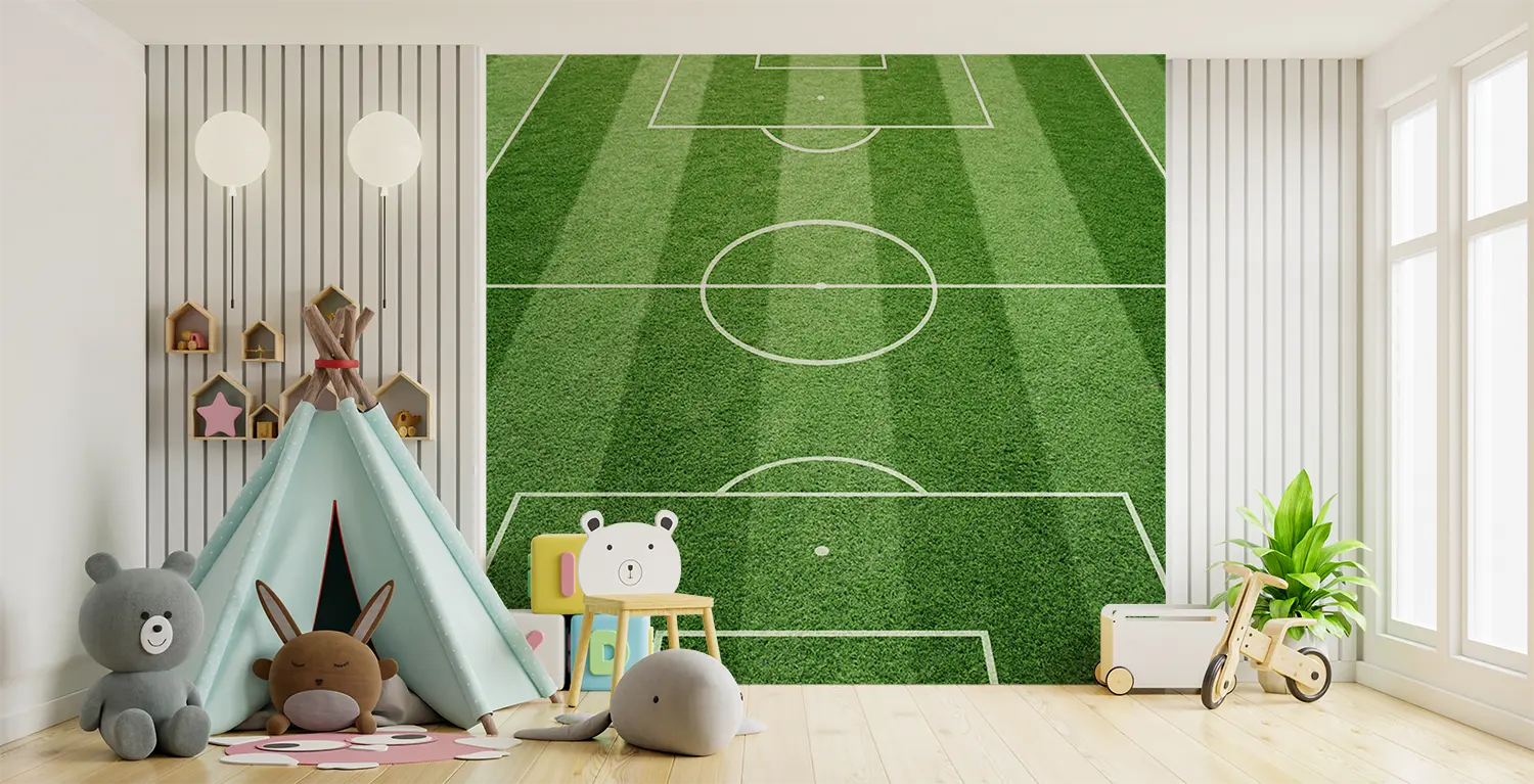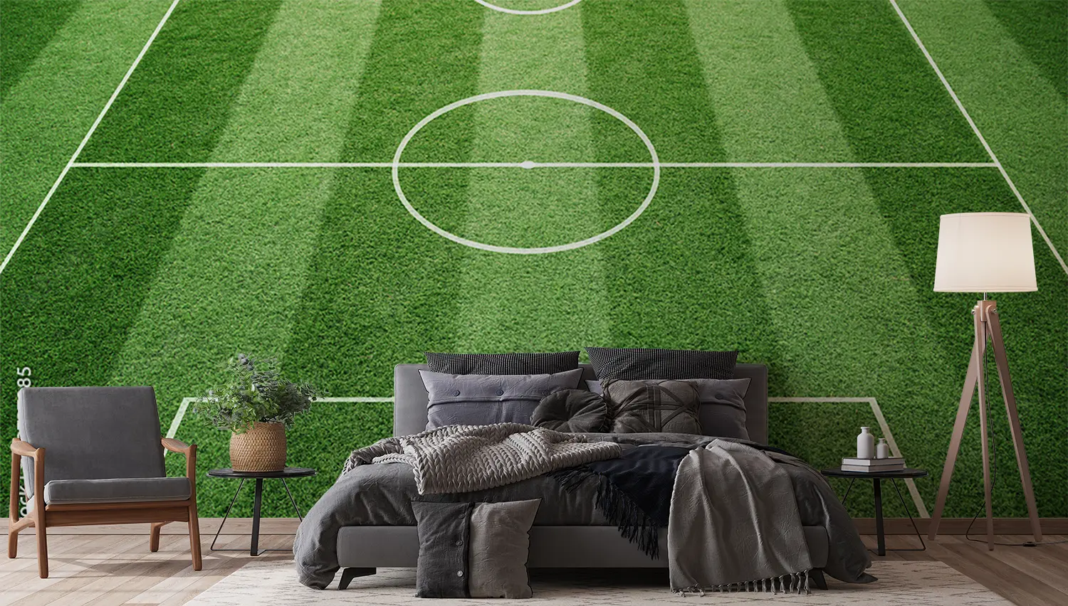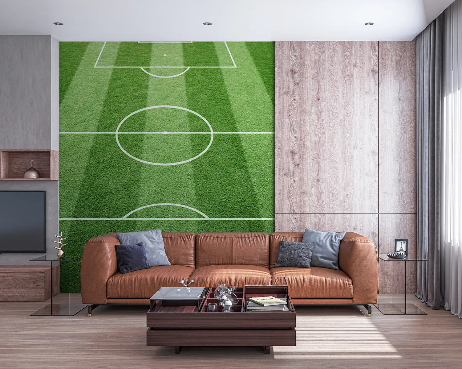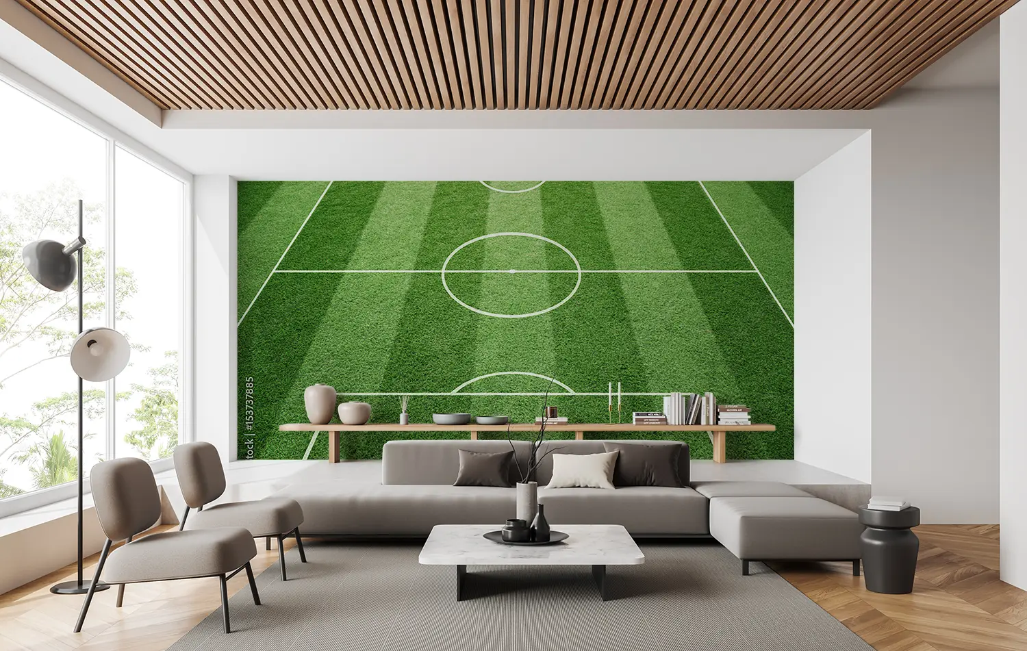 Transform your space with this captivating soccer field art piece, featuring dynamic lines and a pop of green grass. Add a touch of athleticism and energy to your home decor with this eye-catching mural. Complementary colors include shades of green, white, and earth tones for a harmonious and lively ambiance. Perfect for sports enthusiasts and design lovers alike.