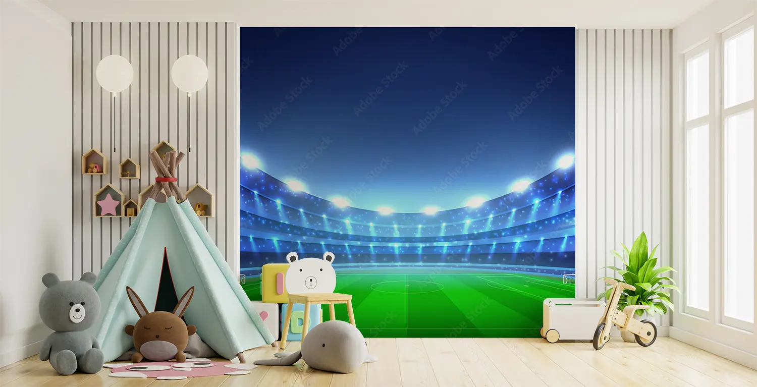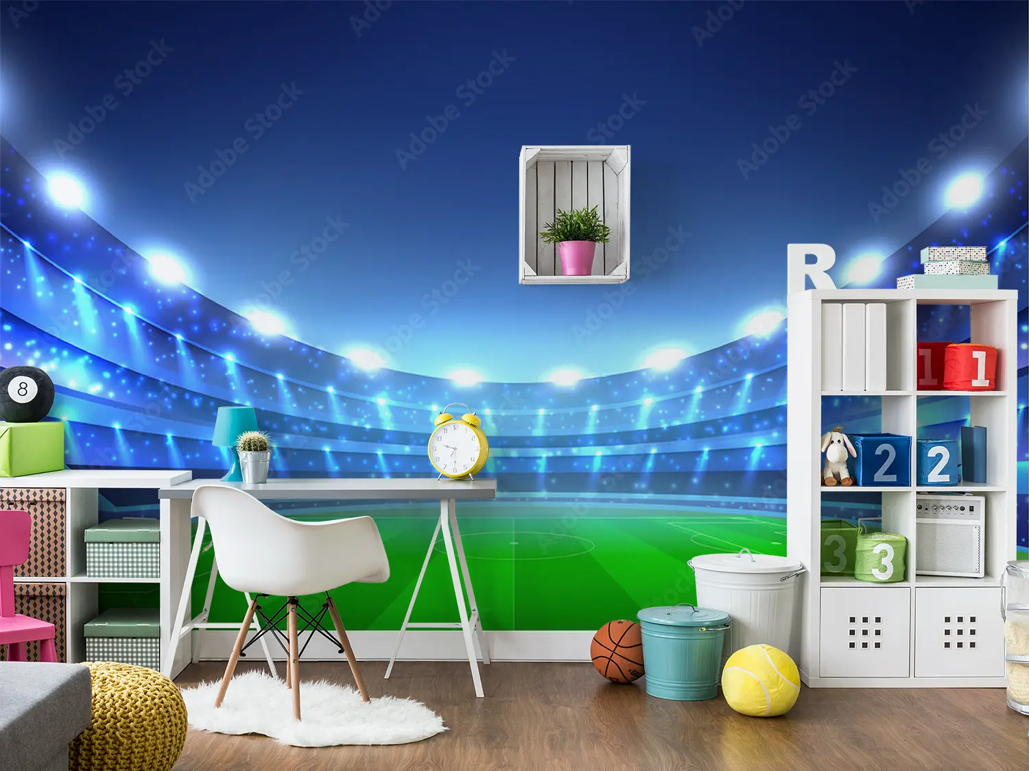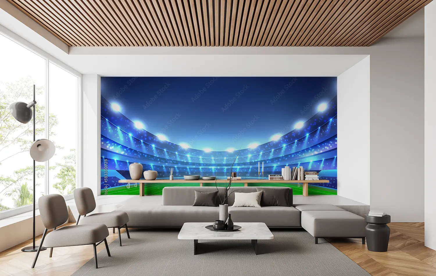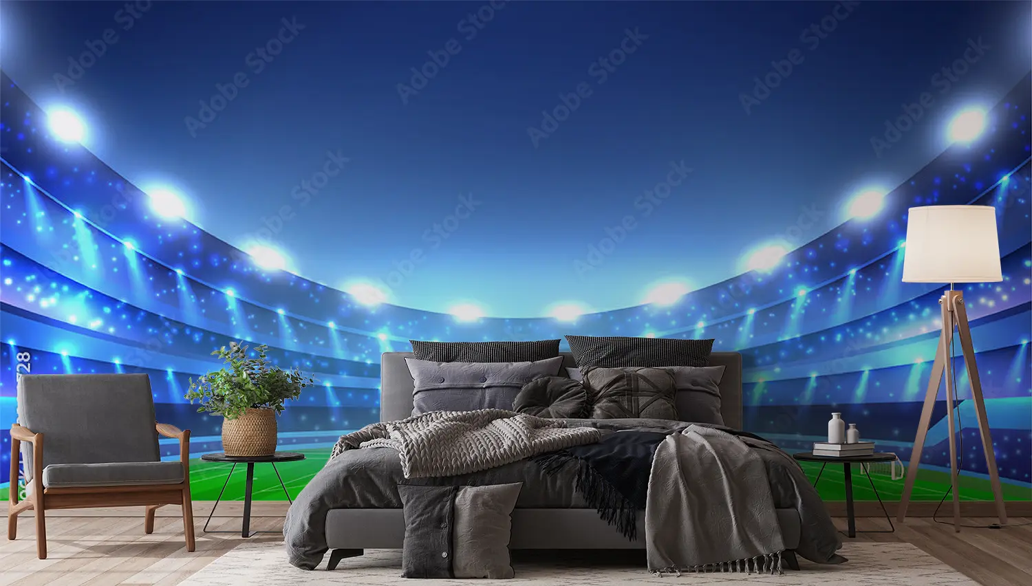 Elevate your space with this captivating image of a soccer stadium, featuring a lush green field and dazzling blue lights. Perfect for sports enthusiasts and art lovers alike, this wall art adds a dynamic touch to any room. Pair it with accents in shades of blue, green, and white to create a cohesive and inviting atmosphere.