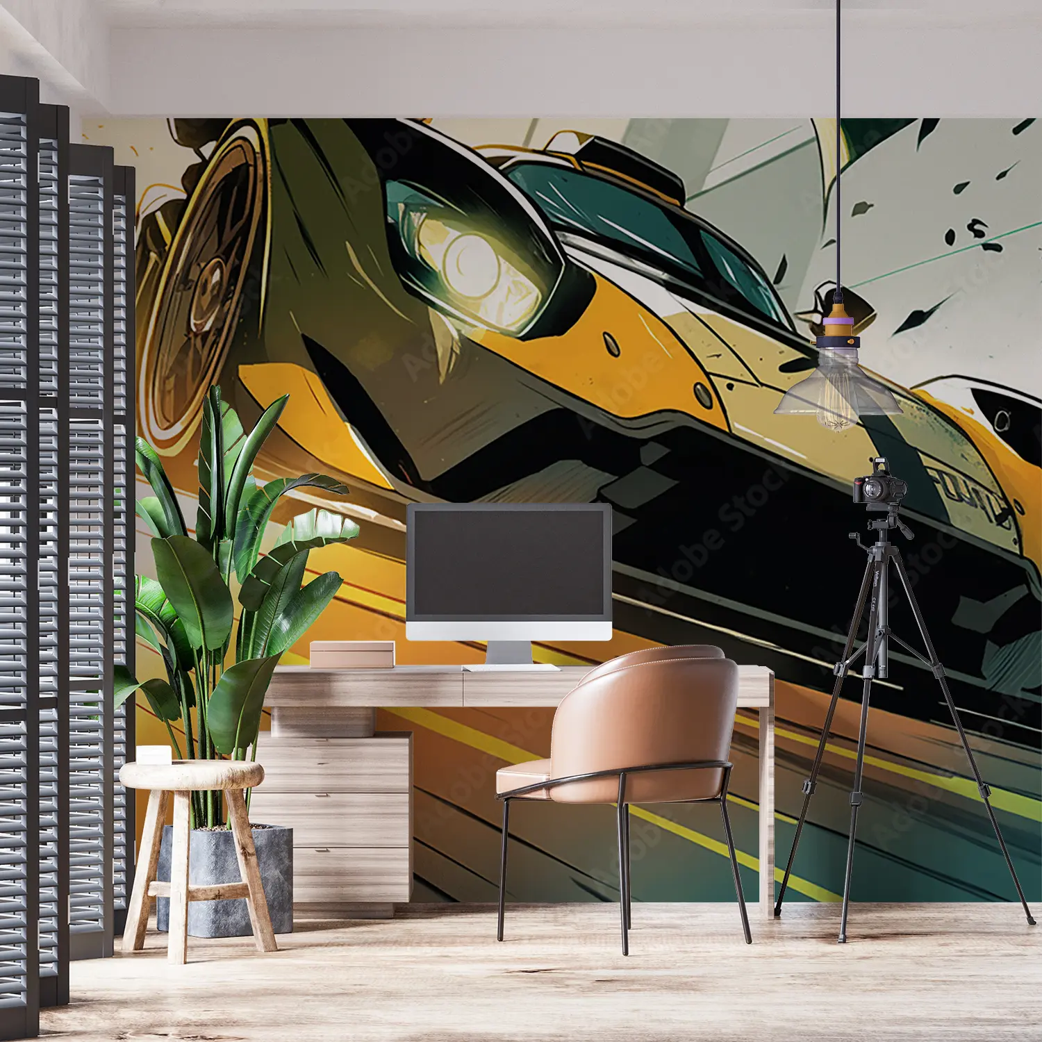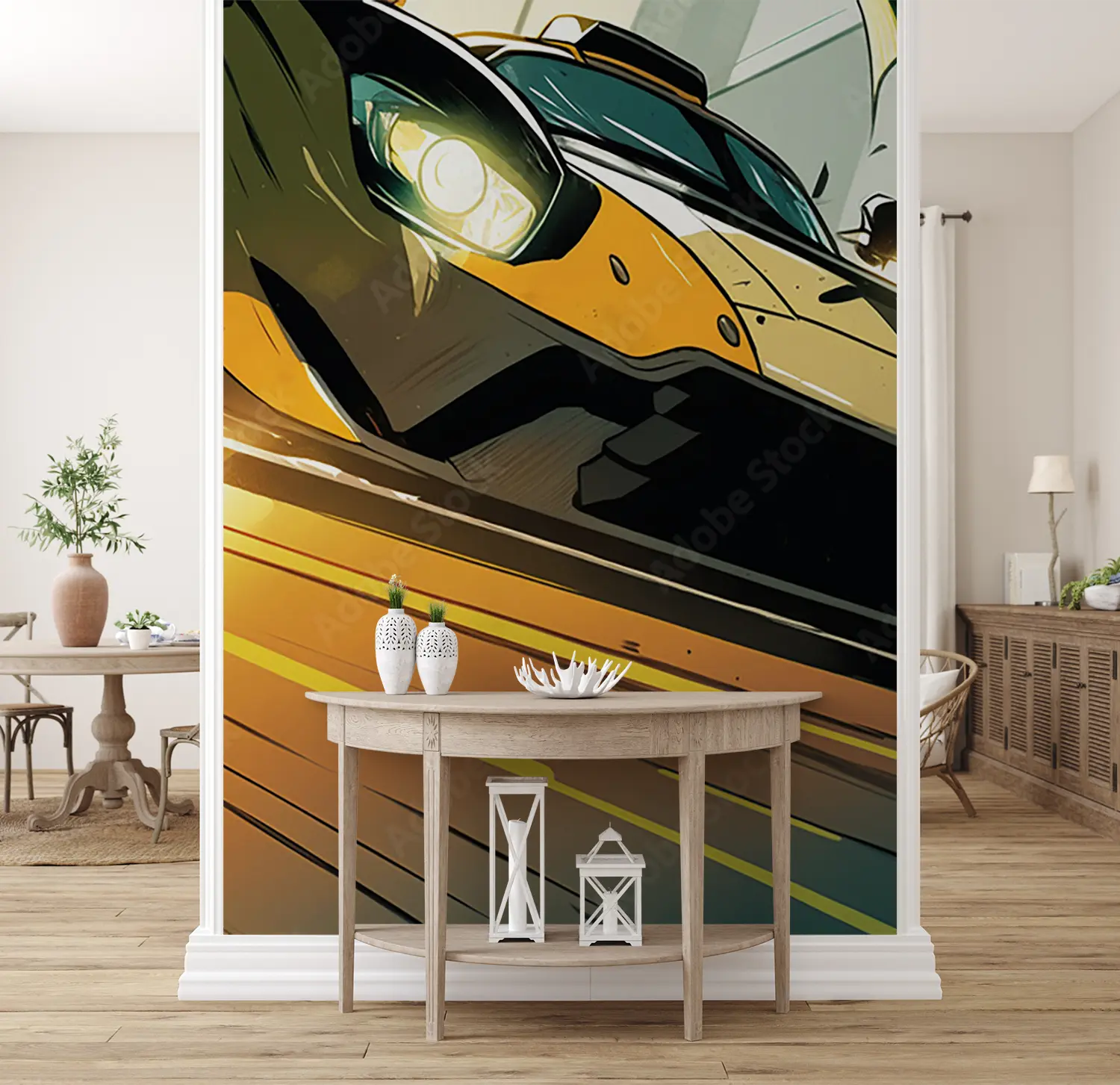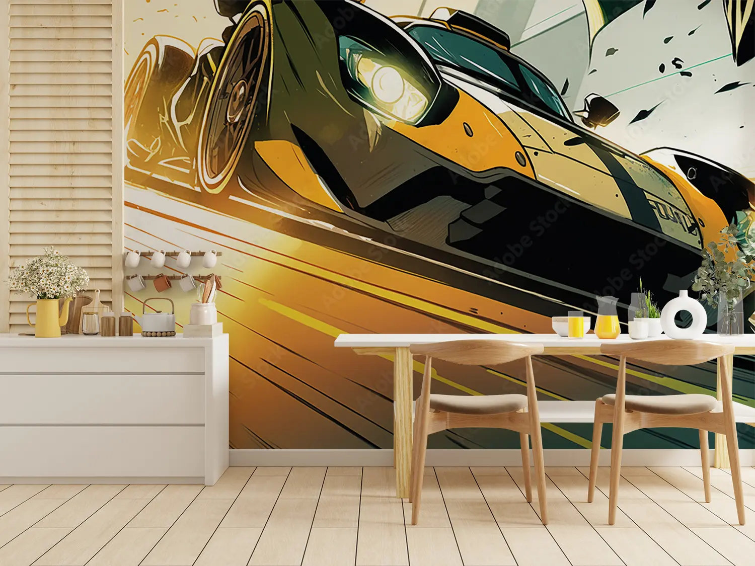 Dive into the dynamic world of racing with this captivating wall art featuring a yellow sports car speeding down a track. Add a touch of excitement and energy to your space with this visually striking piece. Complementary colors like black, white, and shades of grey will enhance the overall aesthetic appeal of your room.