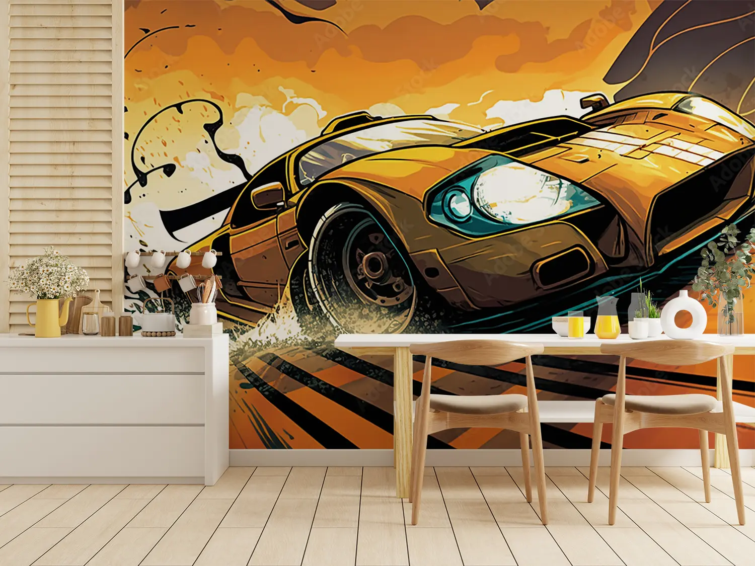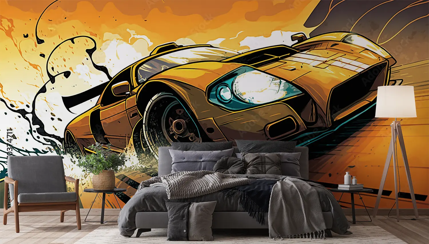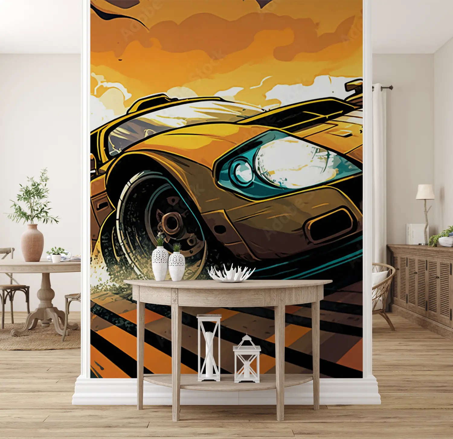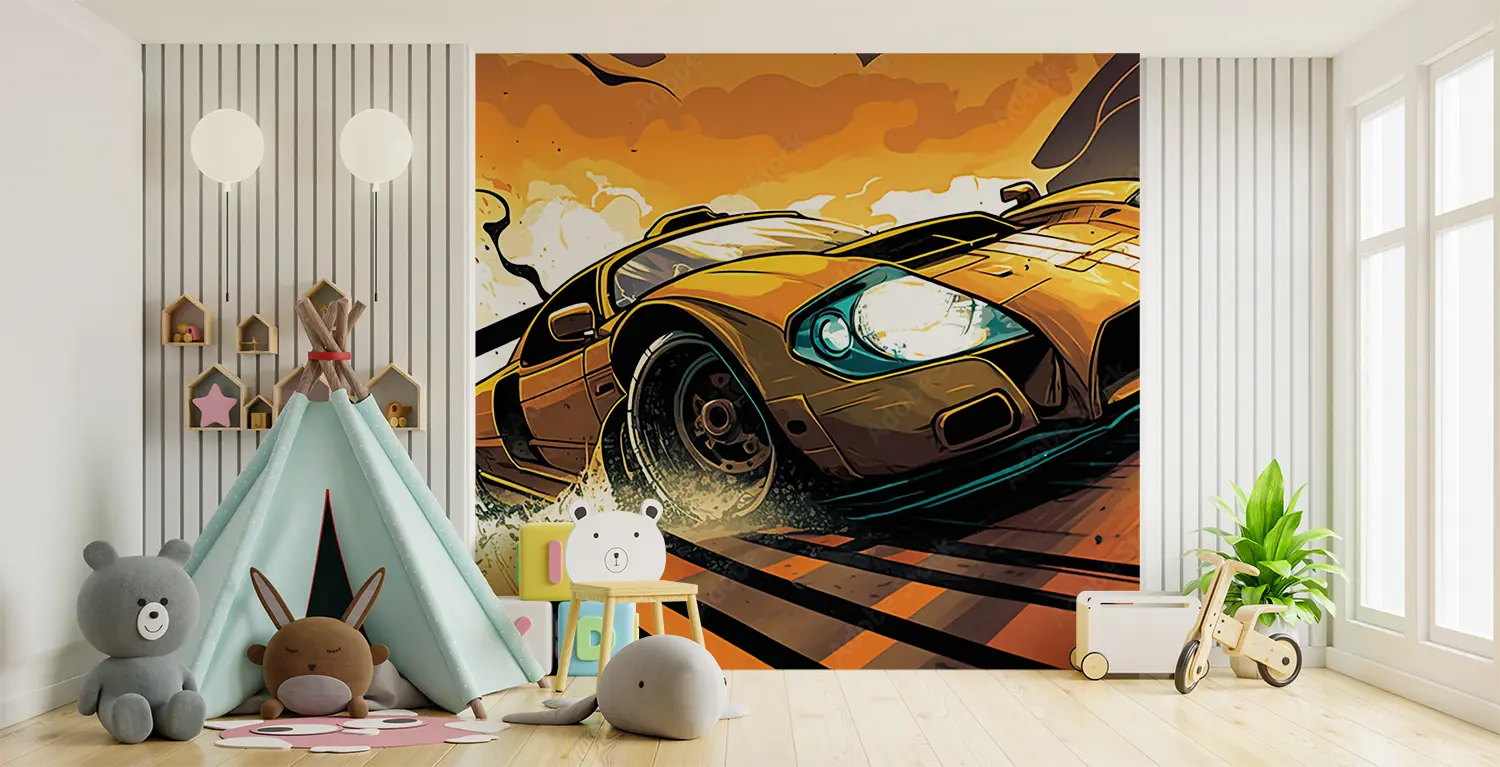 Transform your space with this captivating wall art featuring a yellow sports car racing on a track with a splash of water. The dynamic composition and bold colors will add a touch of excitement to any room, making it a perfect choice for home decor. Complementary colors to consider include black, white, and shades of blue for a cohesive look.