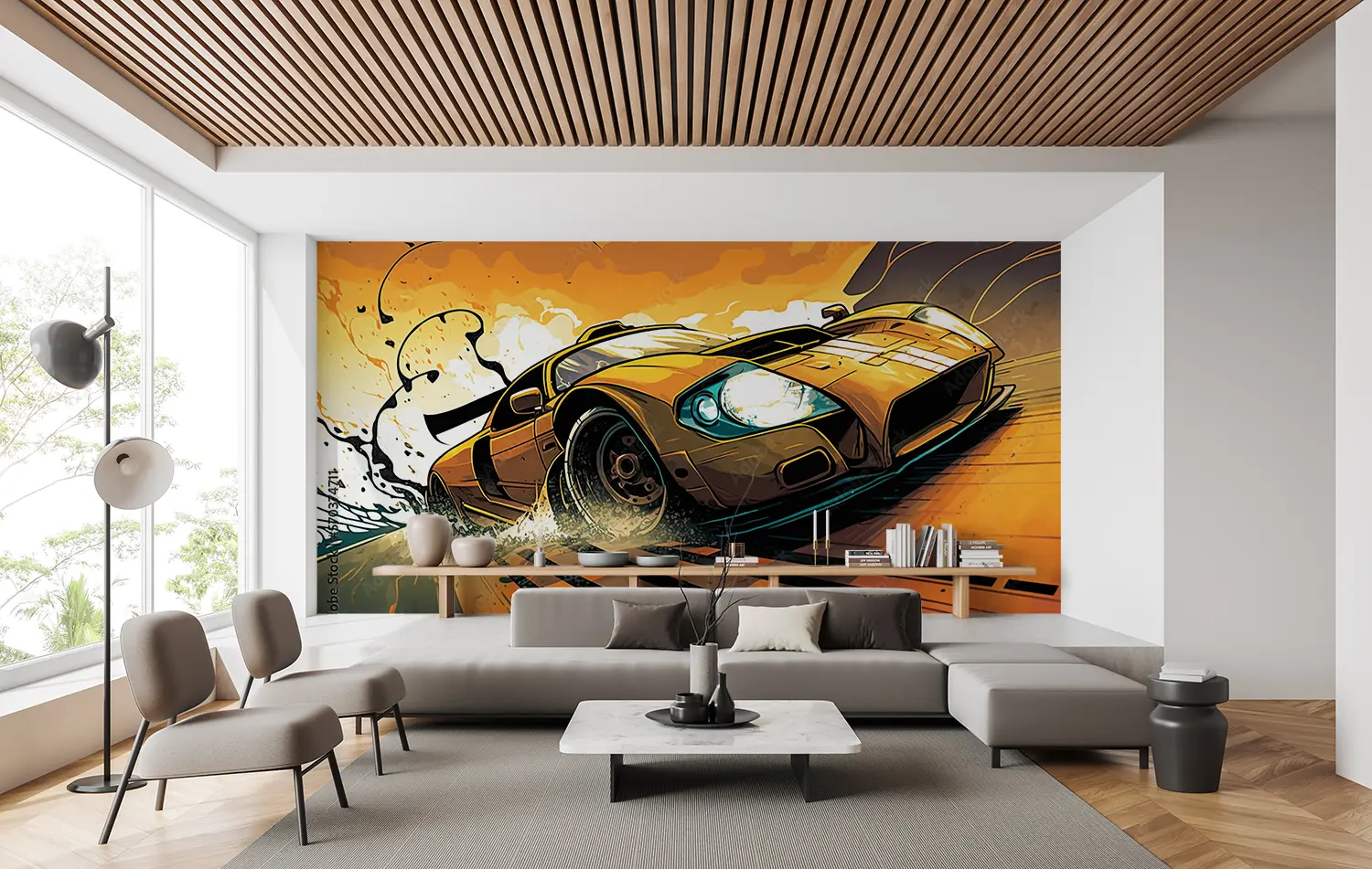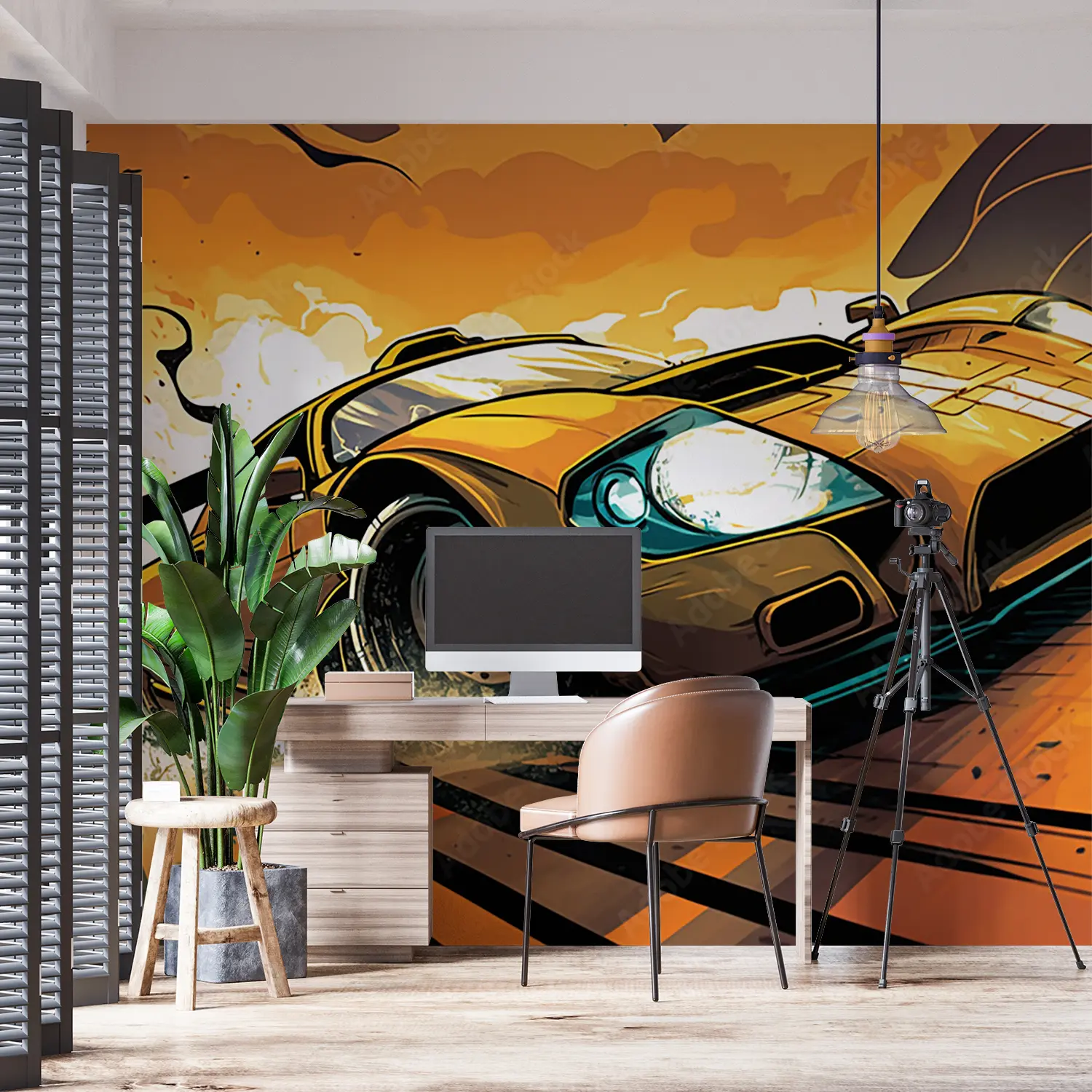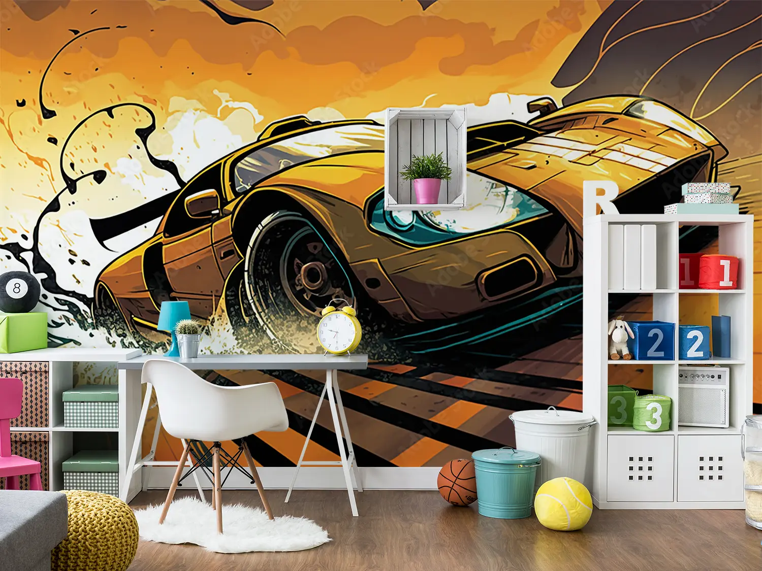 Transform your space with this captivating wall art featuring a yellow sports car racing on a track with a splash of water. The dynamic composition and bold colors will add a touch of excitement to any room, making it a perfect choice for home decor. Complementary colors to consider include black, white, and shades of blue for a cohesive look.