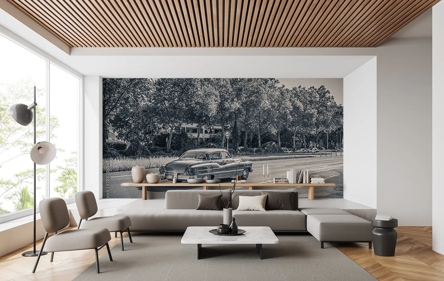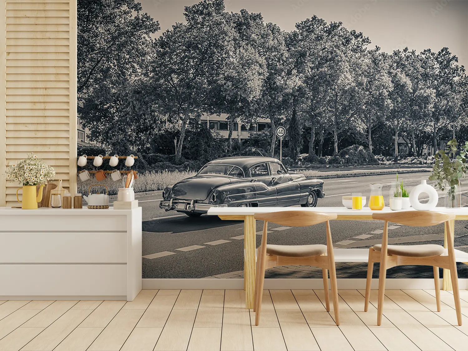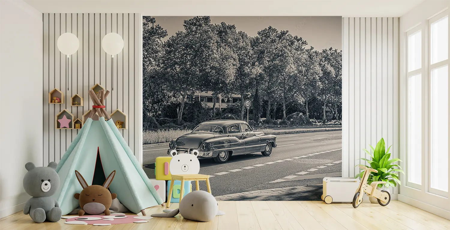 Transform your space with the timeless charm of a vintage car cruising through a picturesque forest. This captivating wall art adds a touch of nostalgia and sophistication to your home decor. Pair it with earthy tones like forest green and rustic brown to enhance the cozy ambiance of any room. Upgrade your walls with this mesmerizing scene today.