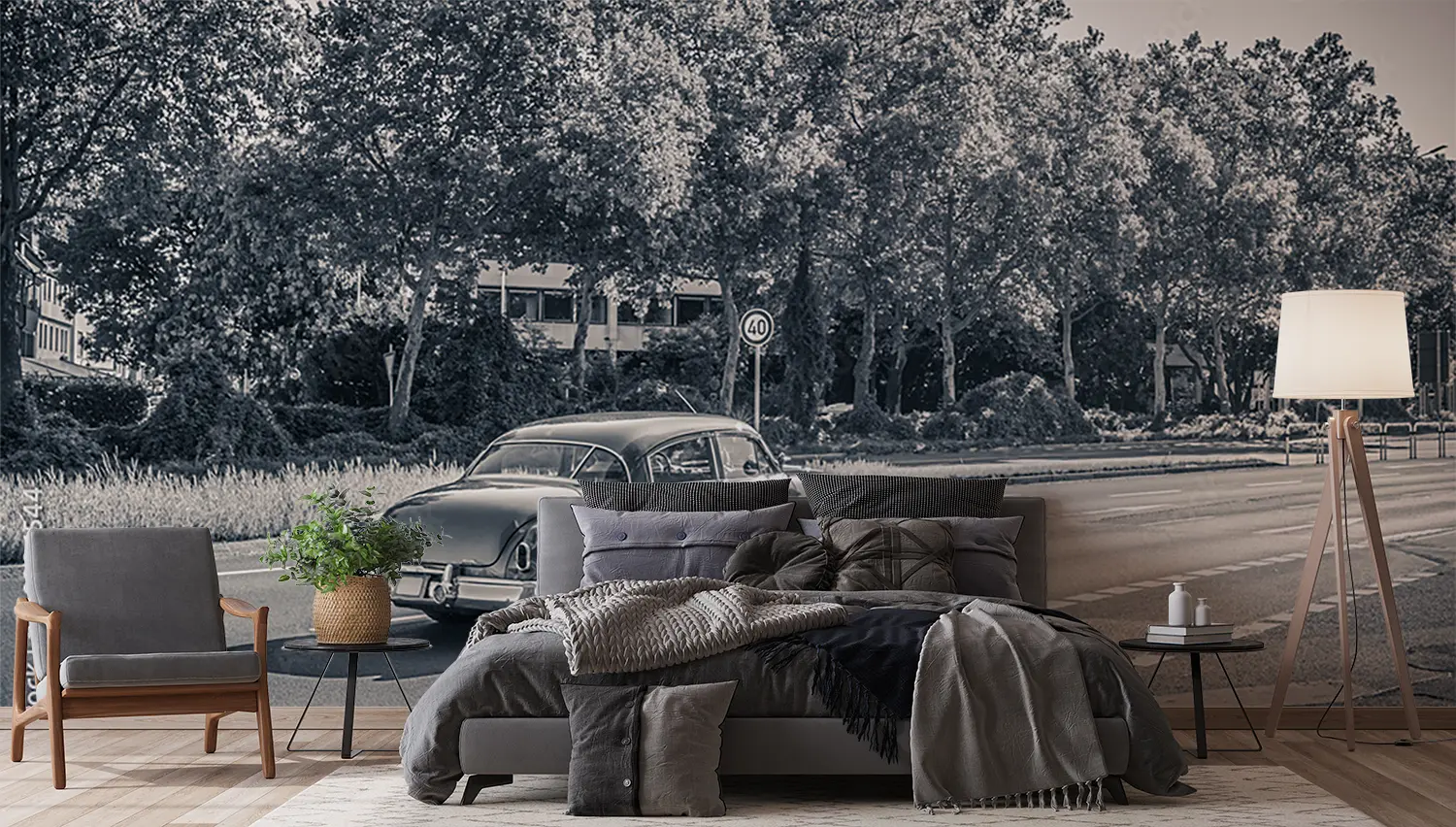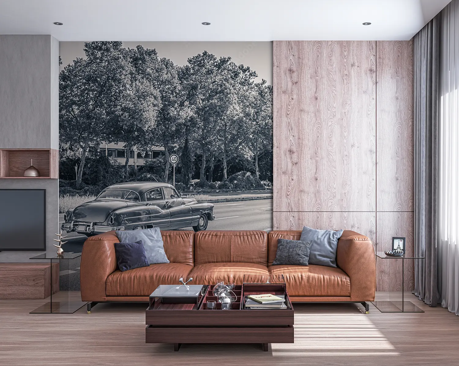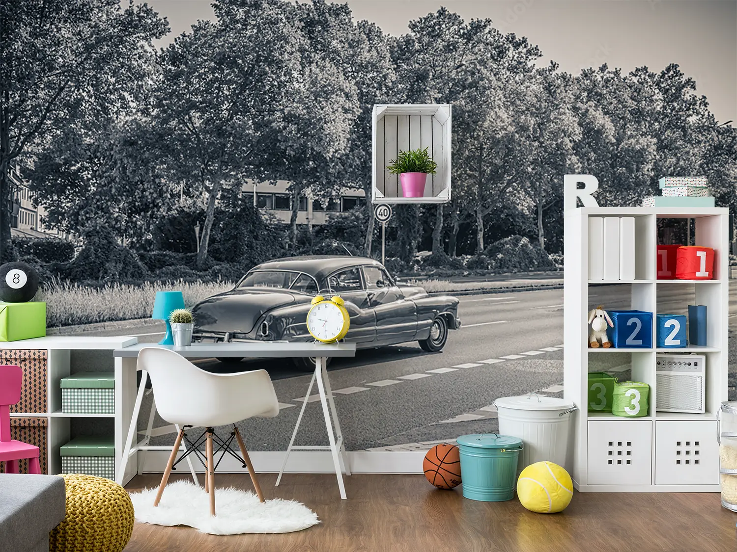 Transform your space with the timeless charm of a vintage car cruising through a picturesque forest. This captivating wall art adds a touch of nostalgia and sophistication to your home decor. Pair it with earthy tones like forest green and rustic brown to enhance the cozy ambiance of any room. Upgrade your walls with this mesmerizing scene today.