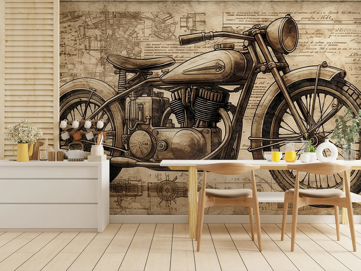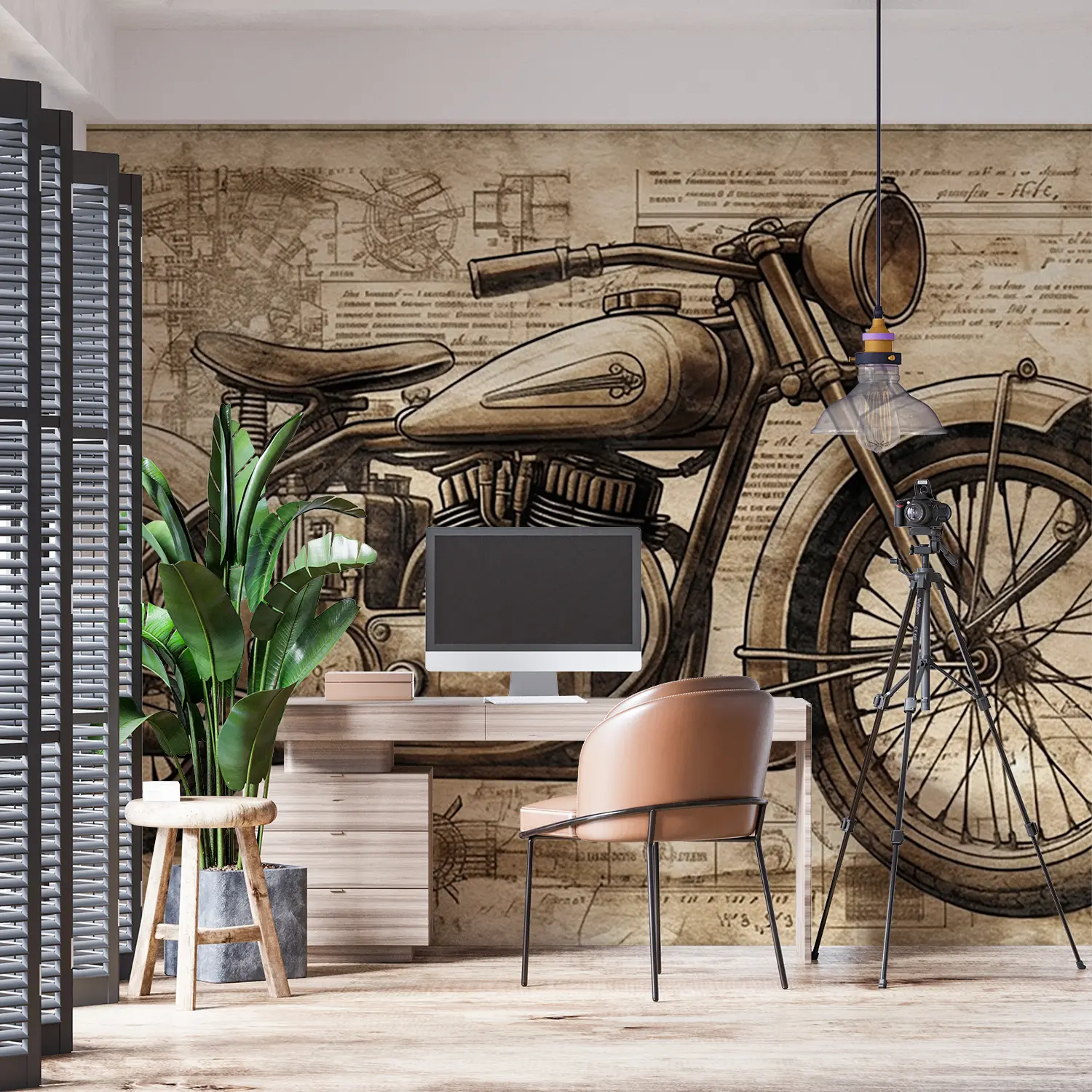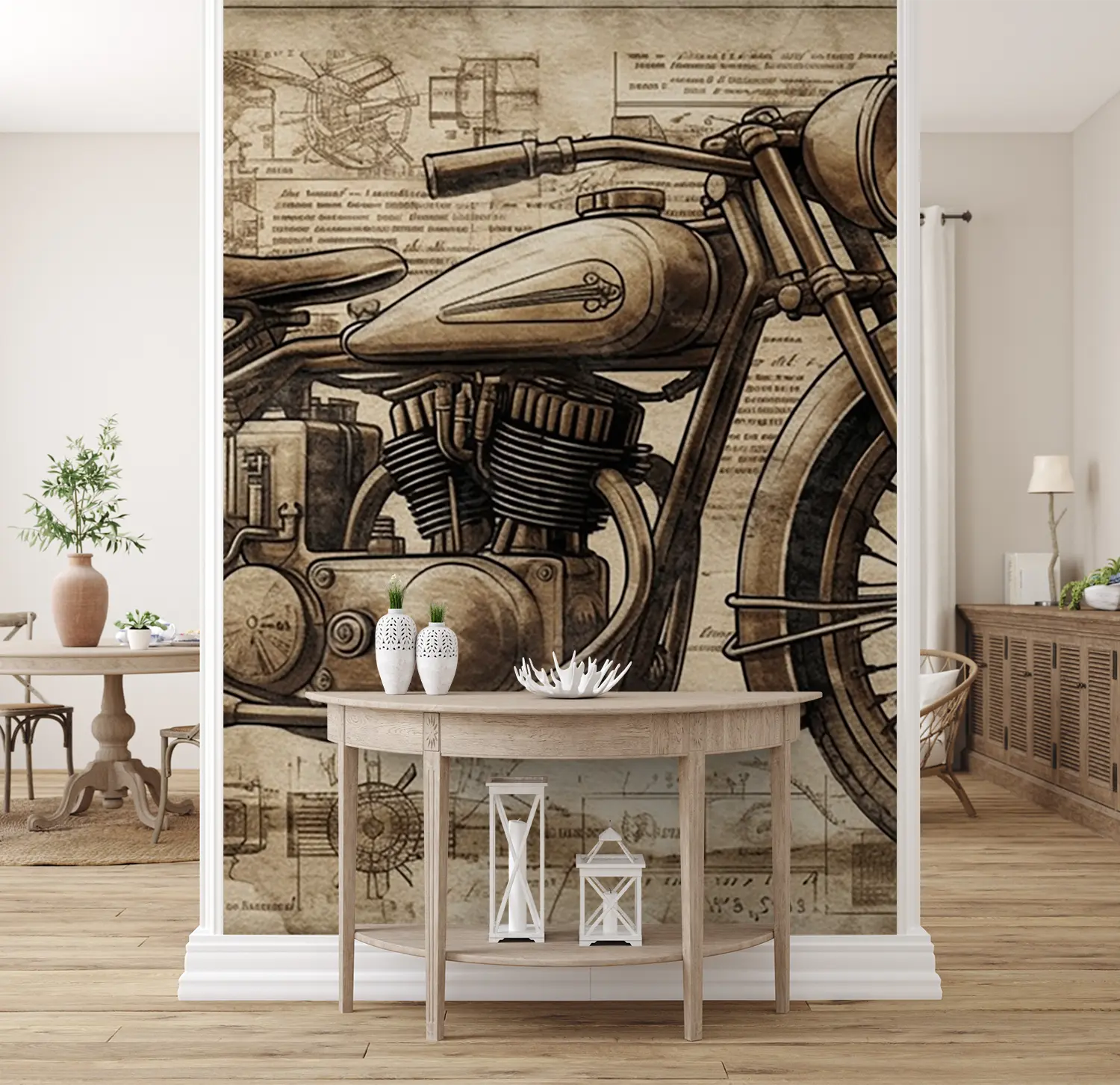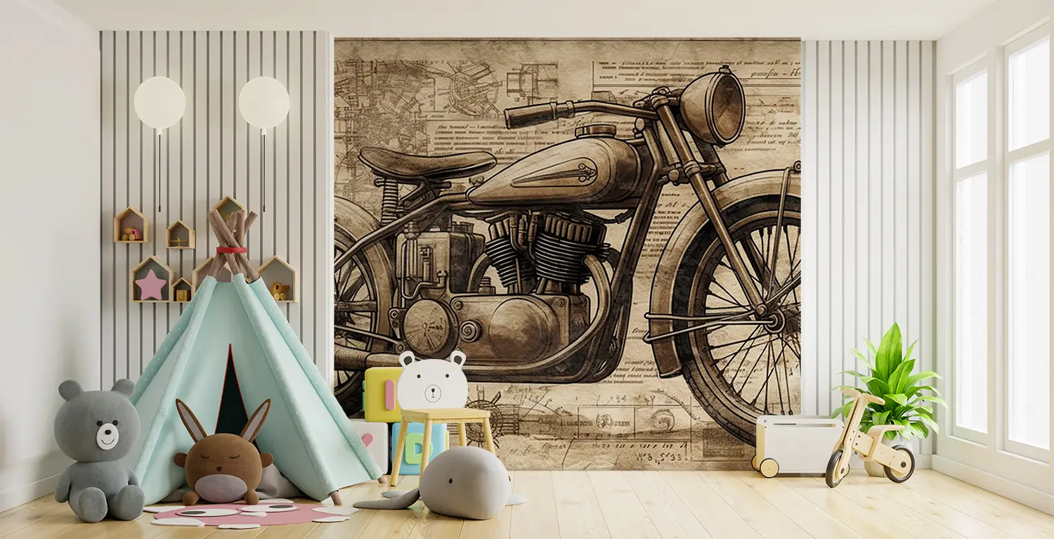 Transform your space with a captivating vintage motorcycle drawing that exudes artistic charm. This piece adds a touch of nostalgia and personality to any room, making it a focal point of your home decor. Complementary colors to consider include warm browns, soft creams, and deep greys for a cohesive and inviting ambiance.