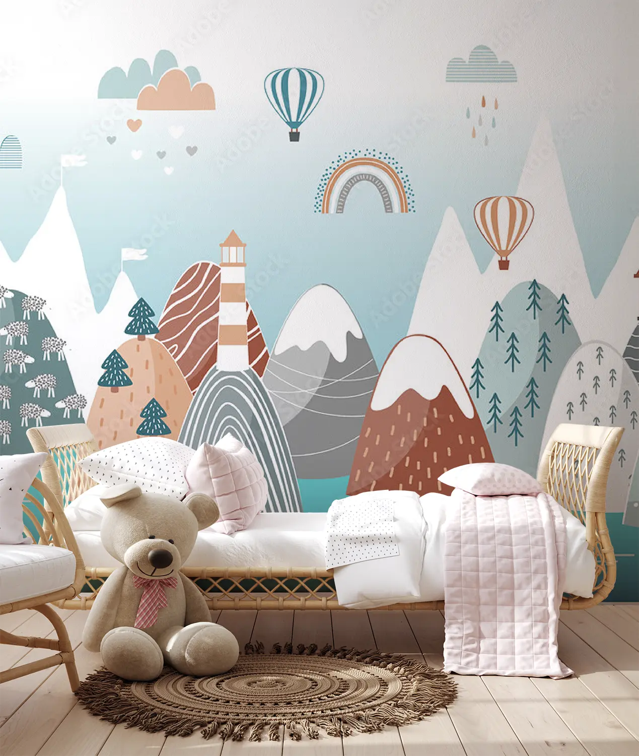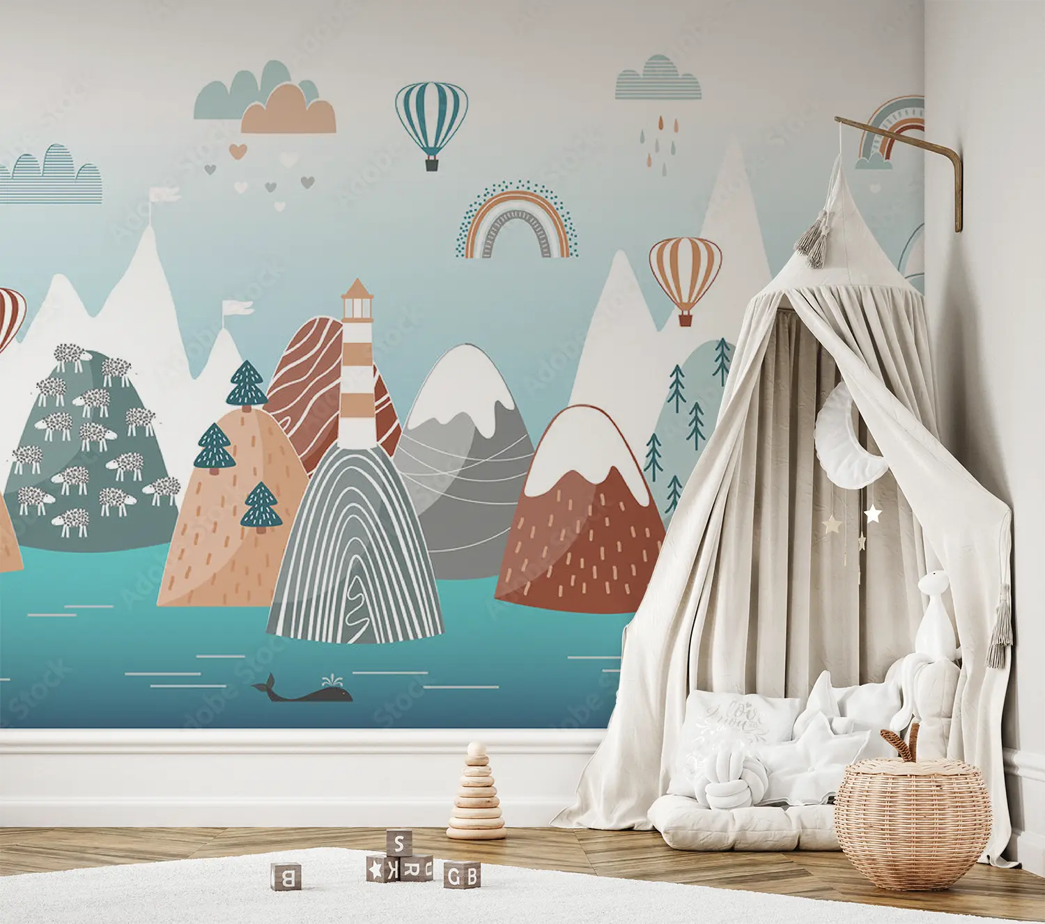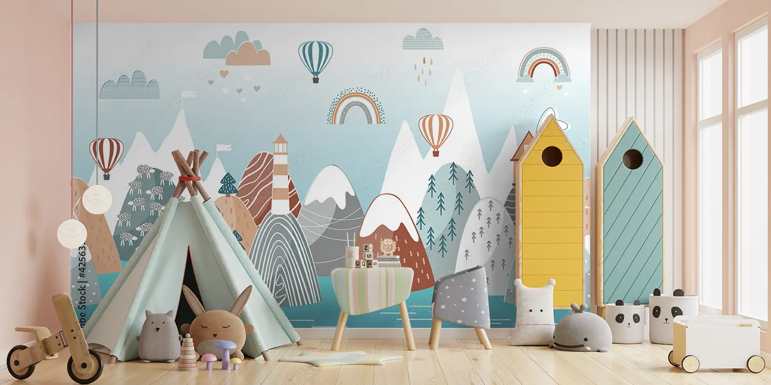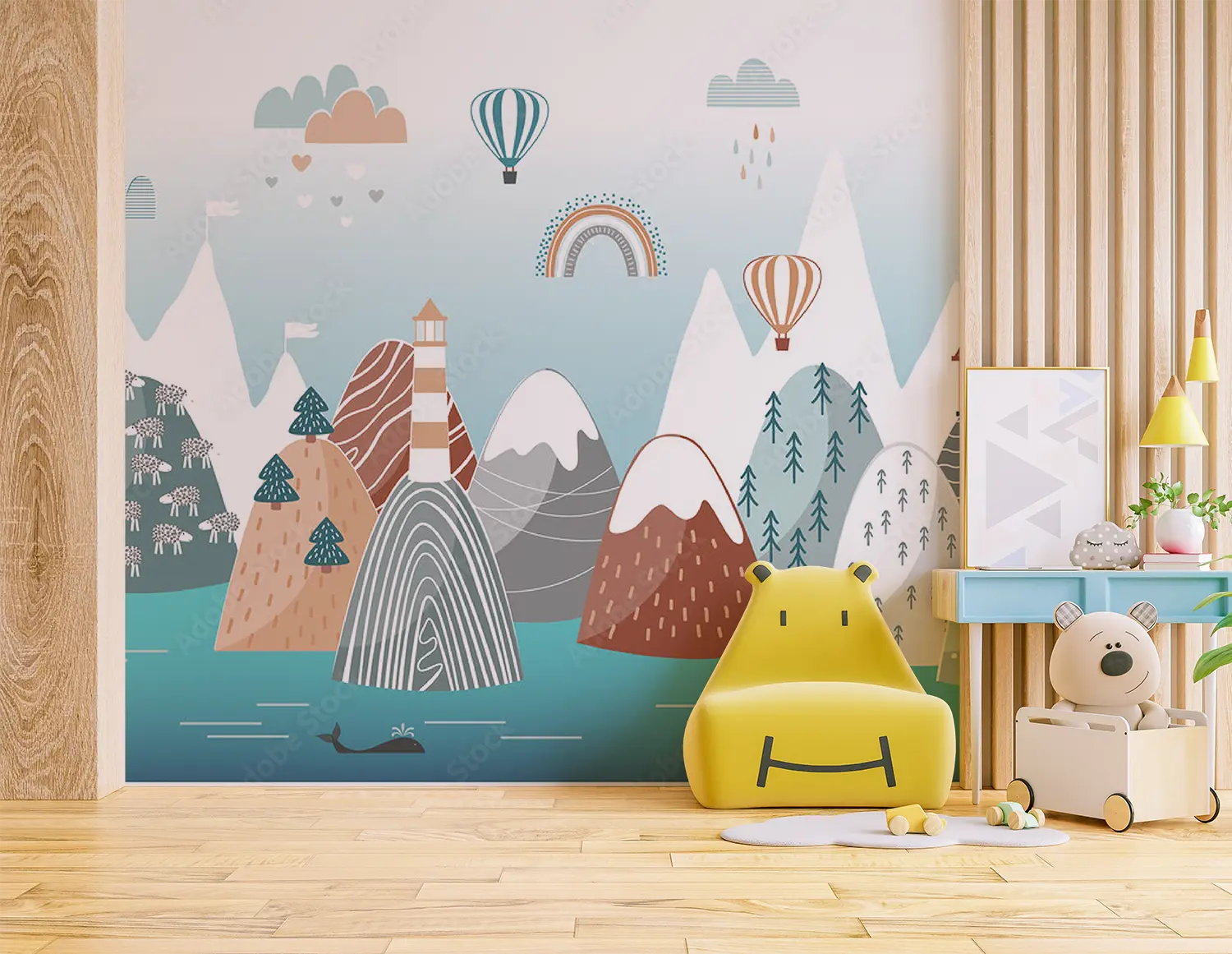 Transform your space with this enchanting wall art featuring a mountain landscape, lighthouse, whale, and rainbow. The vibrant colors and intricate details will add a touch of whimsy to your home decor. Complementary colors like teal, beige, and soft gray will enhance the aesthetic appeal of your living space, creating a serene and charming atmosphere.