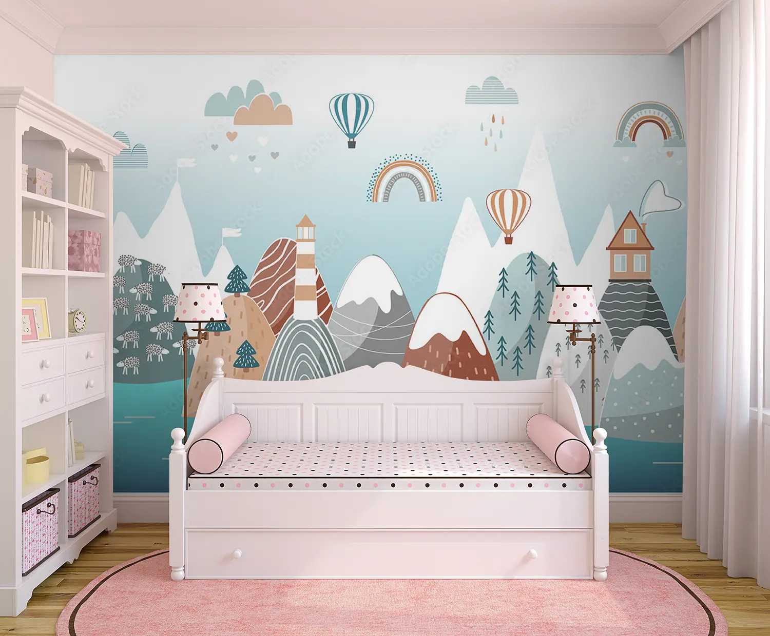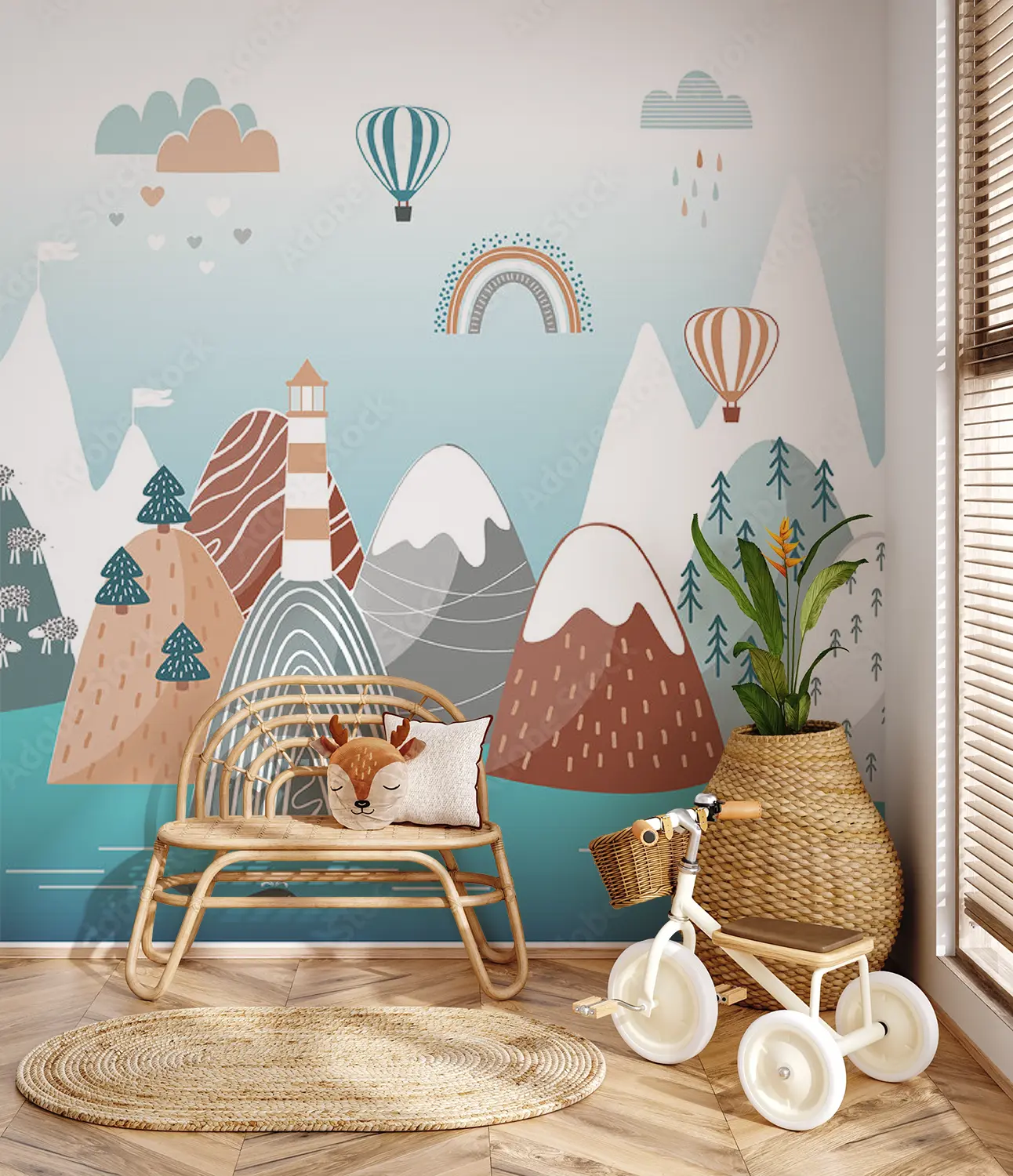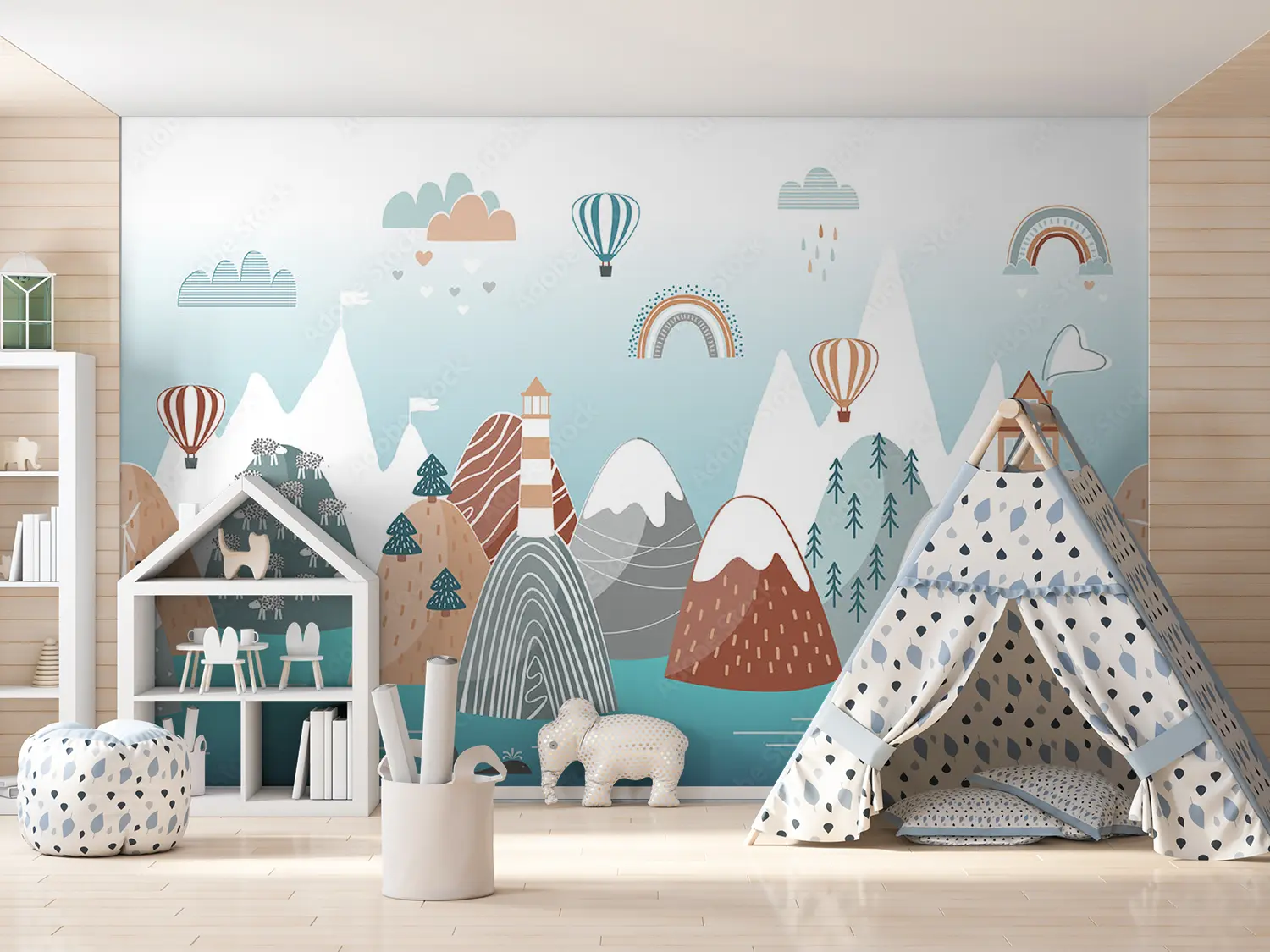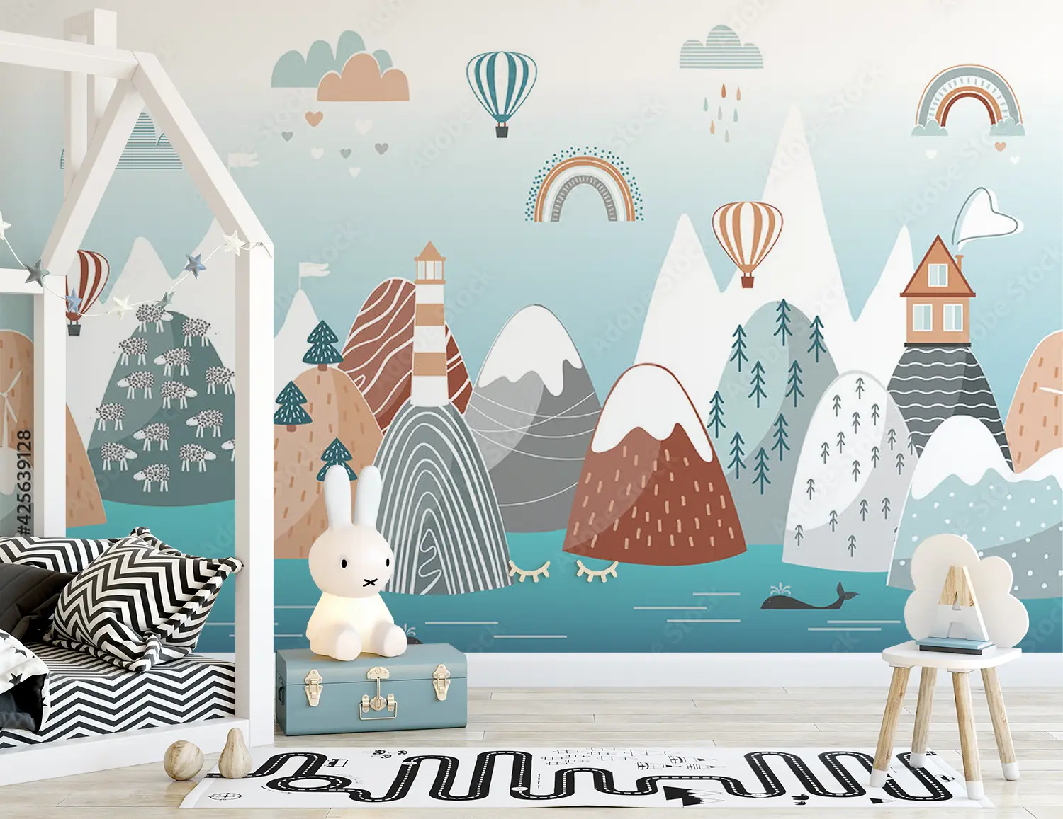Transform your space with this enchanting wall art featuring a mountain landscape, lighthouse, whale, and rainbow. The vibrant colors and intricate details will add a touch of whimsy to your home decor. Complementary colors like teal, beige, and soft gray will enhance the aesthetic appeal of your living space, creating a serene and charming atmosphere.