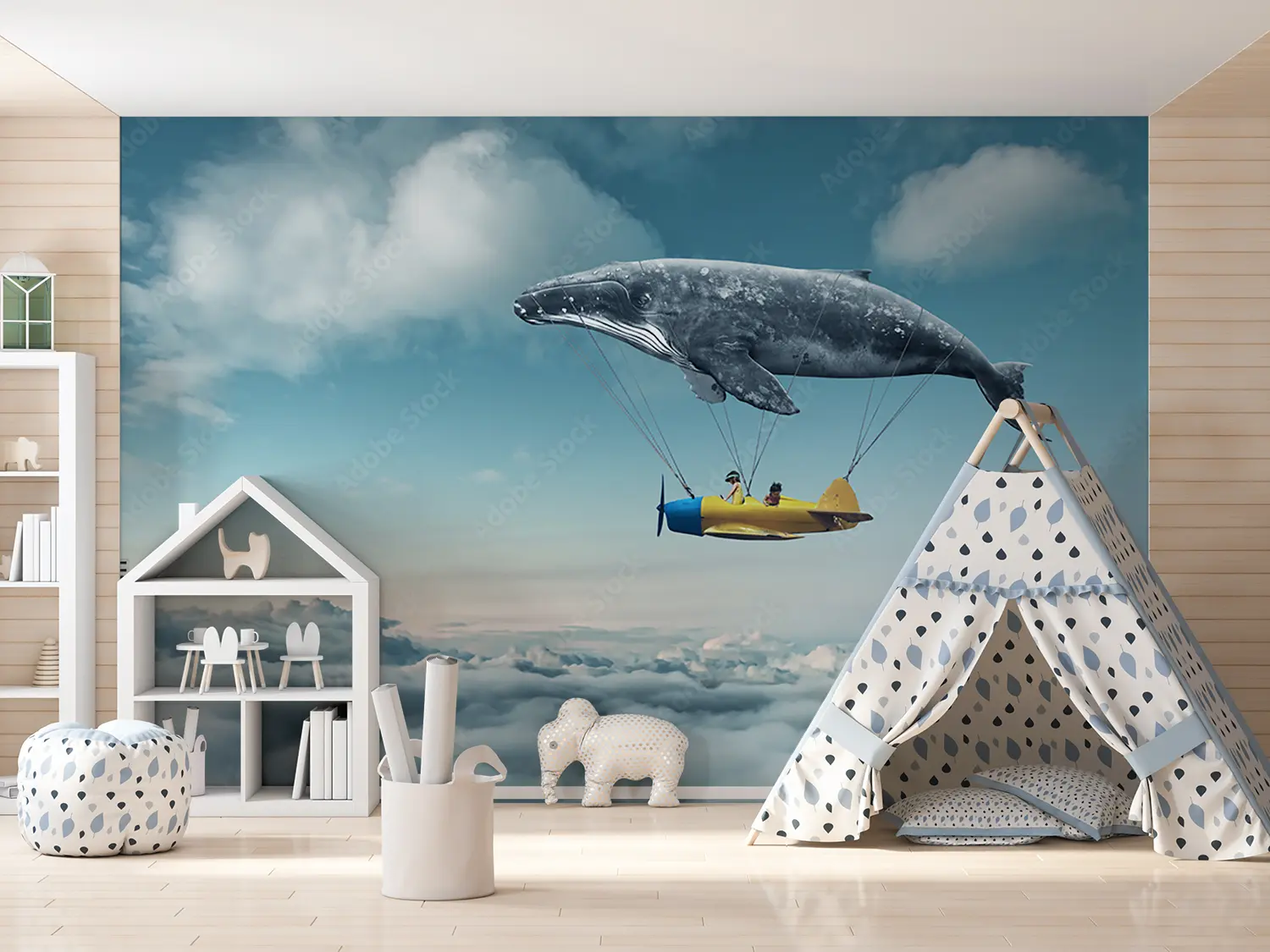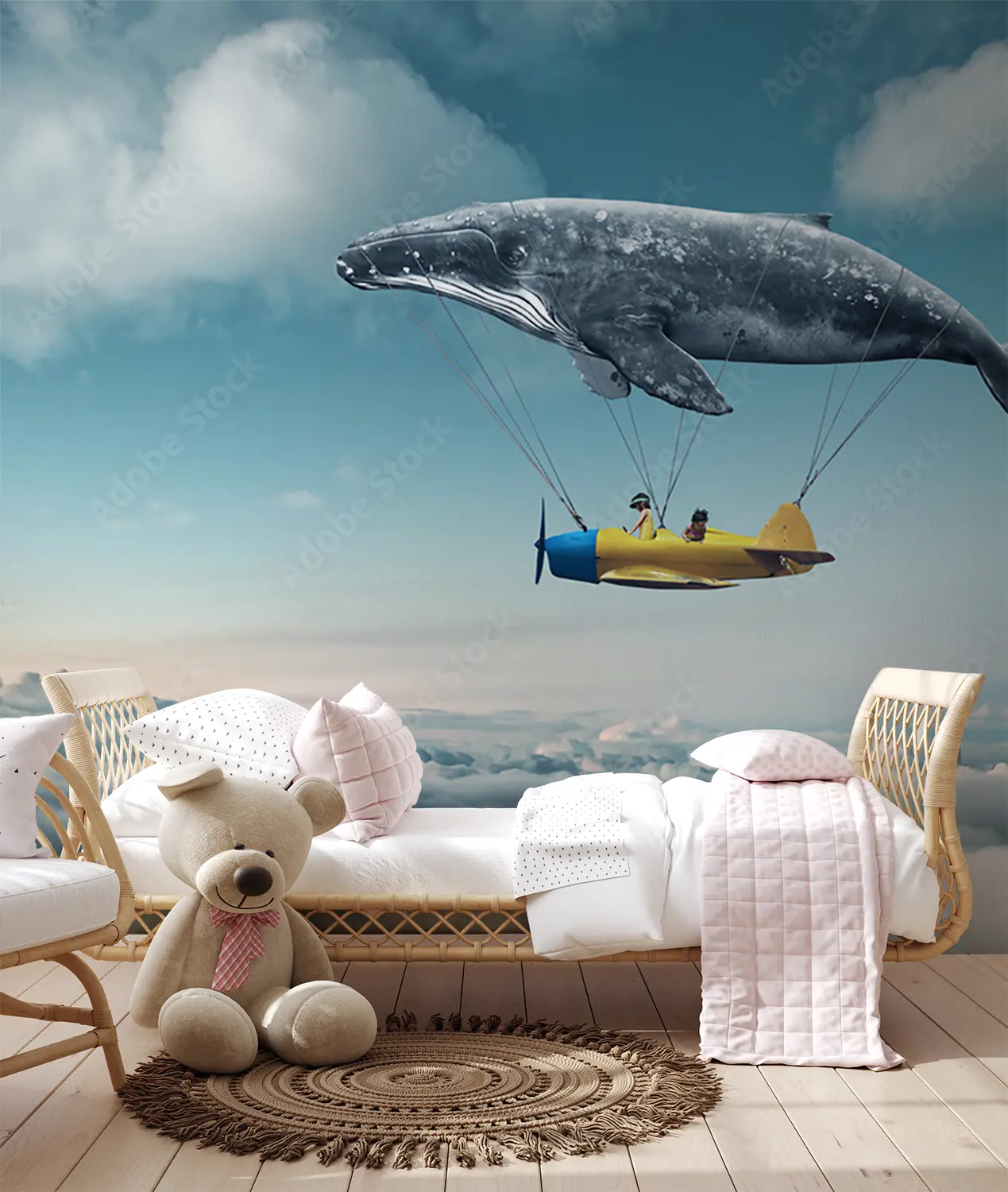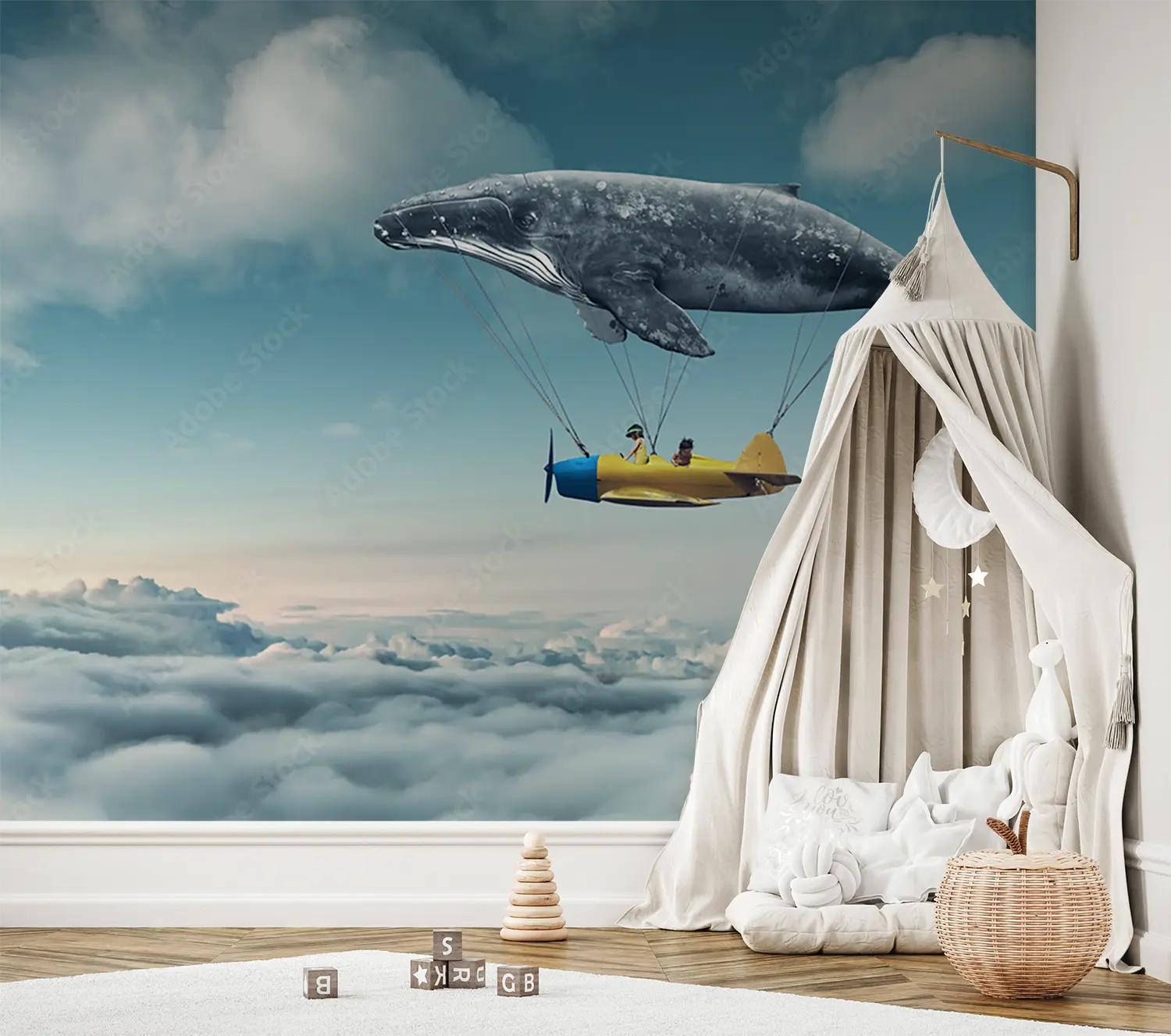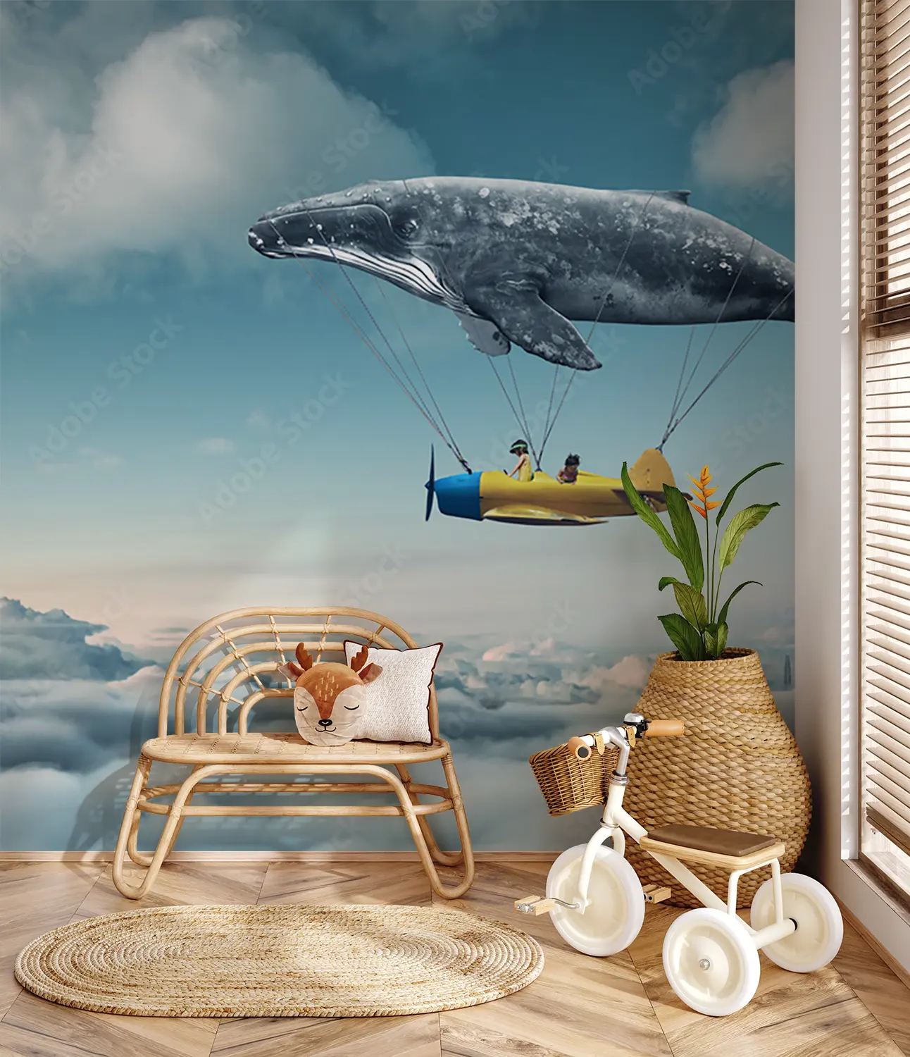 Transform your space with this enchanting wall art featuring a flying whale in the sky with a boat. The surreal image adds a touch of whimsy to any room, perfect for those who love unique and imaginative decor. Complementary colors include shades of blue, gray, and white to enhance the aesthetic appeal of your home.