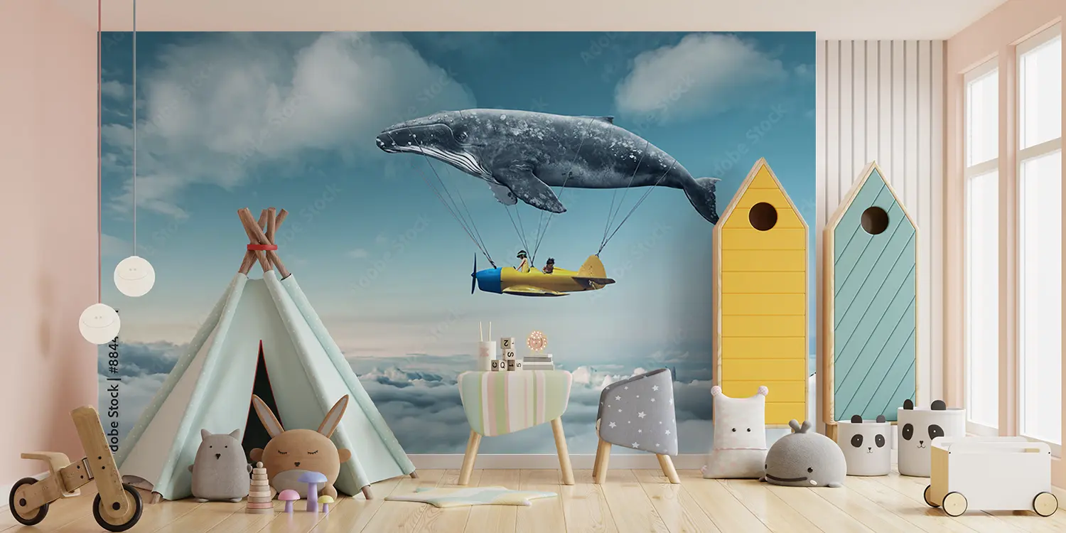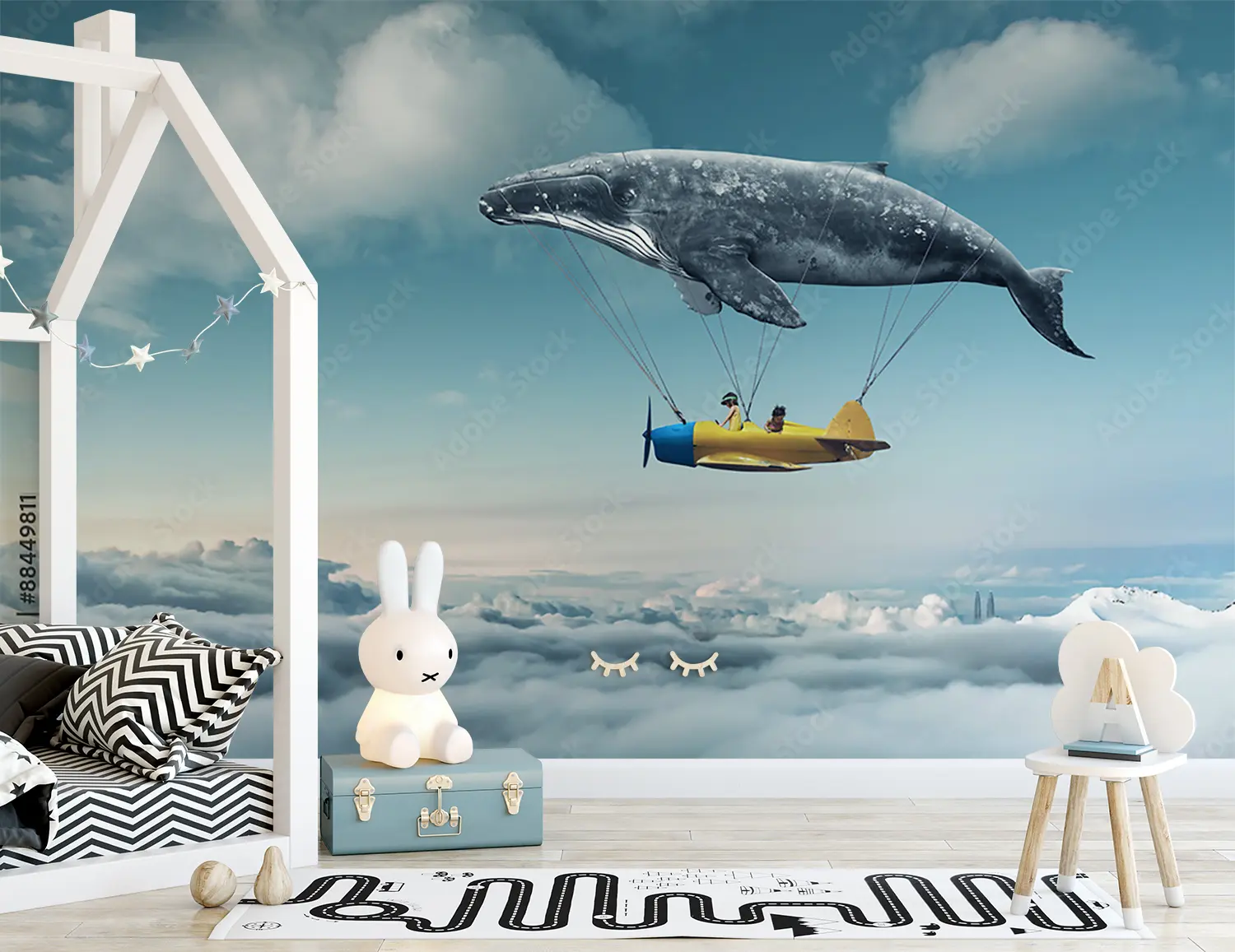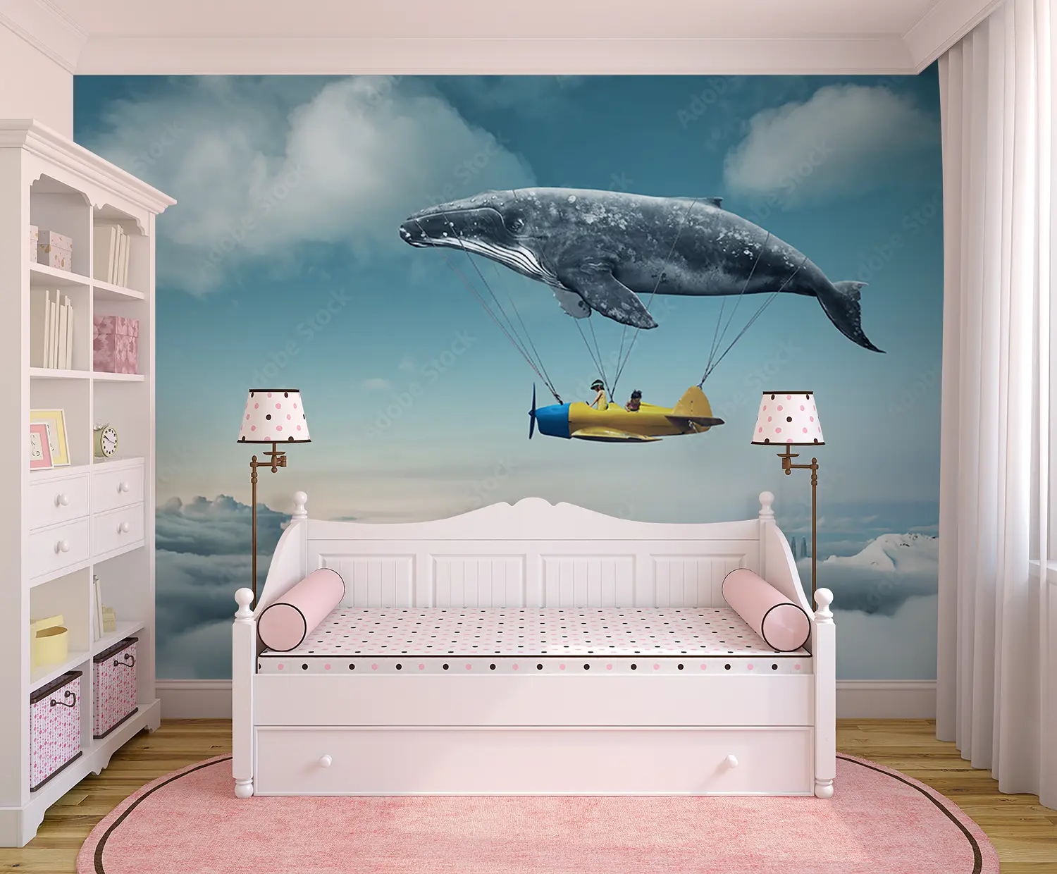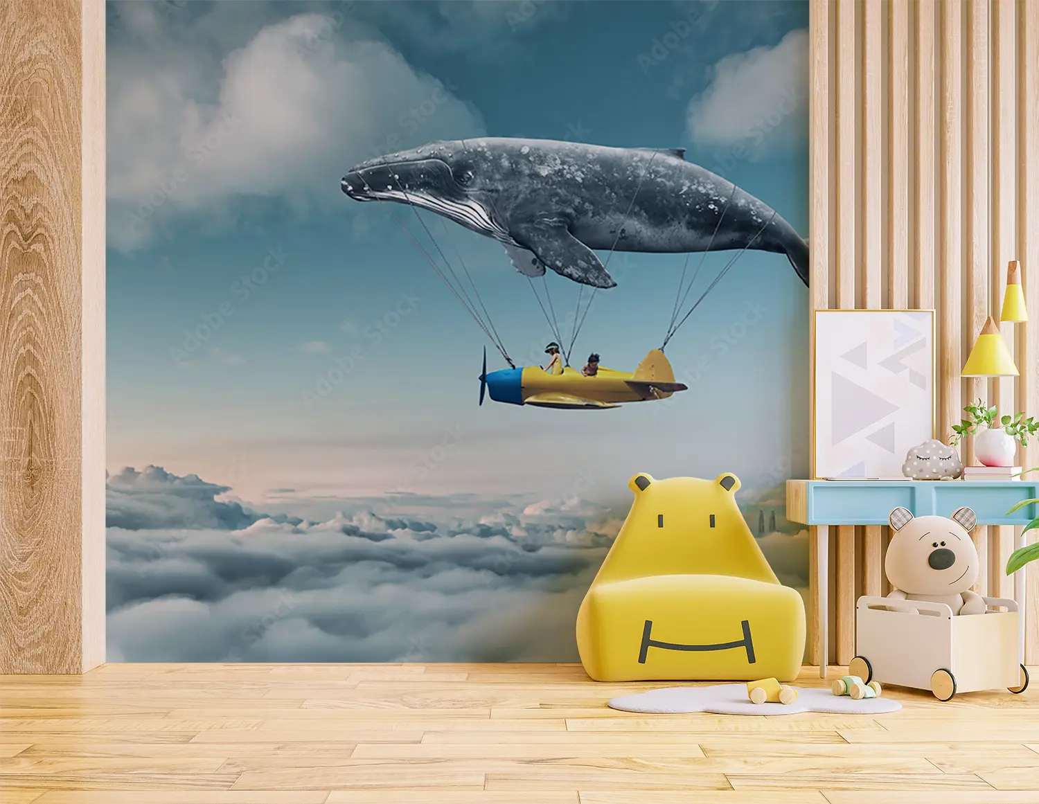 Transform your space with this enchanting wall art featuring a flying whale in the sky with a boat. The surreal image adds a touch of whimsy to any room, perfect for those who love unique and imaginative decor. Complementary colors include shades of blue, gray, and white to enhance the aesthetic appeal of your home.