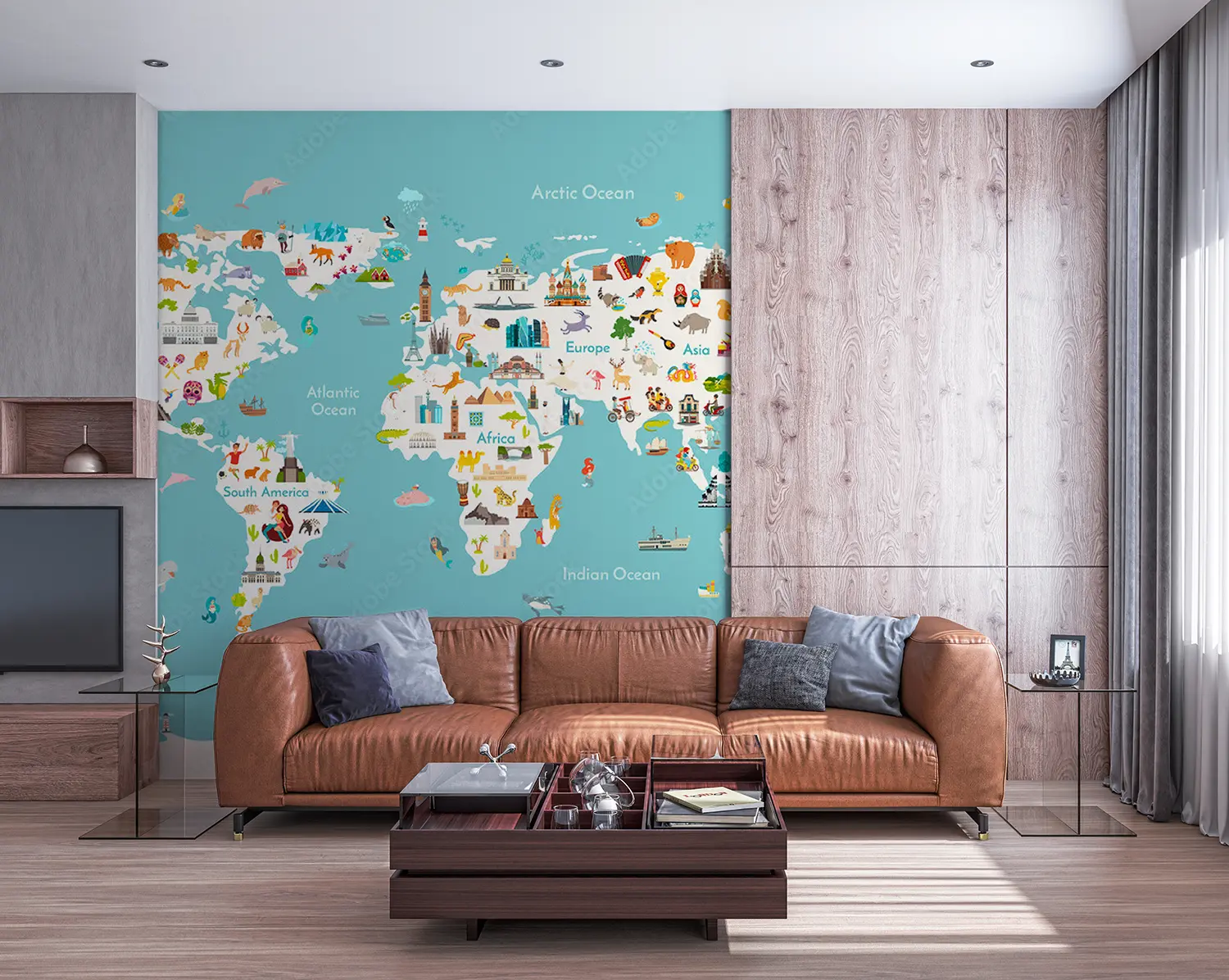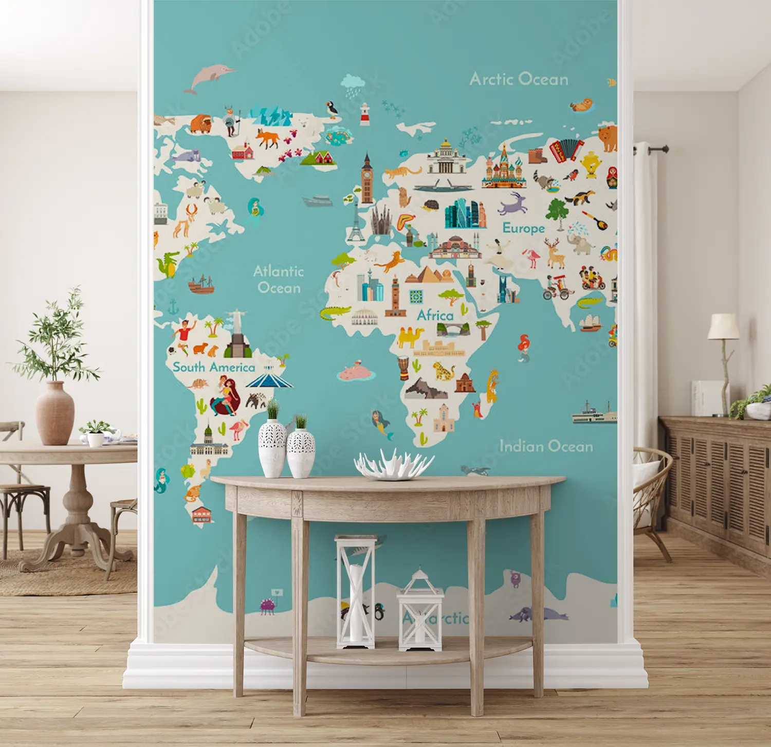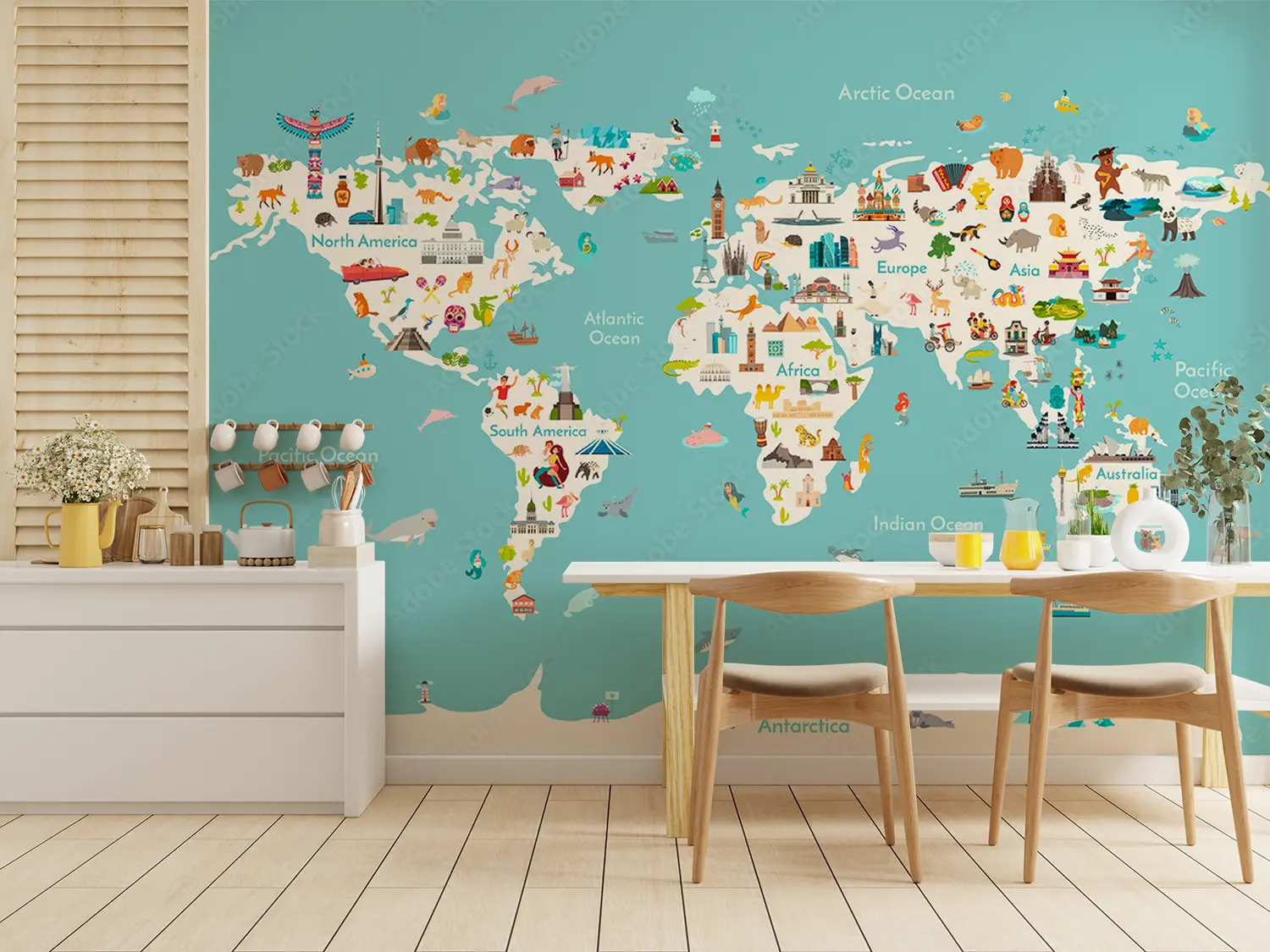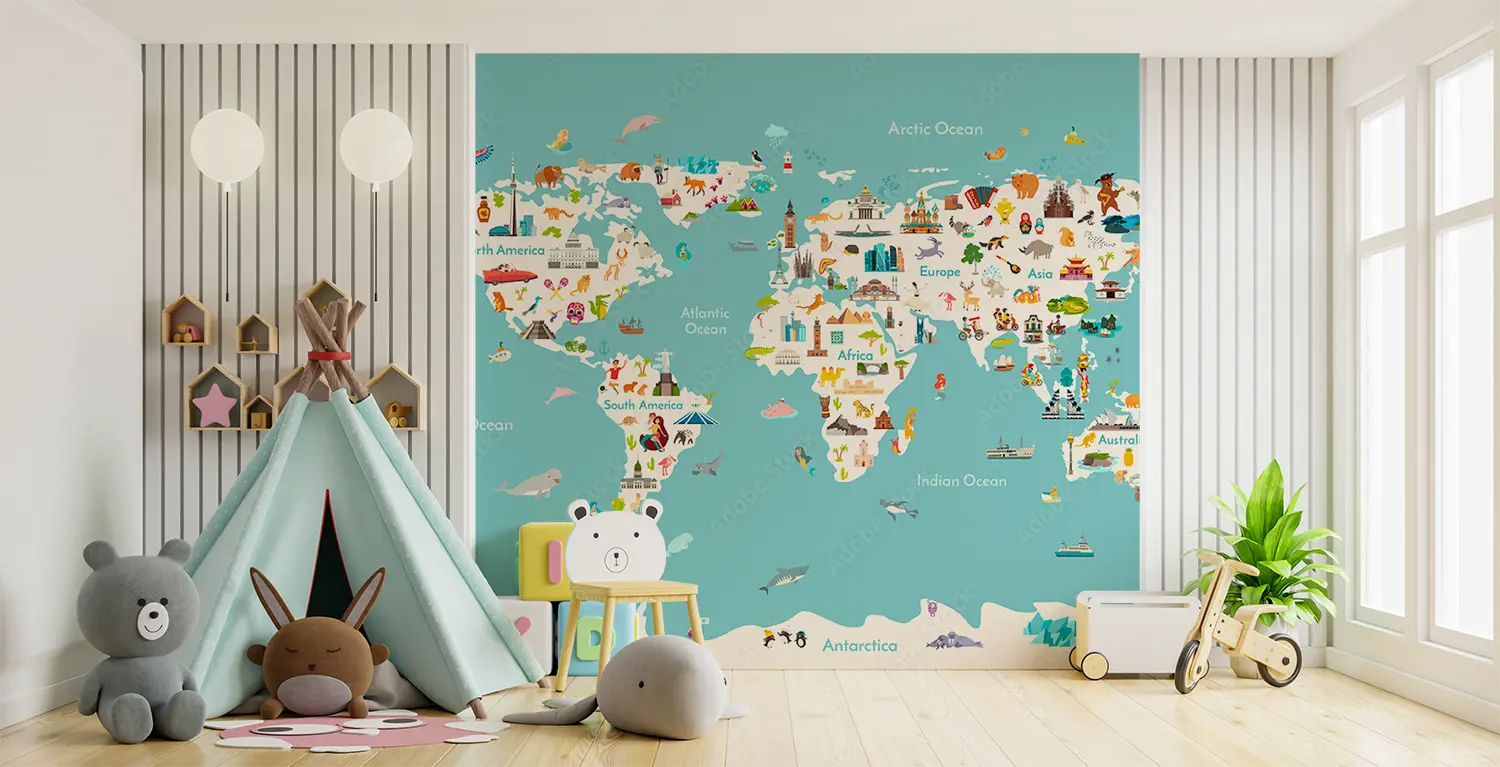 Adorn your walls with a captivating world map showcasing all countries in stunning detail. This eye-catching illustration will add a touch of sophistication to your home decor, inviting wanderlust and cultural intrigue. Complementary colors like soft teal, sandy beige, and earthy brown will enhance the mural's aesthetic appeal, creating a harmonious atmosphere in any room.
