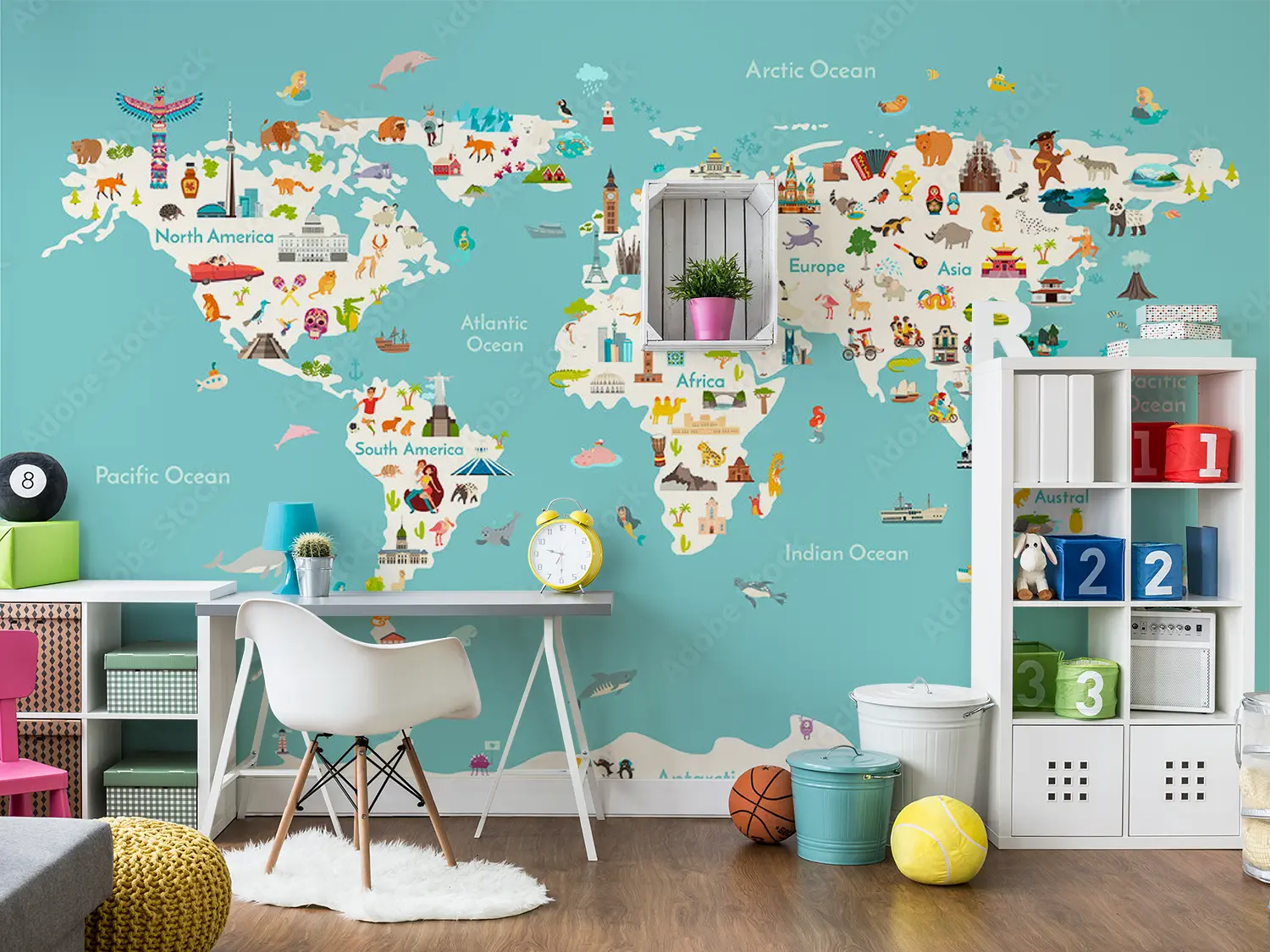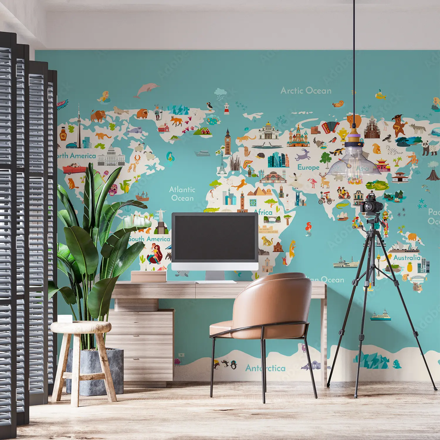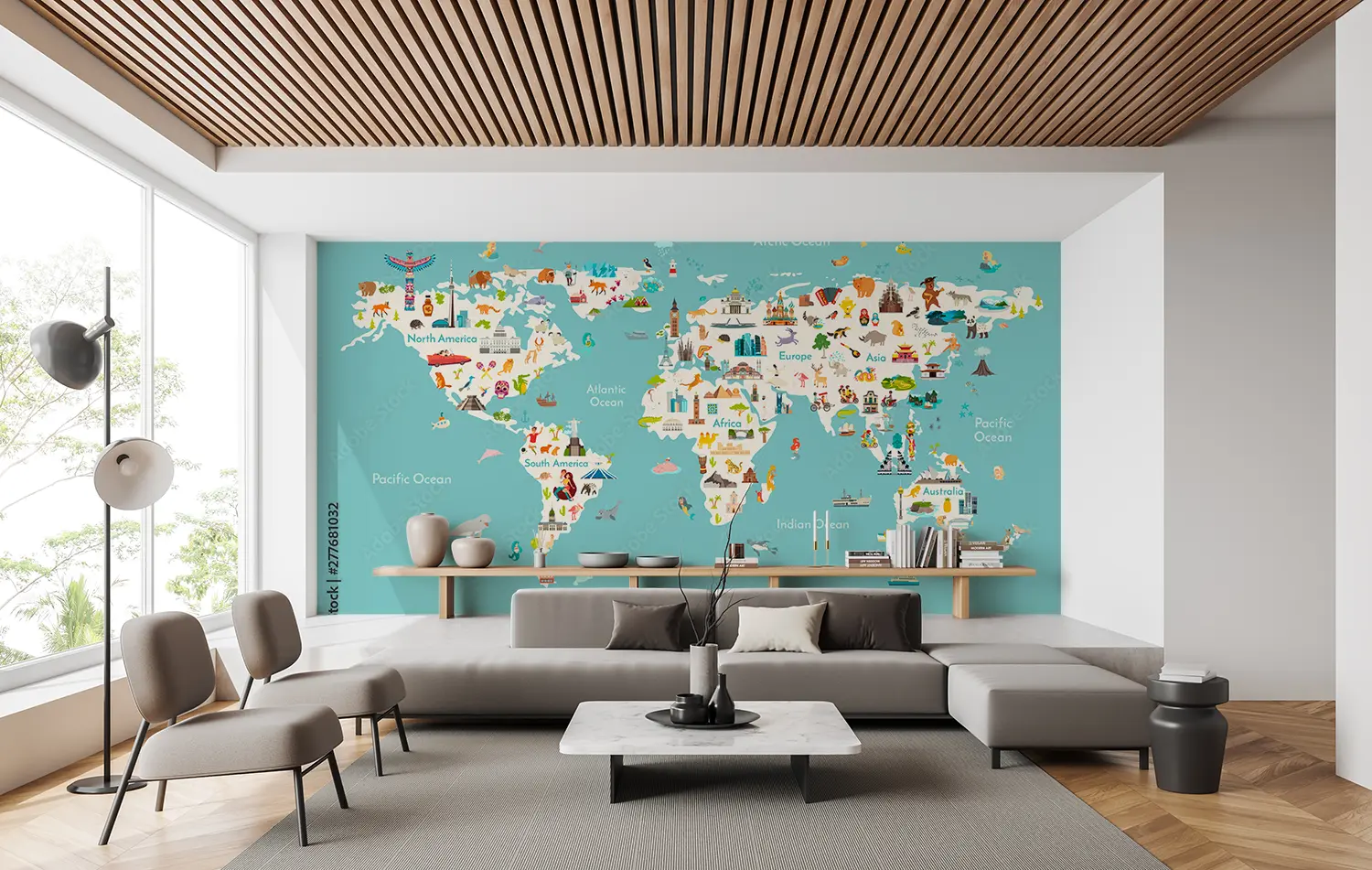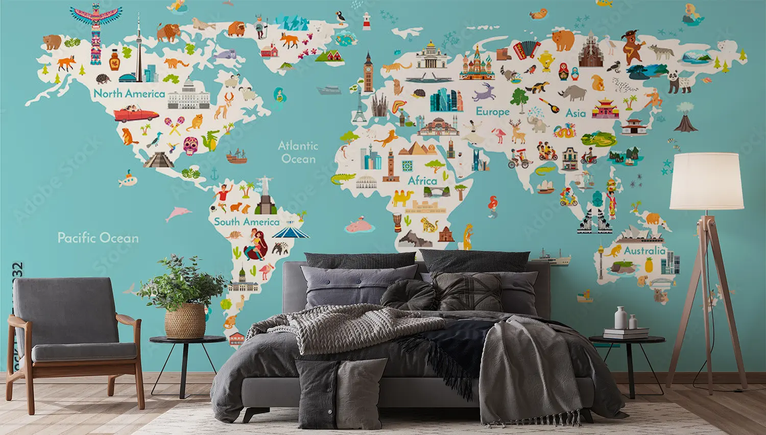 Adorn your walls with a captivating world map showcasing all countries in stunning detail. This eye-catching illustration will add a touch of sophistication to your home decor, inviting wanderlust and cultural intrigue. Complementary colors like soft teal, sandy beige, and earthy brown will enhance the mural's aesthetic appeal, creating a harmonious atmosphere in any room.